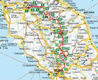 Florenz bis nach Rom. Die Route zeichnet die Wege des Heiligen durch Mittelitalien nach. Man beschreitet historische Routen, die auch Franz von Assisi einst benutzt hat, und trifft auf Orte, an denen der Heilige gelebt und gewirkt hat. Manche Wegführungen werden in diesem Wanderführer erstmalig beschrieben. Es geht durch das Casentino zum berühmten Felsenkloster La Verna, nach Gubbio und Assisi und weiter durch das Spoletotal zu den Franziskus-Klöstern bei Rieti, zu stillen Einsiedeleien, malerischen Klöstern und durch viel unberührte Natur. Über das hügelige Sabinerland erreicht man schließlich die Ewige Stadt: Rom.