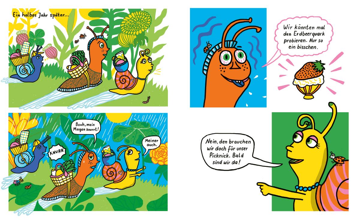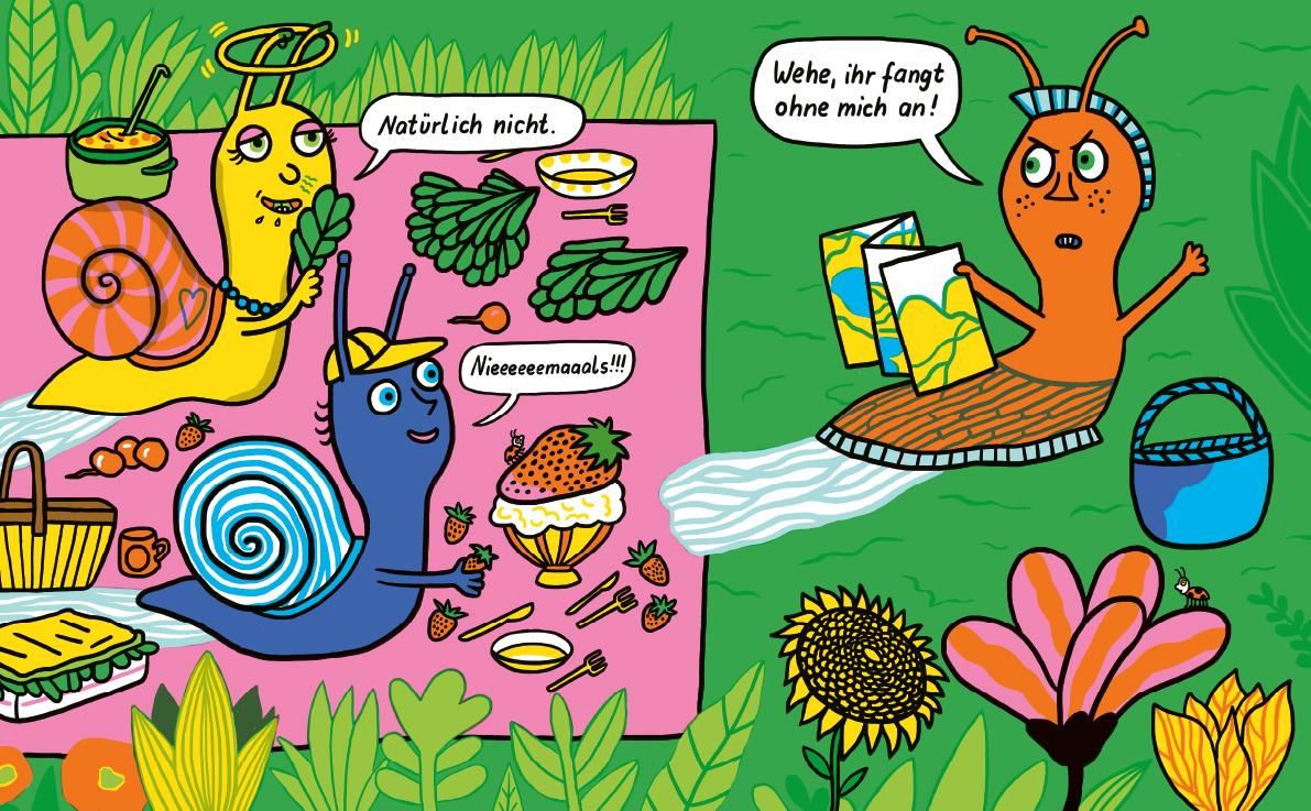Drei Schnecken - Otto, Anna und Izzy - planen ein Picknick. Im Schneckentempo packen sie tausend Leckereien in ihre Körbe und machen sich auf den Weg. Ein halbes Jahr ist vergangen: Die drei sind noch unterwegs, ihre Mägen knurren laut. Doch gegessen wird erst am Ziel, da sind sie streng. Noch zwei halbe Jahre später: Die Schnecken sind am Ende ihrer Kräfte. Aber dann sind sie ENDLICH da. Oh nein, sie haben die Kleeblatt-Schorle vergessen! Es hilft nichts, Otto muss zurück, er ist der Stärkste: "Wehe, ihr fangt ohne mich an!" Ob Anna und Izzy das durchhalten? Die Schneckengeschichte von Jörg Bernardy und Katja Spitzer ist bunt, dramatisch, komisch - und wunderbar hintersinnig! Wer will, kann mit Kindern ins Philosophieren kommen: über Vertrauen und Misstrauen, über den Sinn und Unsinn von Prinzipien und über Zeit, die im Schneckentempo vergeht.