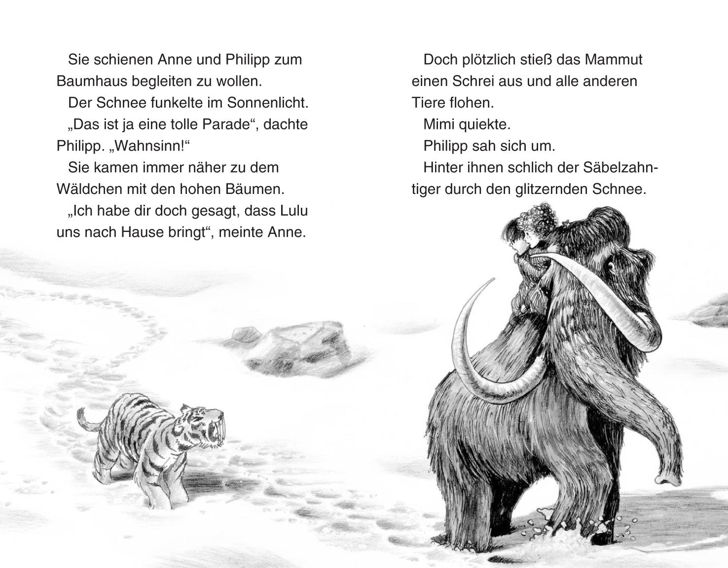 Eisiger Wind schlägt Philipp und Anne entgegen, als das magische Baumhaus zum Stillstand kommt. Wo sind sie nur diesmal gelandet? Um sie herum ist nichts als Schnee, Eis und karge Felsen. Doch dann entdecken die beiden eine geheimnisvolle Höhle. Was bedeuten die seltsamen Zeichnungen an der Wand? Philip und Anne folgen der Spur, und plötzlich sind sie mitten in einem spannenden Abenteuer im Reich der Mammuts. Komm mit auf die Reise im magischen Baumhaus! Rätselhafte Abenteuer in fremden Welten und längst vergangenen Zeiten erwarten dich auch in den anderen Bänden.Die beliebte Kinderbuch-Reihe von Bestsellerautorin Mary Pope Osborne! Die Geschwister Anne und Philipp reisen mit dem magischen Baumhaus durch die Zeit. Sie erleben spannende Abenteuer, entdecken ferne Länder und lernen viele berühmte Persönlichkeiten kennen.Mehr Infos zur Reihe und tolle Extras unter:
