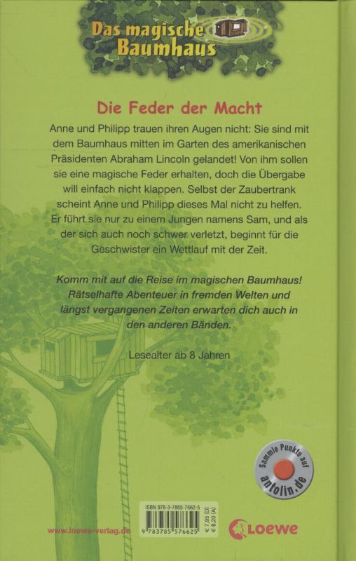 Anne und Philipp trauen ihren Augen nicht: Sie sind mit dem Baumhaus mitten im Garten des amerikanischen Präsidenten Abraham Lincoln gelandet! Von ihm sollen sie eine magische Feder erhalten, doch die Übergabe will einfach nicht klappen. Selbst der Zaubertrank scheint Anne und Philipp dieses Mal nicht zu helfen. Er führt sie nur zu einem Jungen namens Sam, und als der sich auch noch schwer verletzt, beginnt für die Geschwister ein Wettlauf mit der Zeit.Komm mit auf die Reise im magischen Baumhaus! Rätselhafte Abenteuer in fremden Welten und längst vergangenen Zeiten erwarten dich auch in den anderen Bänden.Die beliebte Kinderbuch-Reihe von Bestsellerautorin Mary Pope Osborne! Die Geschwister Anne und Philipp reisen mit dem magischen Baumhaus durch die Zeit. Sie erleben spannende Abenteuer, entdecken ferne Länder und lernen viele berühmte Persönlichkeiten kennen.