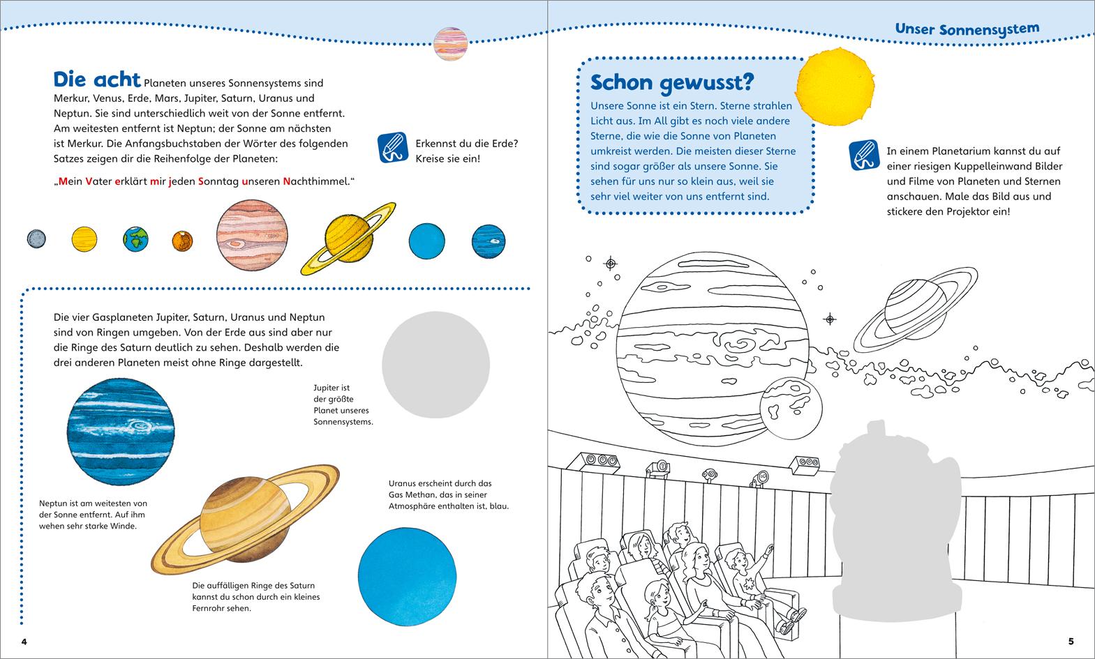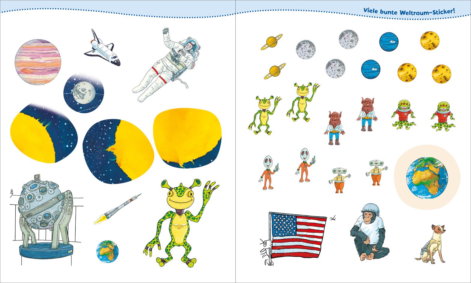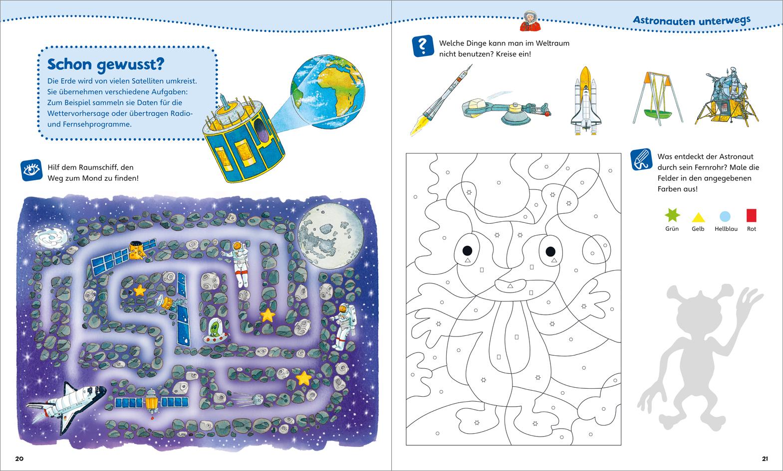 Hallo Astronaut! Komm mit auf eine Reise in den Weltraum, zeichne Außerirdische und hilf dem Raumschiff, den Weg zum Mond zu finden. Ein bunter Mix aus tollen Ausmalbildern, spannenden Rätseln und Spielideen mit lustiger Erstlesegeschichte und wiederablösbaren Stickern lädt zum Mitmachen und Entdecken ein. Schon gewusst? Die Schwerkraft des Mondes ist schwächer als die der Erde. Deshalb hat ein Astronaut dort nur ein Sechstel seines Gewichts und kann mühelos große Sprünge machen.