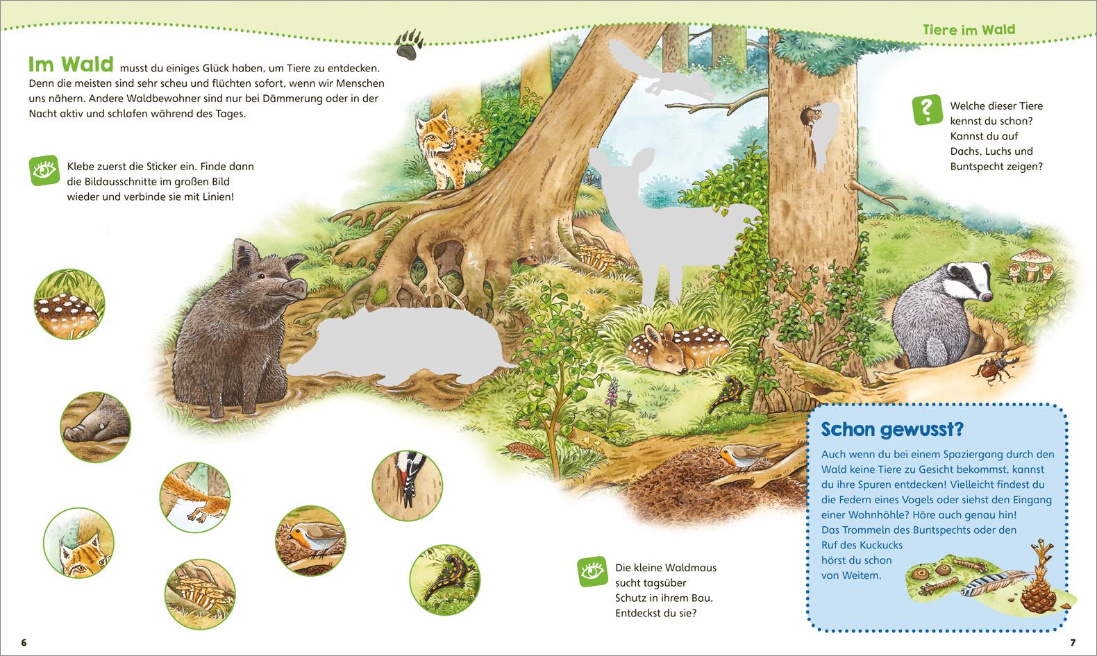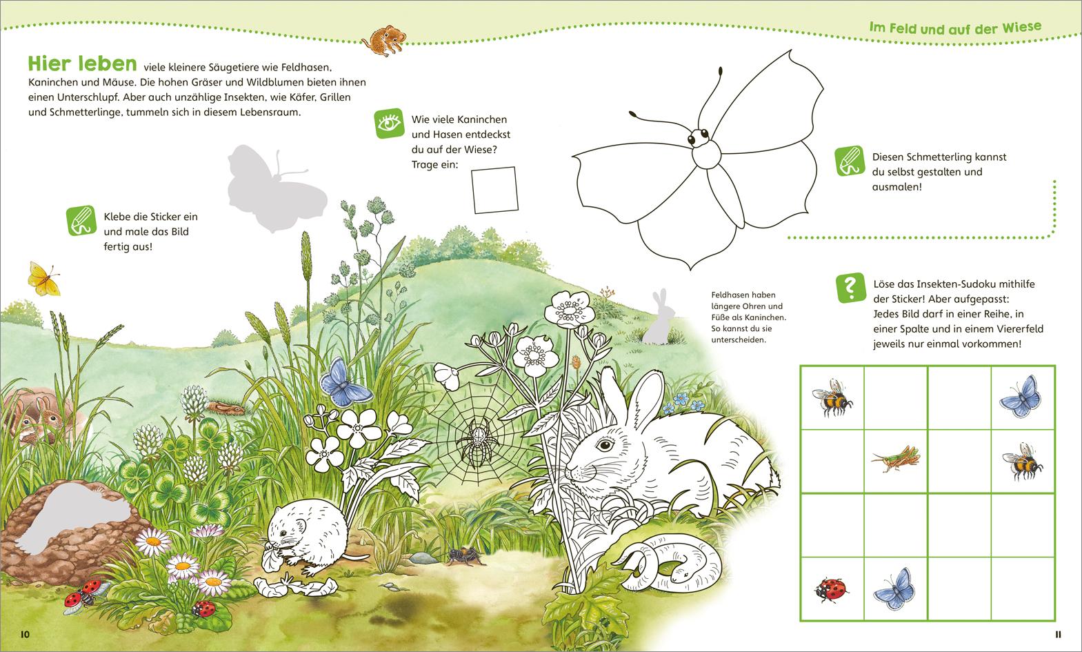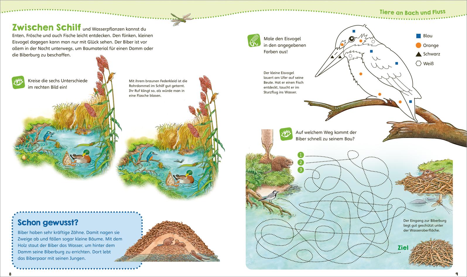 Was ist der Unterschied zwischen Bienen, Hummeln und Wespen? Welche Vögel leben in unseren Gärten? Wie wird aus der Kaulquappe ein Frosch? Ob auf der Wiese, am Bach oder im Wald, ob an Küste oder im Gebirge - es gibt allerhand zu entdecken. Wie kommt der Maulwurf zur Vorratskammer? Welche Tiere haben im Schnee ihre Spuren hinterlassen? Wo steckt der Wattwurm? Mit abwechslungsreichen Rätseln, bunten Stickern und niedlichen Ausmalbildern erkunden Kinder die Lebensräume der heimischen Tiere. Kreativer Entdeckerspaß für Kinder ab 5 Jahren.
