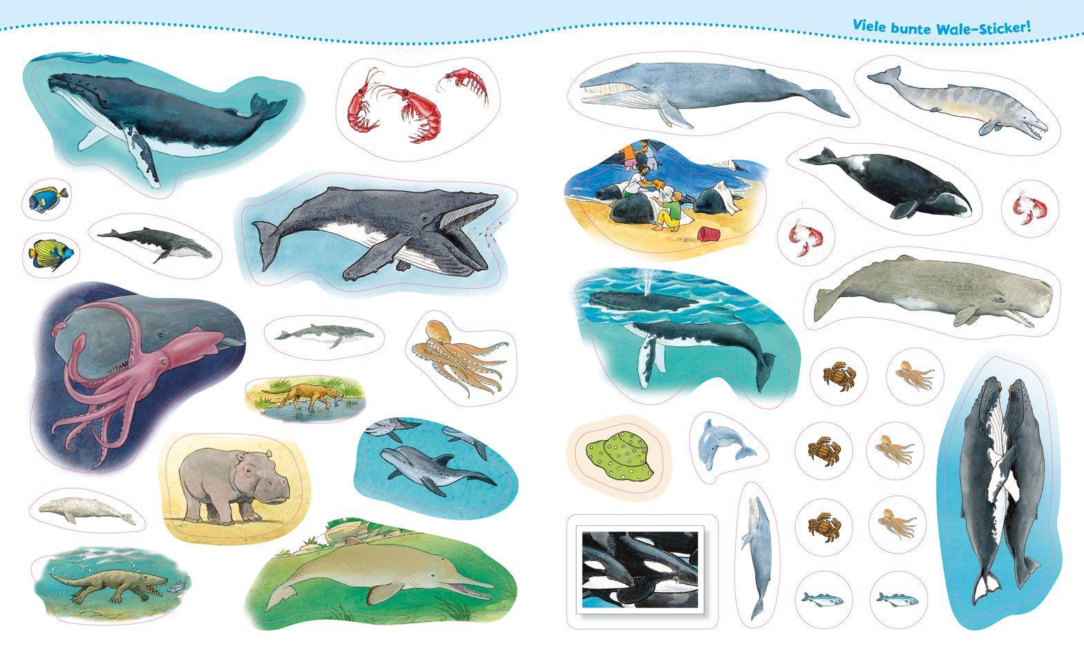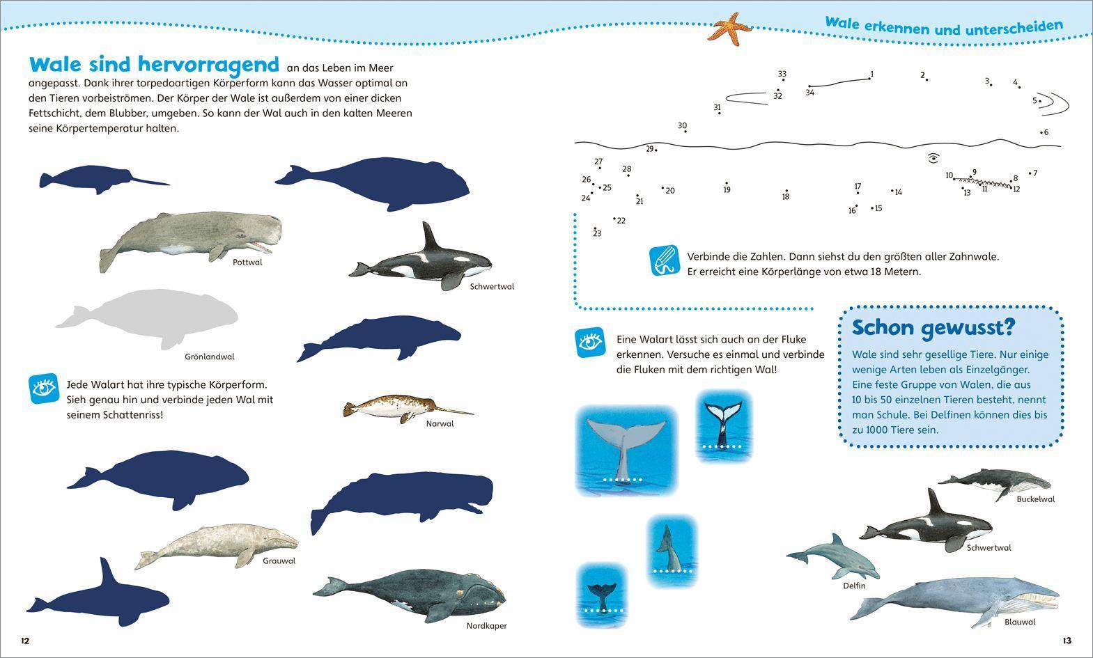 Wie viel wiegt ein Blauwal? Wer ist der Sänger unter den Walen? Und warum sind Delfine so beliebt? Neben Antworten auf diese und andere Fragen rund um die eindrucksvollen Meerestiere finden Kinder ab 4 Jahren zahlreiche Rätsel und Knobelaufgaben. So müssen sie der kleinen Robbe auf der Flucht vor den gefährlichen Orcas den Weg durch das Eislabyrinth weisen, die Schattenrisse den richtigen Walarten zuordnen oder den Pottwal von Punkt zu Punkt verbinden. Abgerundet wird das abwechslungsreiche Beschäftigungsheft durch zahlreiche bunte Sticker von Grönlandwal, Flussdelfin oder Riesenkrake sowie einem großen Unterwasser-Ausmalbild. Eine Erstlesegeschichte am Ende erzählt von einer ganz besonderen Begegnung während eines Bootsauflugs.