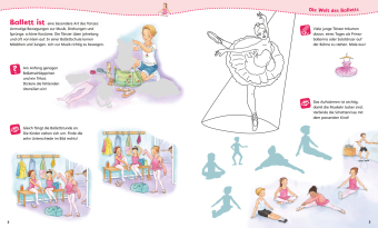 Wie bindet man Spitzenschuhe richtig? Welche Fußstellung gehört zu welcher Grundposition? Und in welchen Farben soll das Kostüm der Primaballerina erstrahlen? Ob während einer Ballettstunde oder hinter den Kulissen eines Opernhauses - die spannenden Rätsel und detaillierten Malvorlagen in diesem Mitmach-Heft laden Kinder ab 4 Jahren dazu ein, selbst aktiv zu werden und in die wunderbare Welt des Balletts einzutauchen. Die vielfältigen Aufgaben reichen vom korrekten Stickern der Tanzutensilien über die Zuordnung von Gefühlsausdrücken bis hin zum Schminken der Tänzer. Mit den bunten Aufklebern in der Heftmitte können die Kinder die einzelnen Ballettszenen auf den Seiten verschönern oder damit beispielsweise Freundebücher oder Gegenstände verzieren. Ein schönes Mitbringsel für Ballerinas und Tänzer!