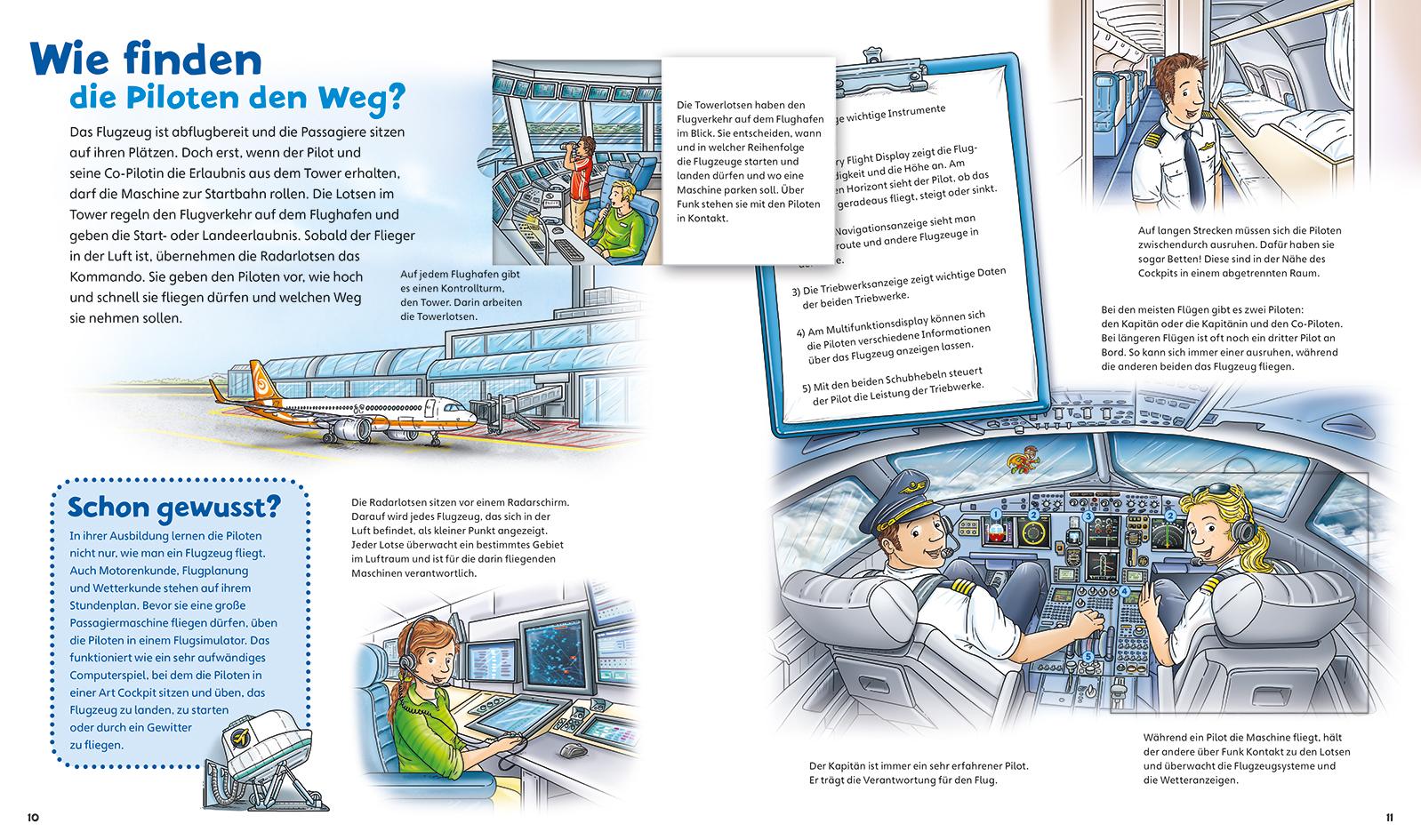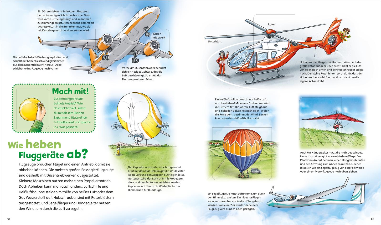 Wo melden sich Reisende für ihren Flug an? Was passiert mit den Koffern? Warum hebt ein tonnenschweres Flugzeug scheinbar mühelos vom Boden ab? Und können auch Pferde im Flugzeug reisen? In kurzen Sachtexten und anhand von detaillierten Abbildungen erhalten Kinder ab 4 Jahren erstaunliche Einblicke in die Abläufe eines Flughafens sowie die Hintergründe und Zusammenhänge einer Flugreise. Neben Frachtflugzeugen, Passagiermaschinen und anderen Fluggeräten lernen sie mit Nurflüglern, Hybrid- und Solarflugzeugen auch umweltfreundliche Luftfahrzeuge der Zukunft kennen. Interessante Informationen mit Aha-Effekt, etwa zu Flughafenkürzeln oder den Aufgaben eines Bird-Controllers, fordern zur Erforschung des Flughafens auf und liefern überraschende Fakten. Die zahlreichen Klappen machen Verborgenes sichtbar und zeigen Passagiere bei der Kontrolle mit dem Sicherheitsscanner, Piloten beim Check im Cockpit oder Fluglotsen beim Einweisen eines Flugzeugs am Boden. Ready for take off?