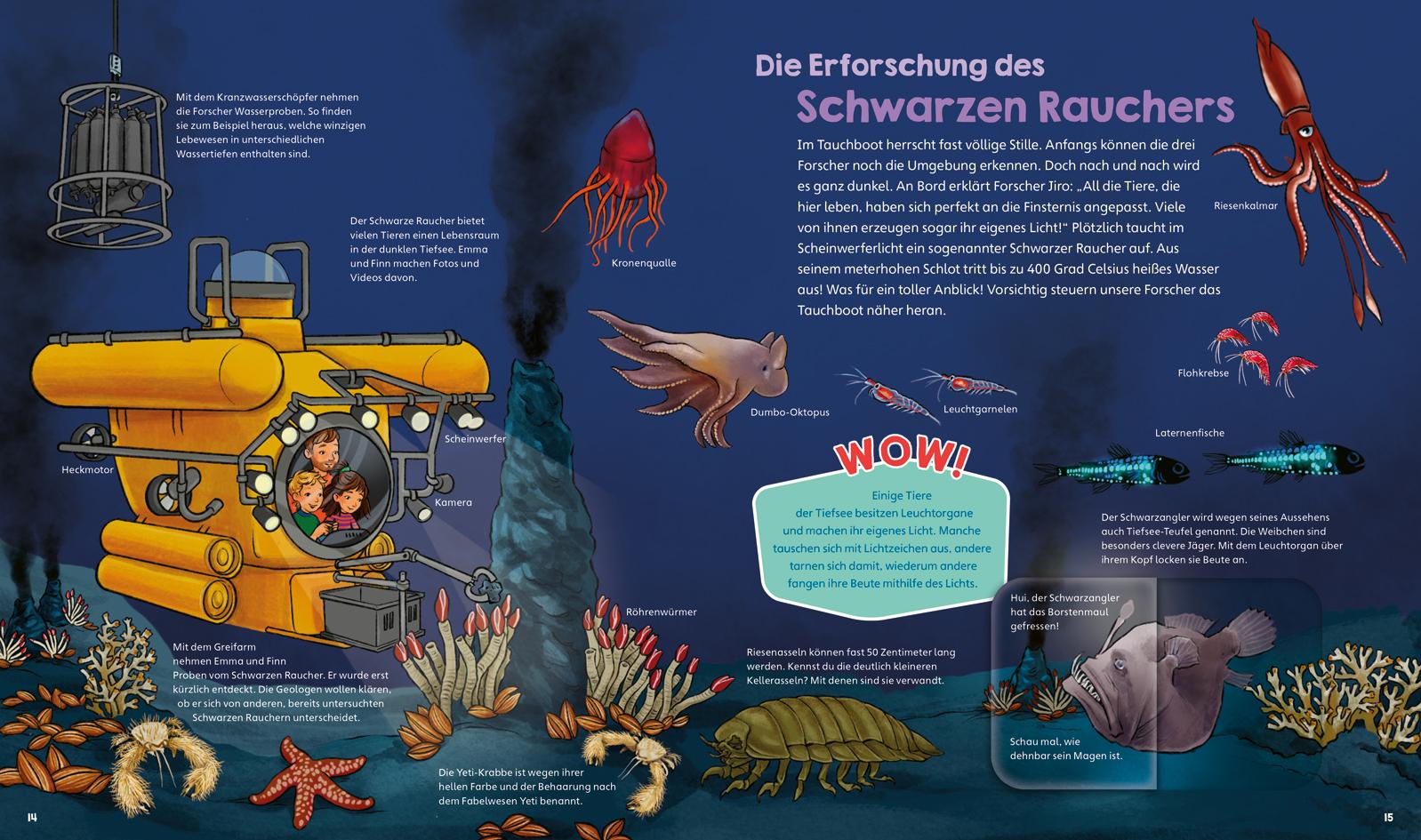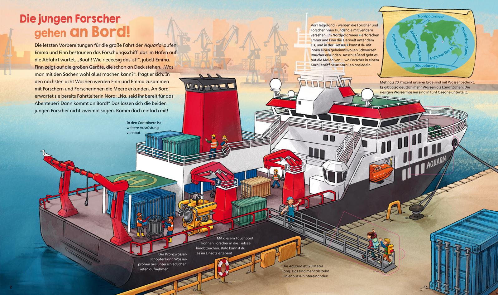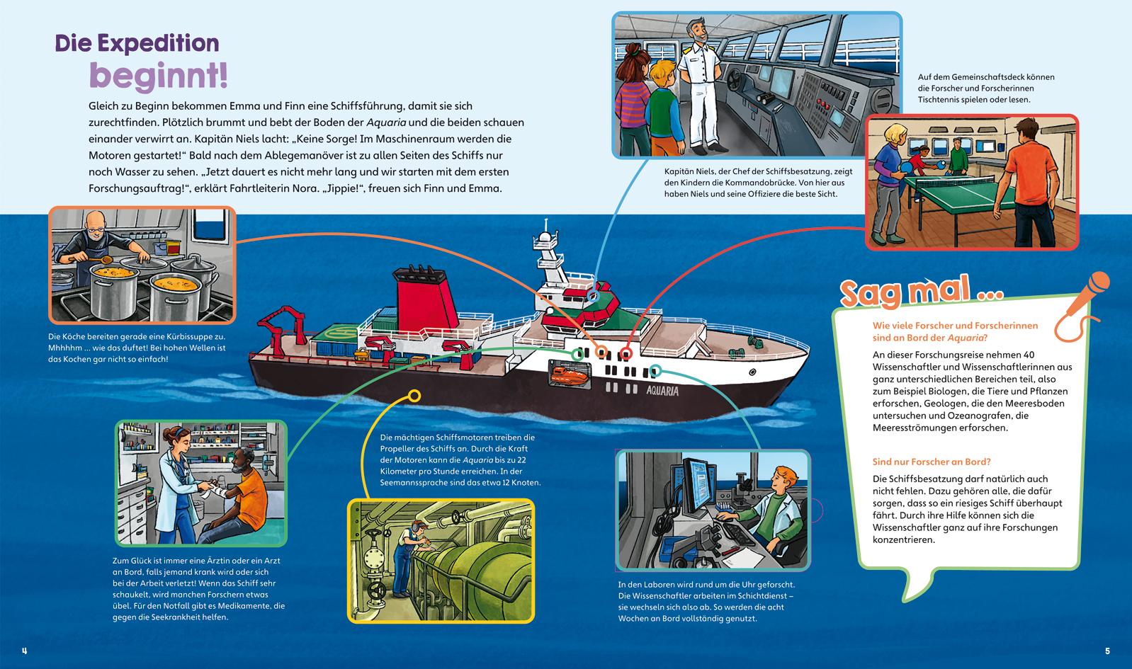 Ganz schön was los im Meer! Was genau? Das erforschen Finn und Emma an Bord des Forschungsschiffes Aquaria. Von Bremerhaven aus geht es in die Nordsee, ins Polarmeer, in den Atlantik und den Indischen Ozean. Überall gibt es wichtige Forschungsarbeit zu leisten: Wanderrouten der Haie erkunden, Tiere im Nordpolarmeer zählen, Korallen in Riffen anzüchten und Proben in der Tiefsee nehmen. Wieder zuhause müssen alle Ergebnisse ausgewertet werden. Welche Folgen hat der Klimawandel für die Ozeane und wie können wir sie schützen? Finn und Emma haben sicher viele Antworten und tolle Eindrücke mitgebracht. Ein spannendes Buch mit viel Sachwissen für Kinder ab 5 Jahren.