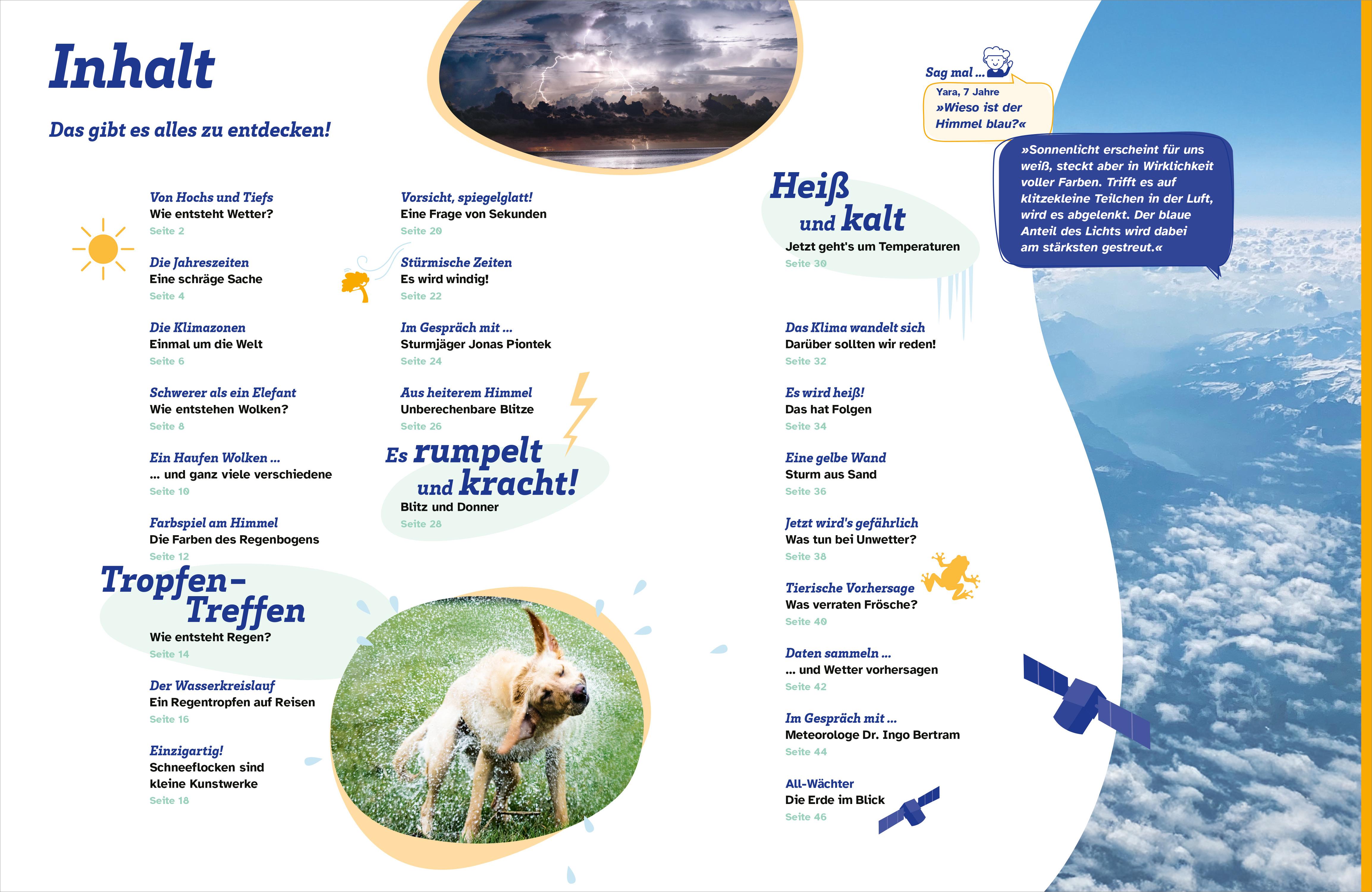 Springen wir heute durch Pfützen und packen den Regenschirm ein? Verbringen wir den Tag am Badesee? Bekommen wir weiße Weihnachten? Das Wetter umgibt uns immer. Es bestimmt unsere Kleidung und auch unsere Aktivitäten. Aber wie entsteht Wetter? Wie fühlt es sich an, durch Wolken zu laufen? Woher kommt der Geruch des Regens und wie heiß ist eigentlich ein Blitz? Gemeinsam mit Wetterexpertin Silke Hansen entdecken wir die großen und kleinen Wetterwunder. Eine Wolke kann beispielsweise so viel wiegen wie eine Elefantenherde und bei Regen lernt man leichter als bei Sonnenschein. Mit AHA-Momenten aus dem Alltag der Kinder wird auch aus dem unangenehmsten Wetter ein spannendes Abenteuer mit viel Wissen rund um Schnee, Hagel, Sonnenschein, Wind und vielem mehr. Ein Sachbuch auch mit aktuellen Infos zu Extremwetter und Klimawandel für Kinder ab 8 Jahren.