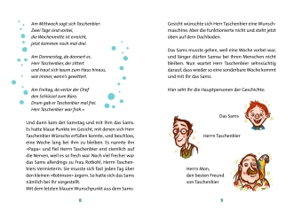 Herr Taschenbier tut alles, damit das Sams zu ihm zurückkommt. Er trifft am Montag Herrn Mon, am Dienstag geht er brav zum Dienst. Am Mittwoch ist zum Glück von ganz alleine Mitte der Woche, und am Donnerstag sorgt Herr Taschenbier höchstpersönlich mit Blech und Nudelholz für Donner. Und tatsächlich: Am Samstag kommt das Sams zurück! Und mit ihm viele neue Wunschpunkte. Papa Taschenbier legt sofort mit dem Wünschen los, doch obwohl das Sams ihm schon oft genug erklärt hat, wie man richtig wünscht, geht auch diesmal wieder einiges schief. Paul Maars zeitlose Geschichten vom frechen Sams werden einfach nie langweilig. Erst recht nicht mit den neuen Illustrationen von Nina Dulleck.