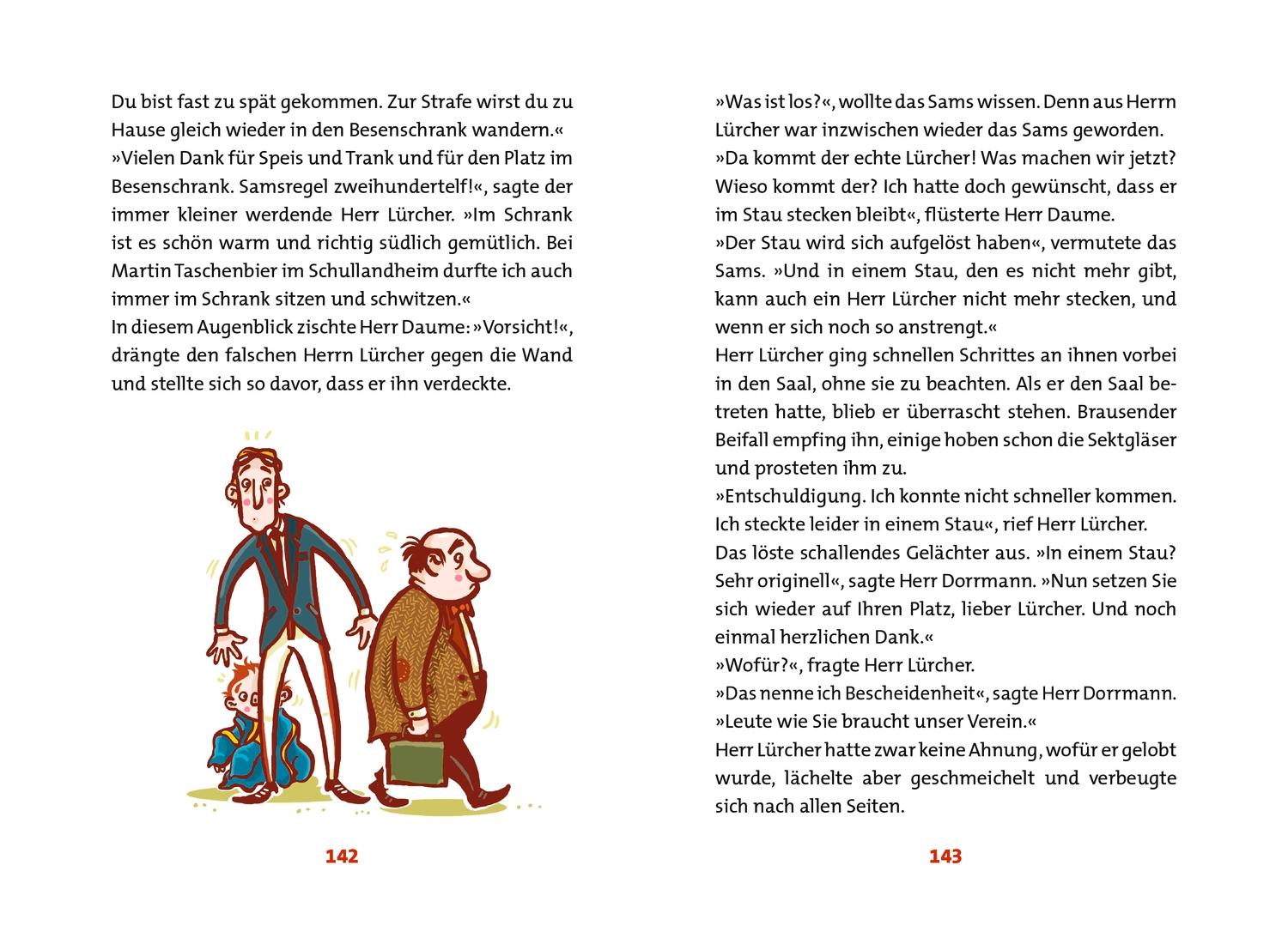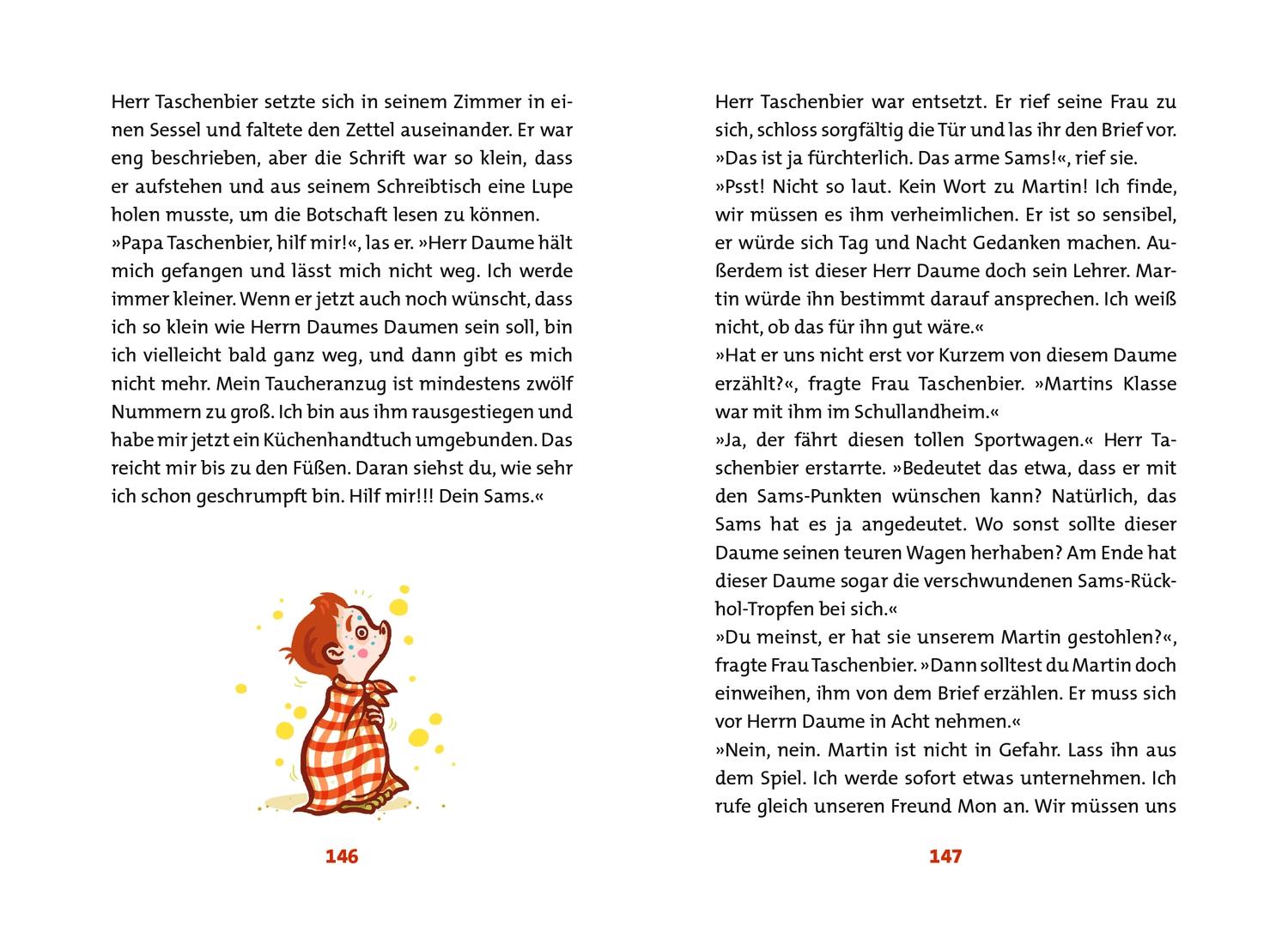 Das Sams ist wieder da! Mit einem weiteren spannenden Abenteuer und vielen farbigen Bildern. Das Sams schwebt in größter Gefahr! Martins Lehrer, der unfreundliche Herr Daume, will es mit aller Macht zu seinem eigenen Sams machen und scheut auch keine üblen Tricks, um das Sams zu zwingen, bei ihm zu bleiben. Doch ein Sams kann nun mal nur einem echten Taschenbier Wünsche erfüllen, und so hat die Wünscherei schlimmste Nebenwirkungen. Als Martin endlich herausgefunden hat, wo das Sams steckt, machen er und seine Freunde Tina und Roland sich daran, das Sams so schnell wie möglich zu befreien. Das Sams von Paul Maar steht für Toleranz im Alltag, ist unendlich neugierig und herrlich (wort-) witzig. Diese Bücher sind für Groß und Klein, mit tollen Illustrationen von Nina Dulleck.Die Bände der Sams-Reihe sind sowohl mit den Original-Illustrationen von Paul Maar erhältlich als auch modern interpretiert von Star-Illustration Nina Dulleck:
