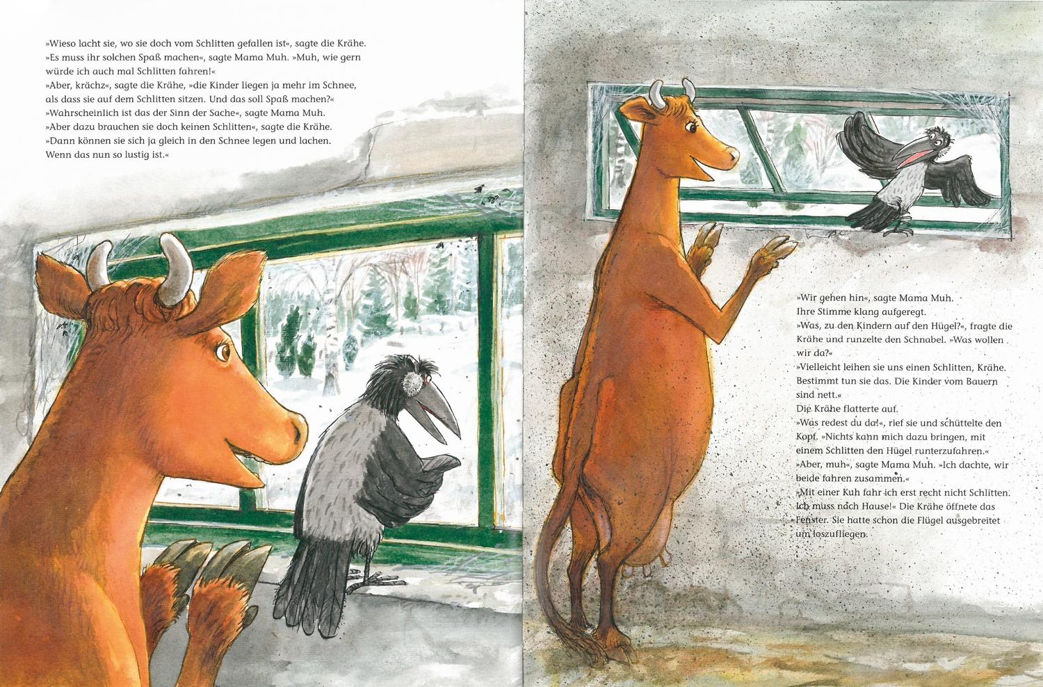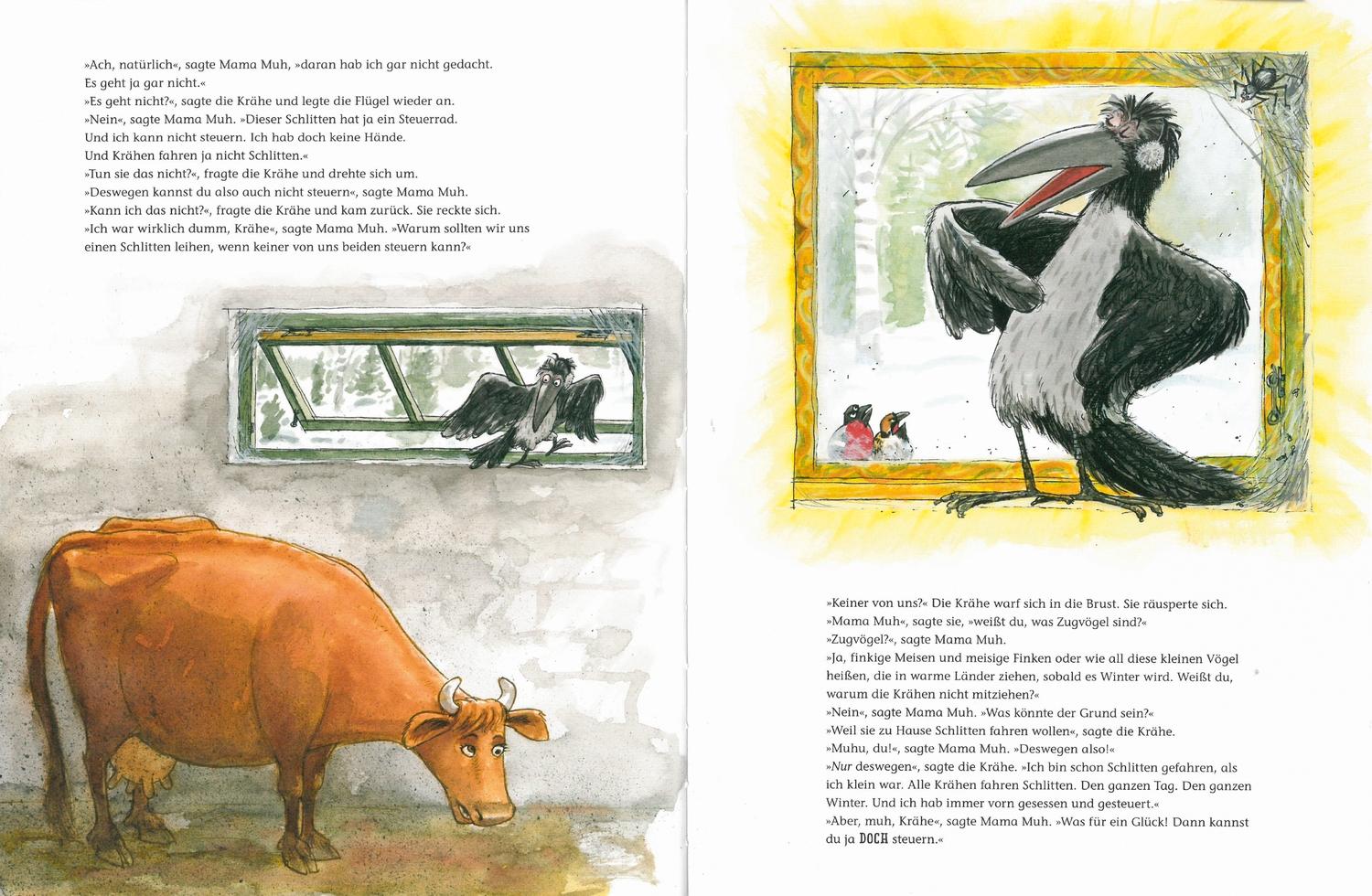 In "Mama Muh fährt Schlitten" wagt sich die unerschrockene Kuh Mama Muh in ein neues Abenteuer und zeigt, dass Kühe weit mehr können, als nur im Stall zu stehen - sogar Schlittenfahren. Dieses Mal stürzt sie sich, mit Unterstützung ihrer besten Freundin, der schlauen Krähe, in das winterliche Vergnügen. Doch der Spaß nimmt eine unerwartete Wendung, als plötzlich Slalomstöcke im Weg sind. Die humorvollen Dialoge zwischen Mama Muh und der Krähe, gepaart mit ihren kreativen und manchmal chaotischen Ideen, machen die Geschichte zu einem unterhaltsamen Leseerlebnis für Kinder. Die lebhaften Illustrationen fangen die Dynamik und den Spaß der Charaktere ein, was das Vorlesen oder Anschauen zu einem Genuss für Kinder und Eltern gleichermaßen macht. Mama Muh beweist einmal mehr, dass es nie zu spät ist, etwas Neues zu probieren, und dass wahre Freundschaft dabei hilft, jedes Hindernis zu überwinden.