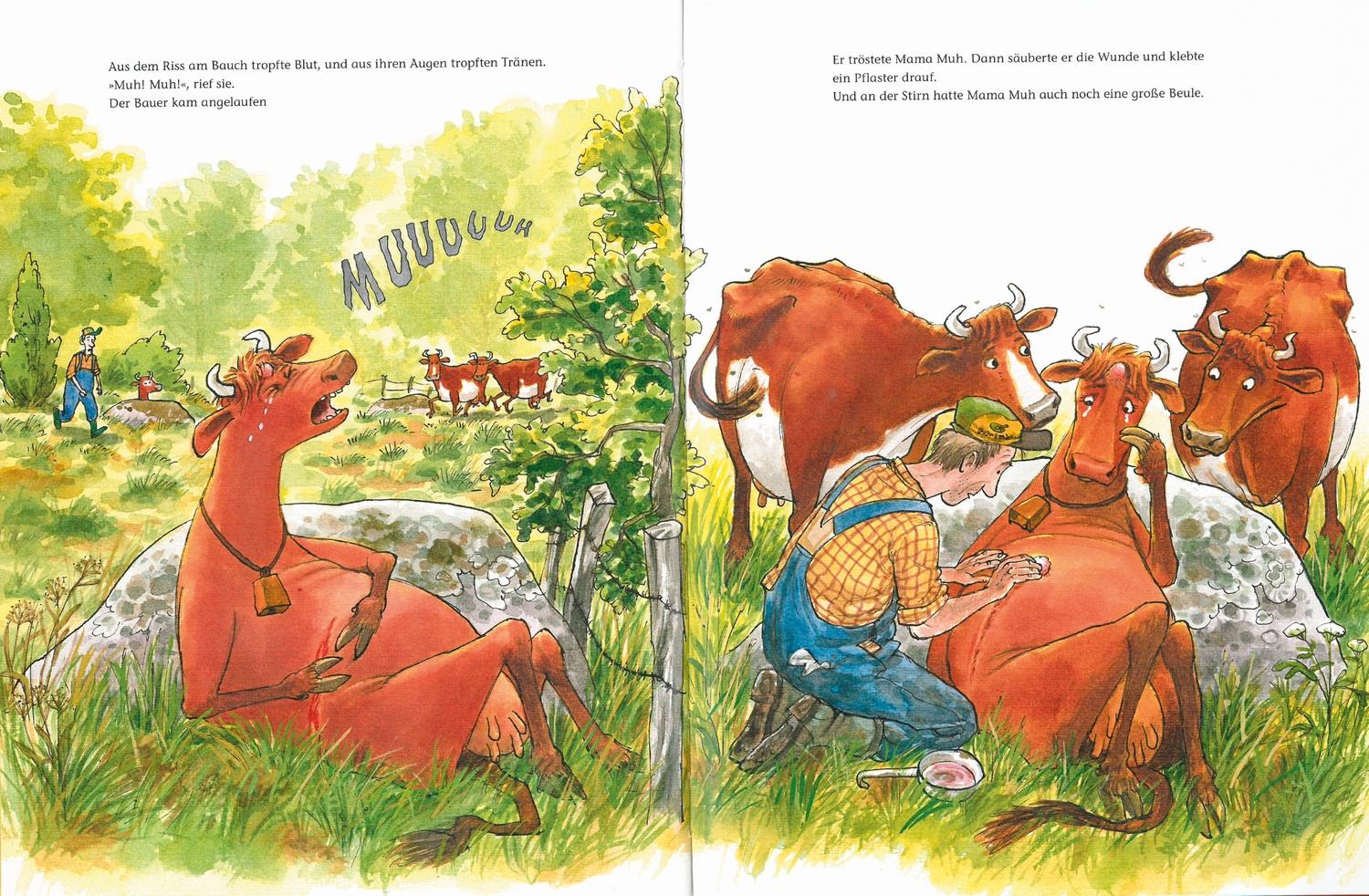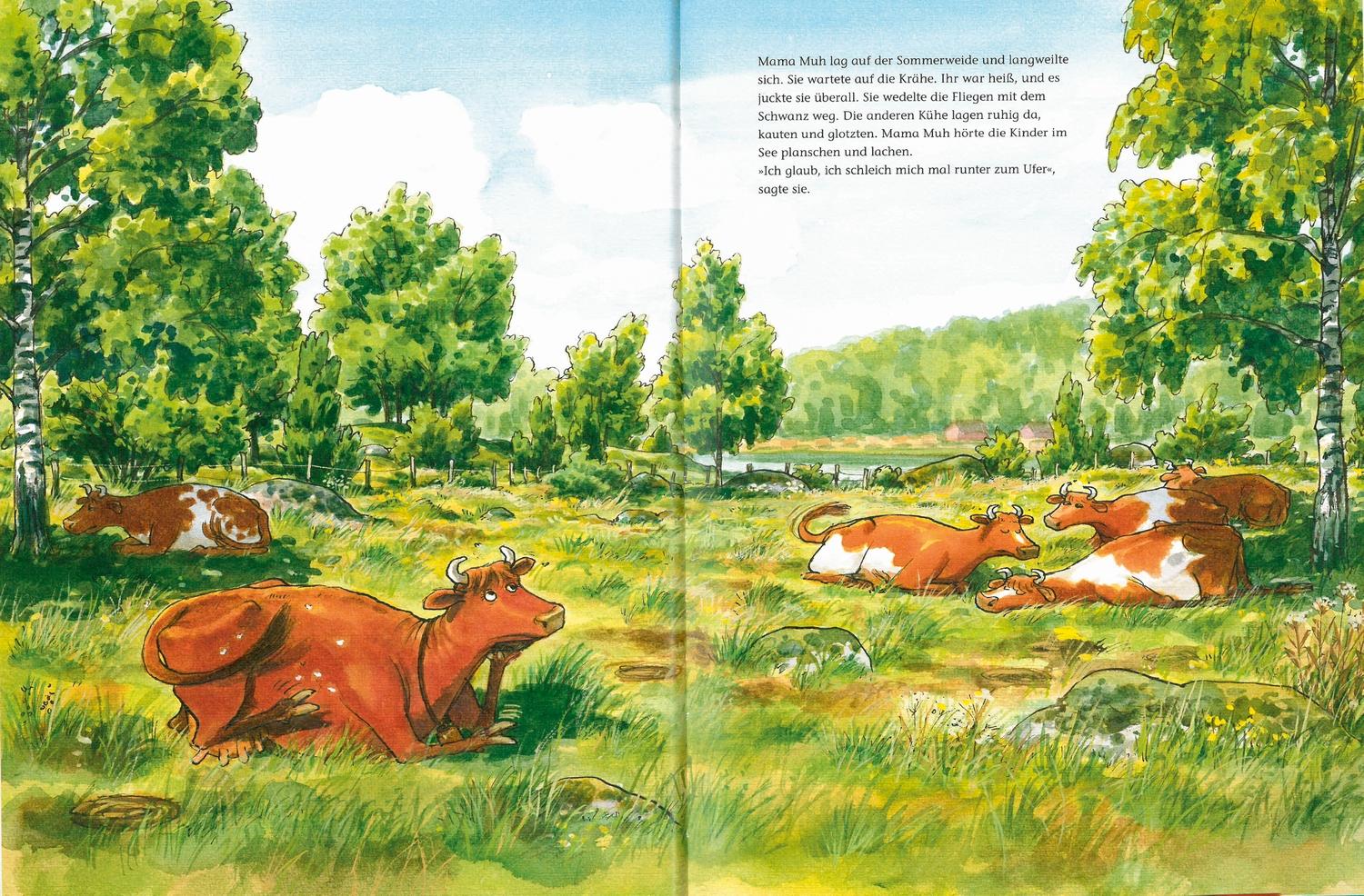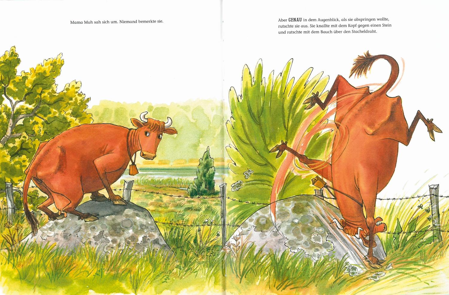 "Nun wird es höchste Zeit, ein großes Lob-Gemuh auf die einzig wahre und allerbeste Bilderbuchkuh anzustimmen, auf 'Mama Muh'. ... Der geistreichen Übersetzung Angelika Kutschs haben wir es zu verdanken, daß wir Mama Muh in ihrer ganzen komplexen Persönlichkeit erleben. Die Bezeichnung 'Mama' für diese Tier ist nicht ganz logisch. Sie ist eher wie ein Kleinkind: neugierig, experimentierfreudig, der Welt fröhlich zugewandt in der Gewißheit, daß alles, was sie sich vornimmt, schon irgendwie klappen wird. ... Die Krähe hat gewisse soziale Defizite. Kinder lieben ihre Schimpfkanonaden und auch die Unverbindlichkeit, mit der sie einfach fortfliegt, wenn die Verrücktheiten dieser Kuh ihr zu bunt werden. Andere Bilderbücher erzählen solch unerwünschtes Verhalten gerne weg, mit langweilig moralischer Pointe. Mama Muh mahnt manchmal sanft, ist aber insgesamt nachsichtig wie - eine Mama. Eine Moral gibt es hier auch, aber sie ist wie das laute Muhen einer Kuh: Unlogisch, überraschend." Fran