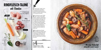 Tajine ist sowohl der Name dieses wunderschönen Gefäßes als auch der darin zubereiteten aromatischen Schmorgerichte. Ob vegetarisch oder mit Fleisch, Geflügel, Fisch und Meeresfrüchten - ihnen gemeinsam ist das schonende Garen im eigenen Saft bei niedrigen Temperaturen. Das intensiviert den Geschmack und macht diese Gerichte so unglaublich lecker. Auf Fett kann dabei verzichtet werden.