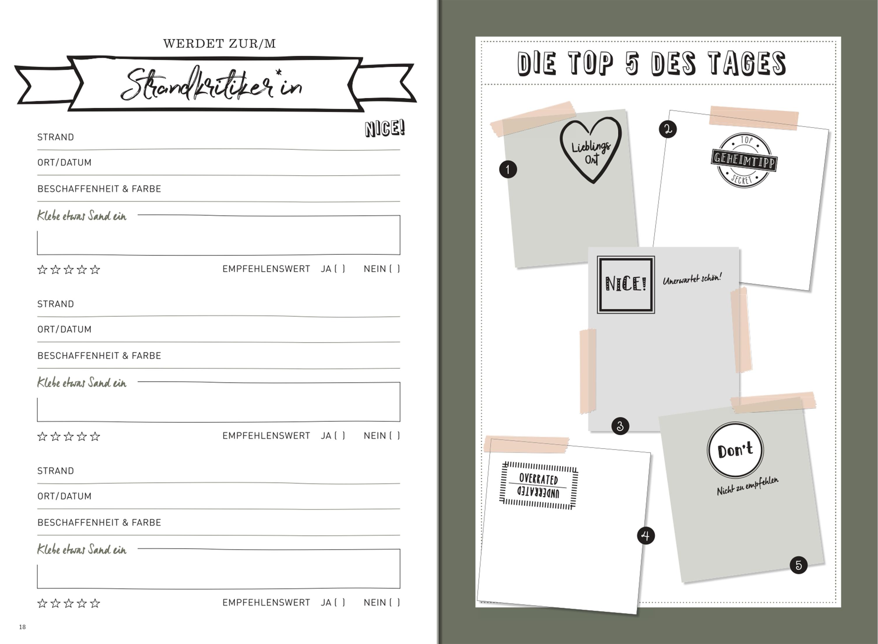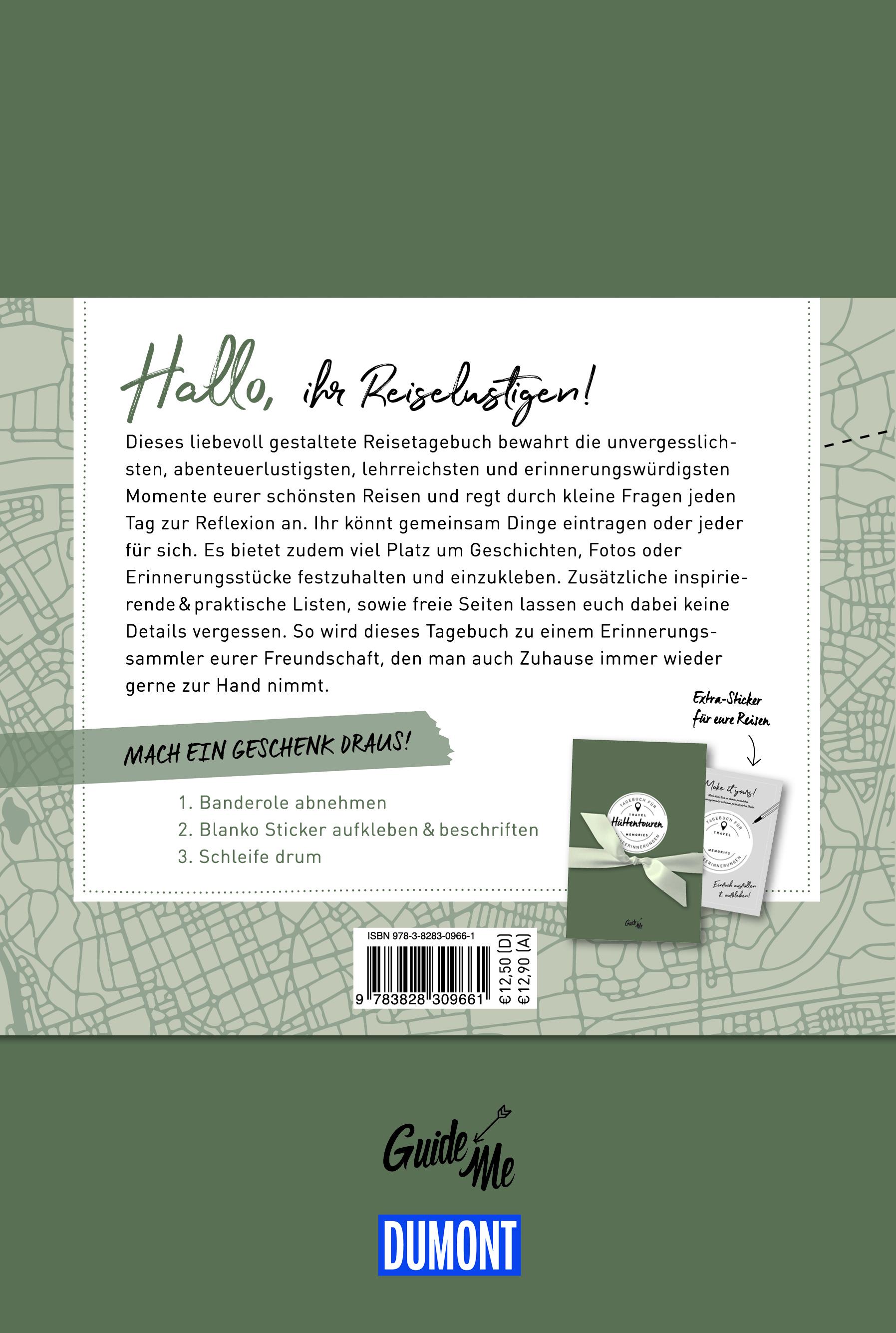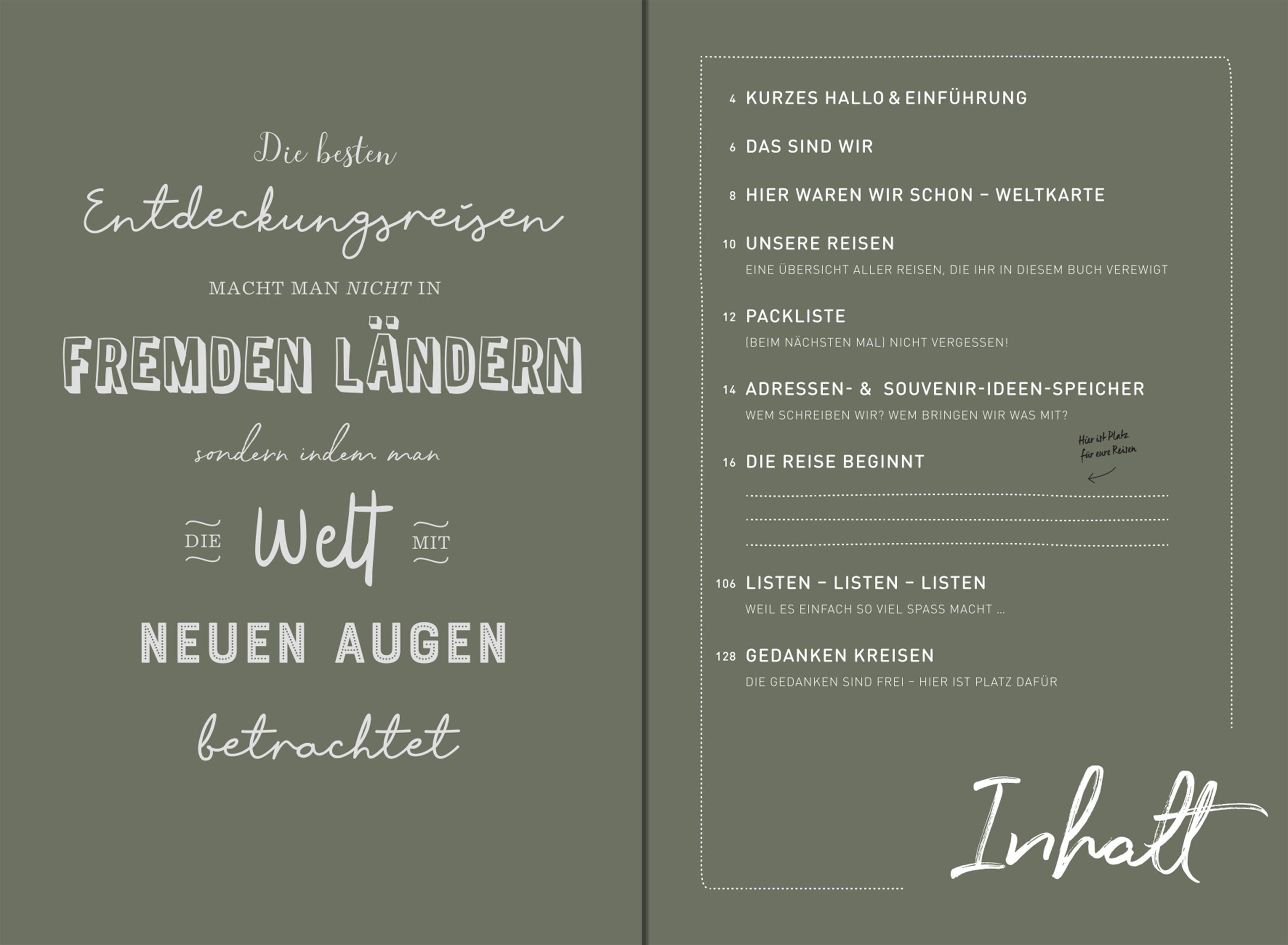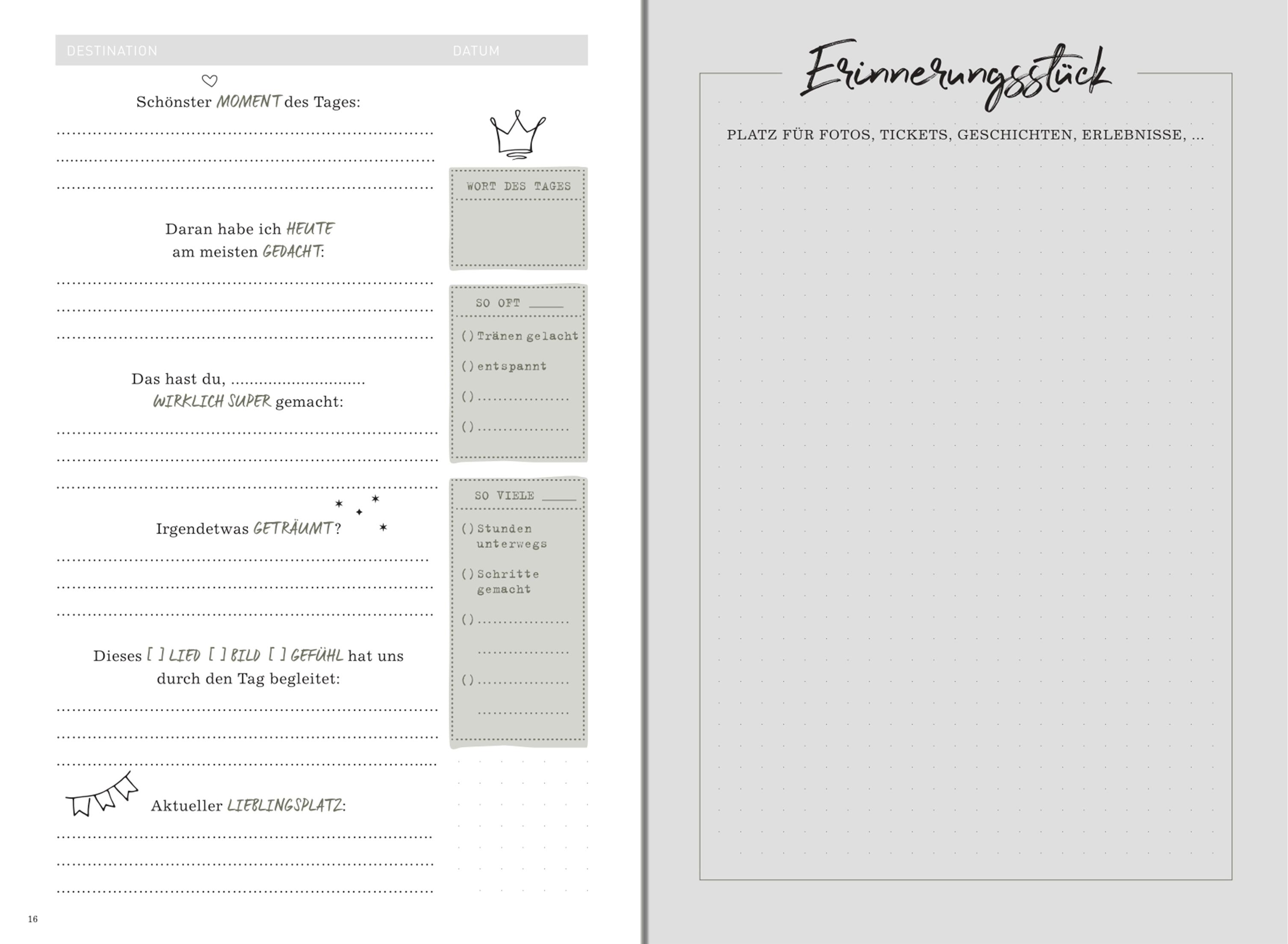 Dieses liebevoll gestaltete Erinnerungsbuch hält die unvergesslichsten, abenteuerlustigsten, lehrreichsten und erinnerungswürdigste Momente unserer schönsten Reisen fest und regt durch kleine Fragen jeden Tag zur Reflexion an. So wird das Reisetagebuch zu einem Achtsamkeits-Bewahrer, den man auch Zuhause immer wieder gerne zur Hand nimmt. Die 128 Seiten bieten zudem viel Platz um Geschichten, Fotos oder Erinnerungsstücke festzuhalten und einzukleben. Zusätzliche inspirierende & praktische Listen, sowie freie Seiten lassen dabei keine Details vergessen. - Für eine große Reise (3 Wochen) oder mehrere kleine Trips - Stabiles Hardcover mit praktischem Lesebändchen - Blanko Sticker für individuelle Cover-Gestaltung - Cleanes Design und schöne Illustrationen - Gut beschreibbares Papier - Ideales (Abschieds-)Geschenk für Weltenbummler