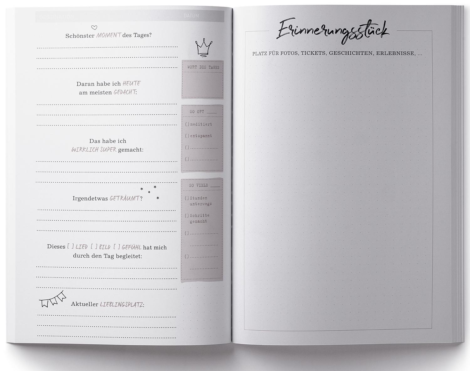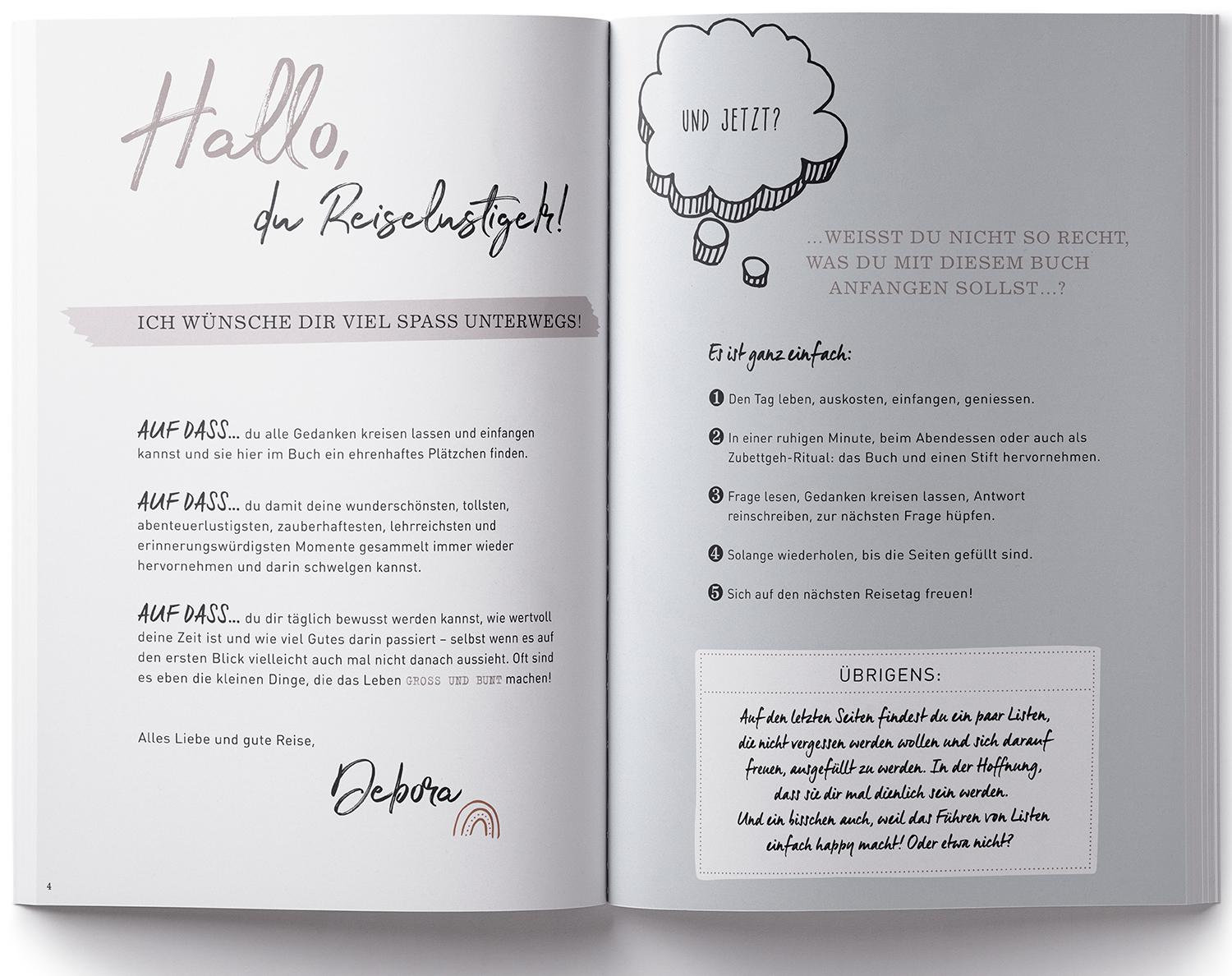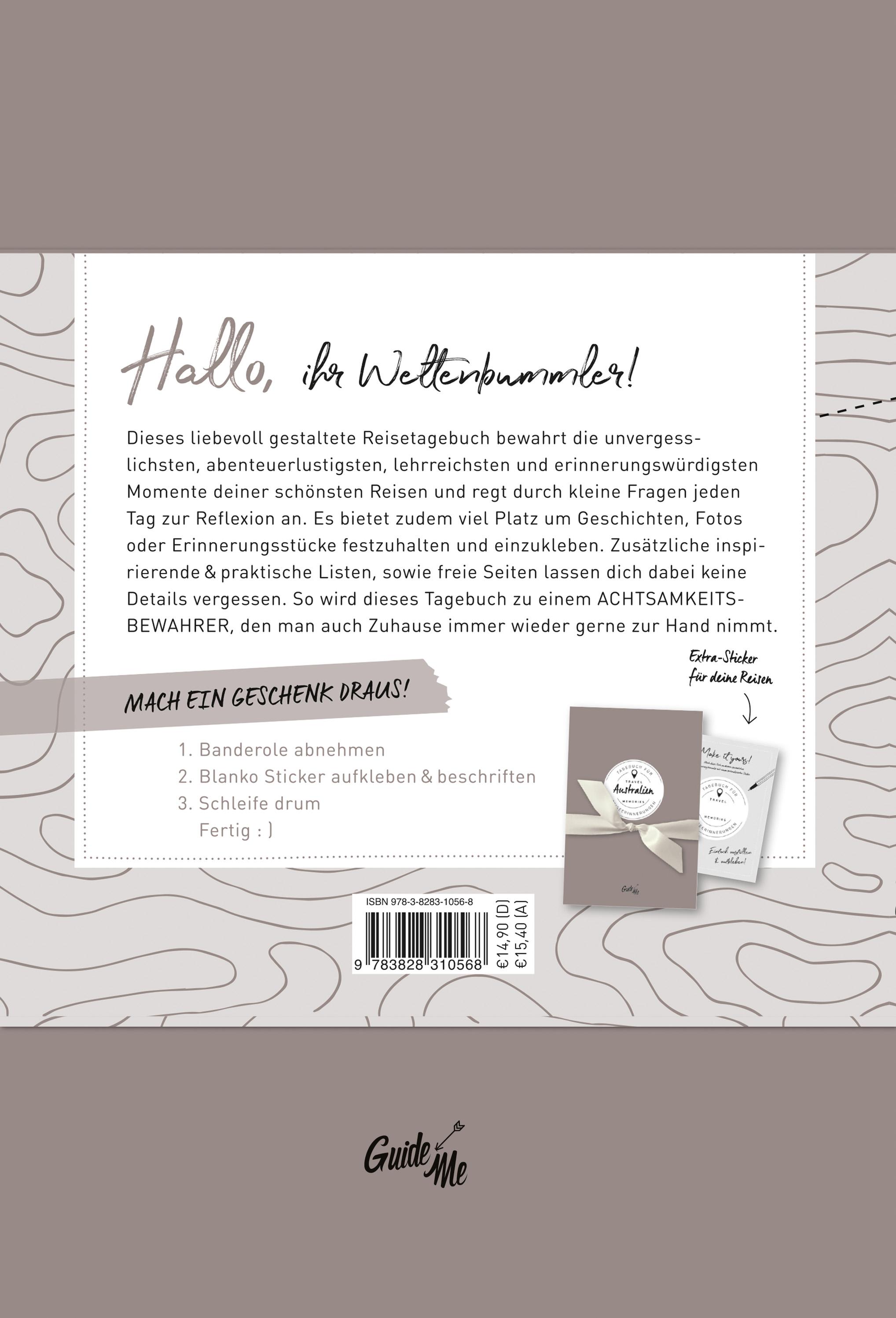 Dieses liebevoll gestaltete Erinnerungsbuch hält die unvergesslichsten, abenteuerlustigsten, lehrreichsten und erinnerungswürdigste Momente unserer schönsten Reisen fest und regt durch kleine Fragen jeden Tag zur Reflexion an. So wird das Reisetagebuch zu einem Achtsamkeits-Bewahrer, den man auch Zuhause immer wieder gerne zur Hand nimmt. Die 128 Seiten bieten zudem viel Platz um Geschichten, Fotos oder Erinnerungsstücke festzuhalten und einzukleben. Zusätzliche inspirierende & praktische Listen, sowie freie Seiten lassen dabei keine Details vergessen. - Für eine große Reise (3 Wochen) oder mehrere kleine Trips - Stabiles Hardcover mit praktischem Lesebändchen - Blanko Sticker für individuelle Cover-Gestaltung - Cleanes Design und schöne Illustrationen - Gut beschreibbares Papier - Ideales (Abschieds-)Geschenk für Weltenbummler