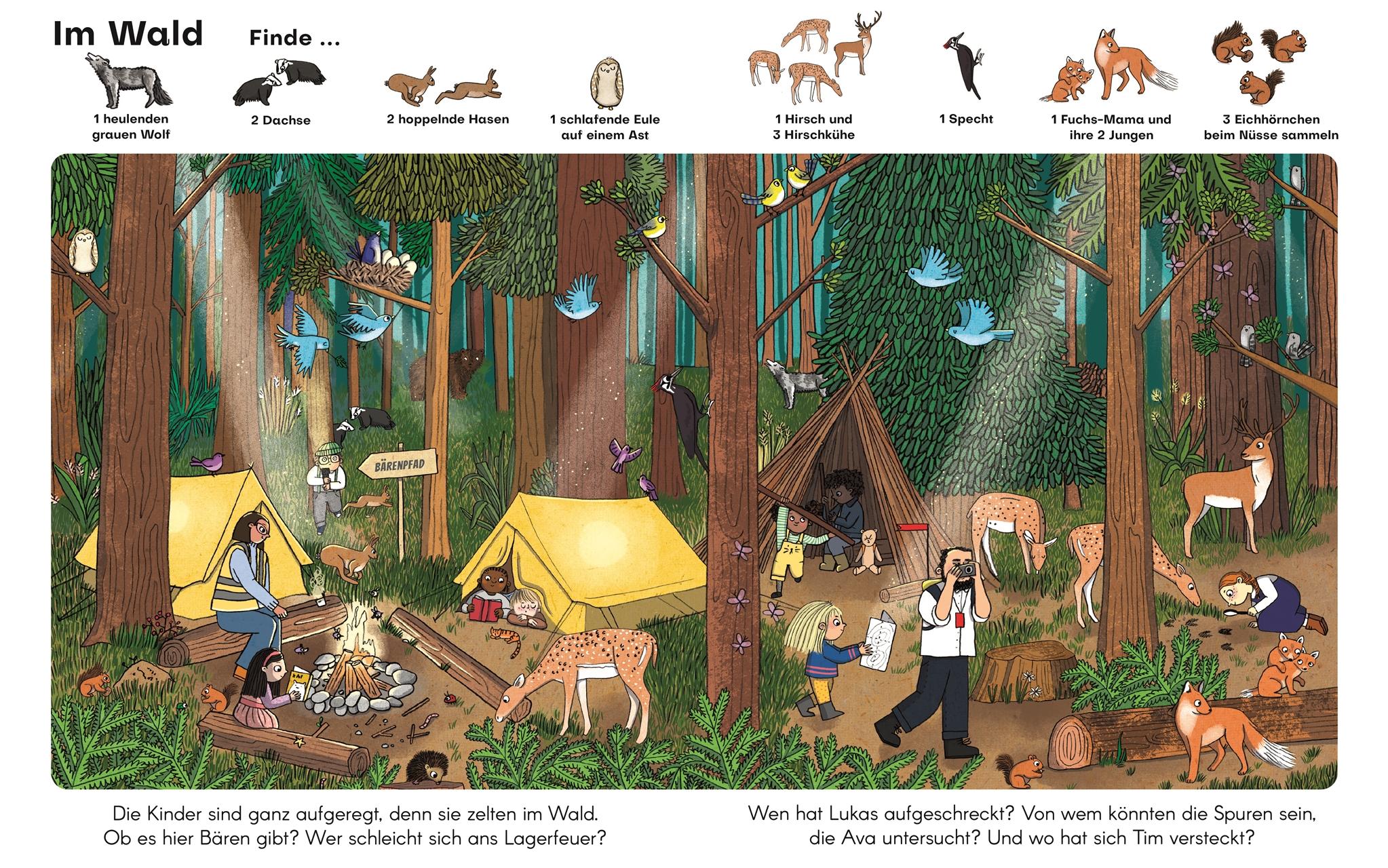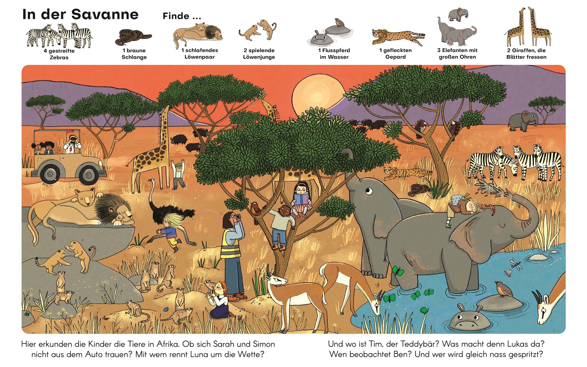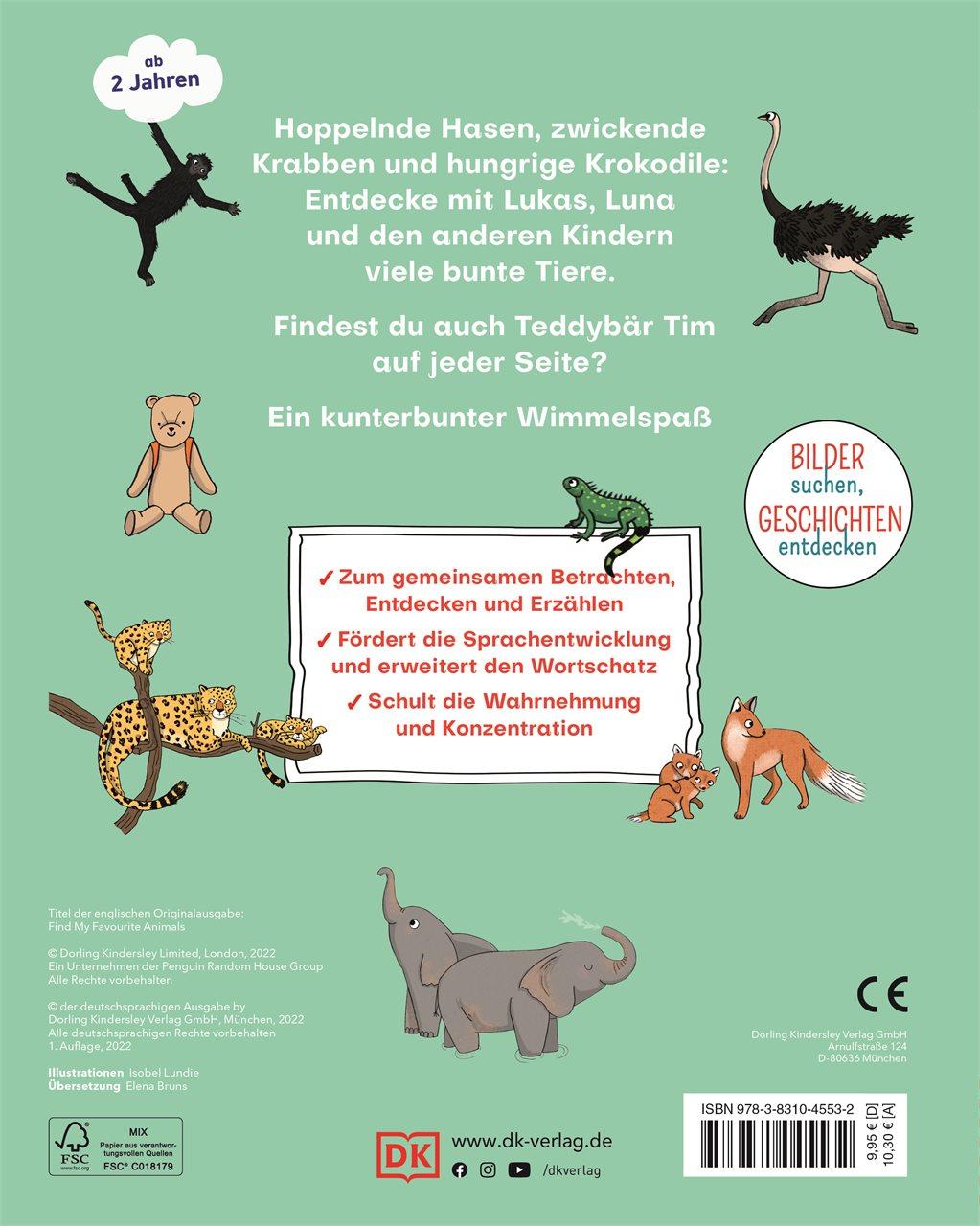 Kunterbunter Wimmelspaß für die ganze Familie Einmal mit dem Strauß um die Wette rennen, mit Walen im Meer tauchen oder auf dem Bauernhof im Heu toben! Liebevoll gestaltete Suchbilder in diesem handlichen Wimmelbuch schicken Kinder ab 2 Jahren auf eine Reise durch tolle Naturlandschaften. Dabei gibt es einiges zu entdecken: Kurze Texte beschreiben die Szenen und die Kinder dürfen ein bestimmtes Tier finden, die Suchbilder erkunden und wunderbare Geschichten darüber erzählen. Und wo steckt eigentlich Teddy Tim? Mit viel Spaß suchen, lernen und den Wortschatz erweitern! Wimmelbücher funktionieren auf vielfältige Art und Weise: Die Suchbilder machen es Kindern leicht, über alles, was sie sehen, zu sprechen. Denn es gibt einfach viel zu sehen! Außerdem sind Wimmelbilder auch pädagogisch besonders wertvoll, da Kinder hier nicht nur ihren Wortschatz erweitern, sondern auch Wahrnehmung und Konzentration schulen. Die stabilen Pappseiten dieses wunderbaren Bilderbuchs ab 2 zeigen witzig gezeichnete Wimmelbilder und bieten jede Menge Such-, Erzähl- und Beschäftigungsspaß. Abtauchen in aufregende Tierwelten . Witzig illustriertes Tier-Wimmelbuch zum Suchen und Entdecken in einem praktischen Format, das in die Handtasche passt. Auf dem Bauernhof, im Dschungel und am Meer: eine Kindergruppe entdeckt auf kleinen Ausflügen viele Tiere. Liebenswerte Figuren zeigen ein vielfältiges Gesellschaftsbild. Großer Beschäftigungsspaß durch Suchleisten, Fragen und animierende Texte Die bezaubernd illustrierten Suchbilder in diesem Wimmelbuch ab 2 machen nicht nur den Kleinsten Spaß. Auf dem Bauernhof, in der Savanne und unter dem Meer entdecken Kinder neben Teddy Tim noch vieles mehr.