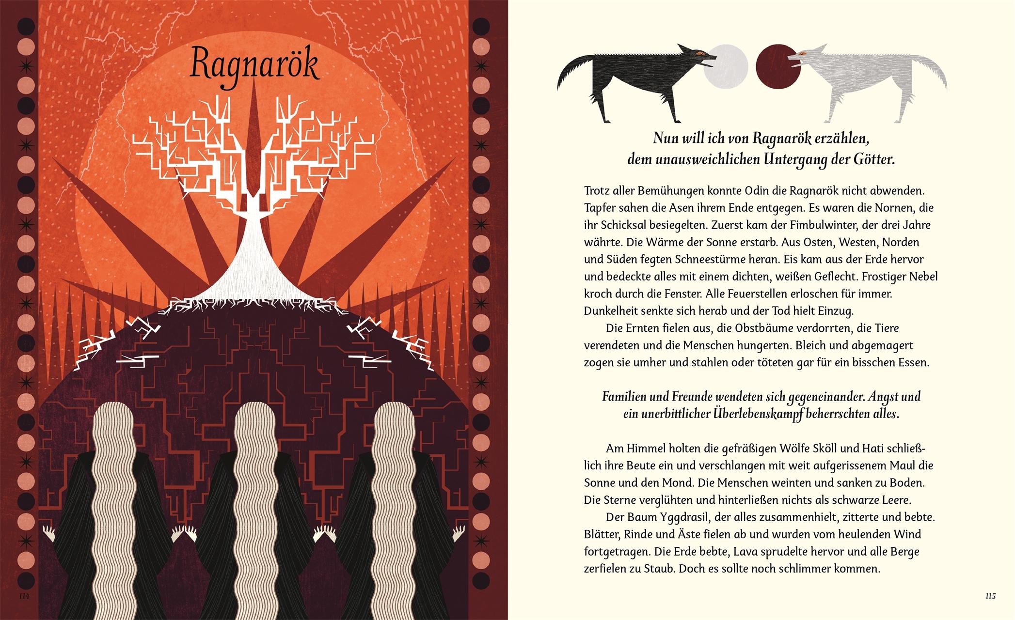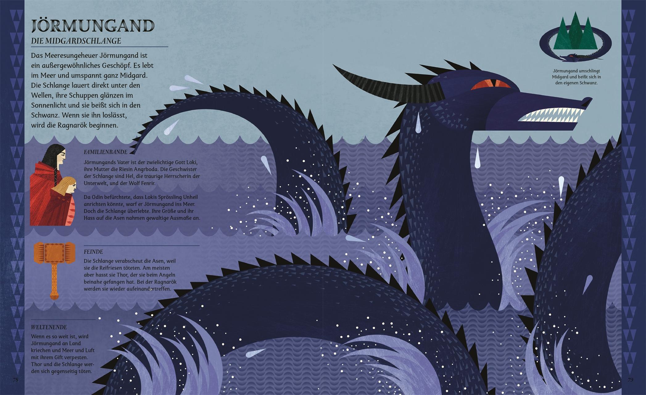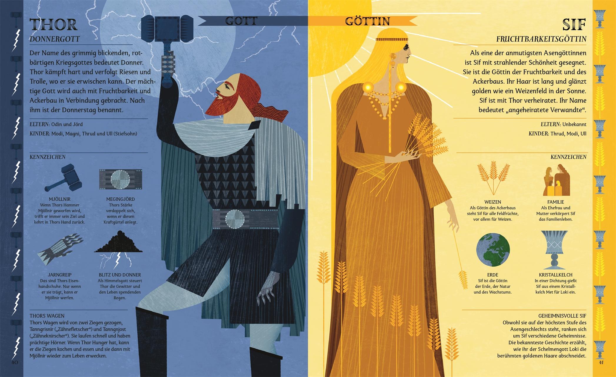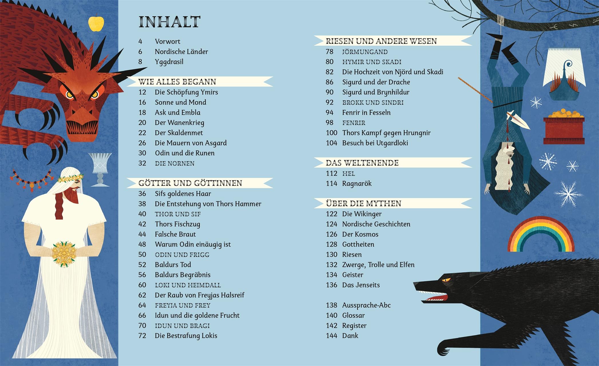 Geschichten der Nordischen Mythologie für Kinder und Erwachsene neu erzählt Die Schöpfung der Welt, die Mauern von Asgard oder Thors Hochzeit - dieses Buch lässt Kinder ab 10 eintauchen in die Sagenwelt der alten Wikinger. Wunderschöne Illustrationen und atmosphärische Texte erzählen auf moderne Weise 20 magische Geschichten von streitenden Brüdern, furchteinflößenden Riesen und heldenhaften Drachentötern. Dazu gibt es übersichtliche Steckbriefe zu den wichtigsten Gottheiten und ihren Besonderheiten. Eintauchen in die geheimnisvolle Sagenwelt der Wikinger - Stimmungsvoll erzählt: Diese mehr als 20 Sagen der nordischen Mythologie faszinieren und begeistern Kinder, Jugendliche und Erwachsene. - Den Ursprung der MARVEL Helden verstehen: Spannend auch für Erwachsene sind die mythologischen Vorbilder der MARVEL Helden und Serienstars mit nordischen Wurzeln von Thor über Odin bis Loki - Steckbriefe und Informationen: Namen, Eigenschaften, Merkmale und Landkarten helfen beim Einordnen von Figuren und Orten. - Kunstvoll illustriert: Der Band ist durchgehend farbenprächtig und fantasievoll gestaltet von der preisgekrönten Illustratorin Katie Ponder. Auf den Spuren von nordischen Gottheiten, listigen Helden und mythischen Kreaturen: Eine sagenhafte und fantasievoll illustrierte Einführung für Kinder in die nordische Mythologie! Dieses Buch ist bei Antolin verfügbar.