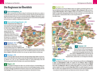 Übersichtlich und klar strukturiert finden sich im Vorspann des Reiseführers die Beschreibungen aller Regionen, eine Jahresübersicht zu Festen und Veranstaltungen, Routenvorschläge und persönliche Top-Tipps der Autoren. Jedes Kapitel beginnt mit einer Doppelseite, auf der die Inhalte mit einer Karte der Region, Highlights und Seitenverweisen vorgestellt werden. Selbstfahrer finden ebenso wie Reisende, die mit öffentlichen Verkehrsmitteln unterwegs sind, alle notwendigen Informationen. Tipps zu naturnahem und nachhaltigem Reisen sowie zum Reisen mit Kindern helfen bei der Auswahl der passenden Adressen.