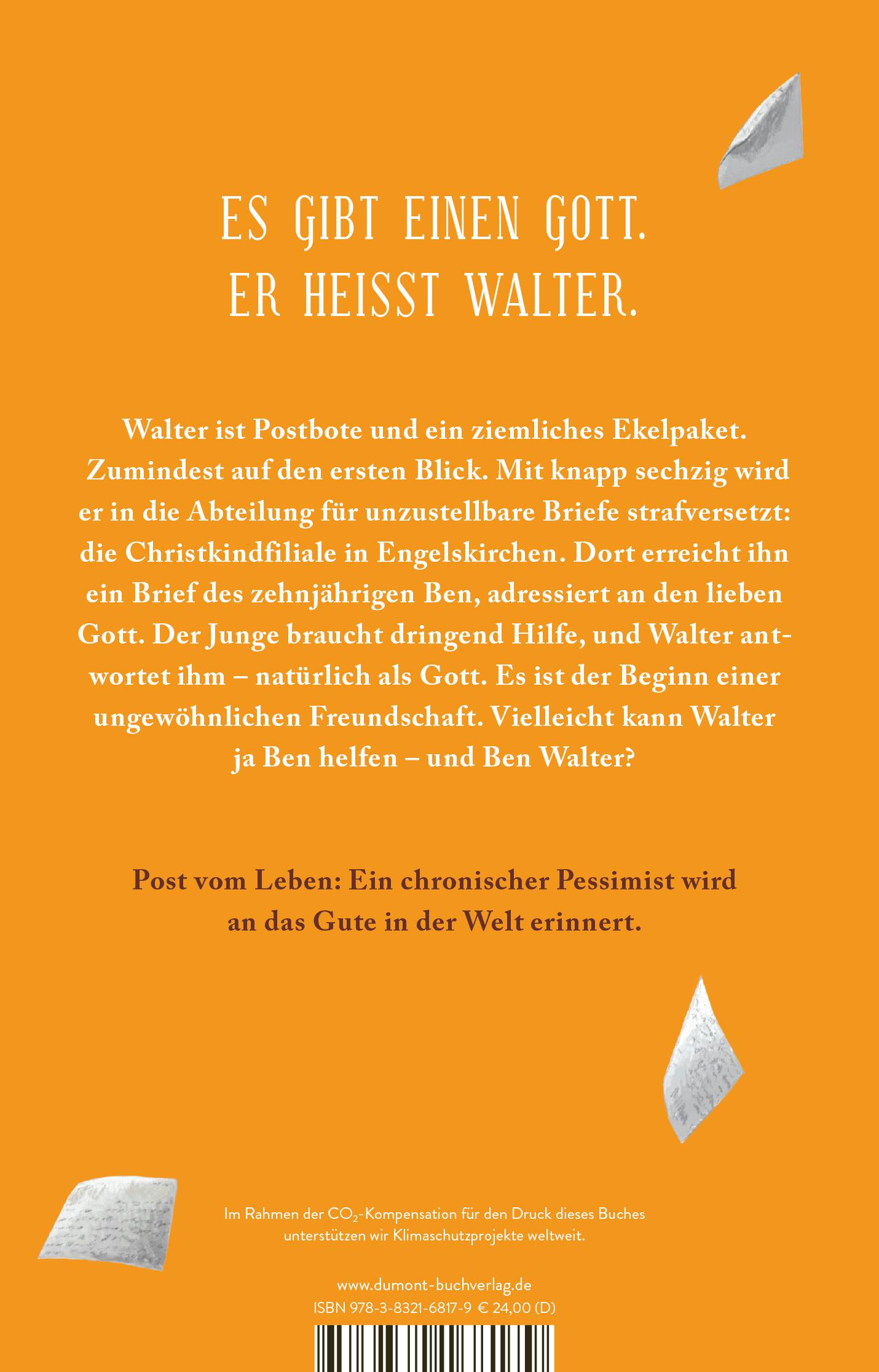 Walter ist Postbote und ziemlich gut darin, sich unbeliebt zu machen. Mit knapp sechzig wird er schließlich in die Abteilung für unzustellbare Briefe strafversetzt: in die Christkindfiliale der Post in Engelskirchen. Natürlich ist niemand schlechter für den Job geeignet als er. Eines Tages erreicht ihn ein Schreiben an den lieben Gott. Es stammt vom zehnjährigen Ben. Er will weder Handy noch Playstation, sondern nur wissen, wie man einen Klempner ruft. Walter antwortet vage und bekommt einen zweiten Brief, in dem Ben den lieben Gott ganz schön zusammenfaltet: Warum hilft er ihm nicht? Walter beginnt einen Briefwechsel mit Ben, selbstverständlich als Gott. Er erfährt immer mehr über das Leben des Jungen, der allein mit seiner depressiven Mutter lebt. Mehr als alles andere wünscht Ben sich einen Freund. Unterdessen naht Weihnachten, und Walter ist mit seinem eigenen Familiendrama beschäftigt: Die Beziehung zu seinen Kindern ist kompliziert, geschieden ist er schon lange, und da ist diese schwere Schuld aus seiner Vergangenheit, die ihm einfach keine Ruhe lässt. Vielleicht kann Walter ja Ben helfen und Ben Walter?