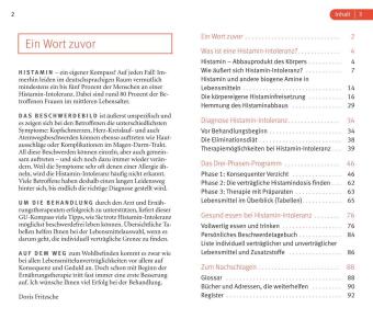 Nicht jeder, der sich gesund ernährt, fühlt sich automatisch auch wohl. Lebensmittel wie Tomaten, Fisch, Hartkäse, Spinat oder Sauerkraut können bei Menschen mit Histamin-Intoleranz - HIT - zu vielen verschiedenen Beschwerden führen wie beispielsweise starke Magen-Darm-Beschwerden, Herzrasen, Kopfschmerzen, eine behinderte Nasenatmung, geschwollene Augenlider oder niedriger Blutdruck. Die Symptome treten meistens unmittelbar bis zwei Stunden nach dem Essen auf und können bis zu einem halben Tag oder länger andauern. Ursache ist ein im Lauf des Lebens erworbener Mangel am Enzym DAO. Da die HIT eine genaue Kenntnis der zu vermeidenden histaminreichen Nahrungsmittel erfordert, werden in diesem Kompass detaillierte Lebensmitteltabellen aufgeführt. Mit dem empfohlenen Drei-Phasen-Programm - konsequenter Verzicht, das Finden der verträglichen Histamindosis und der Einsatz von Antihistaminika und Enzymen - können die Krankheitszeichen fast vollständig verschwinden.