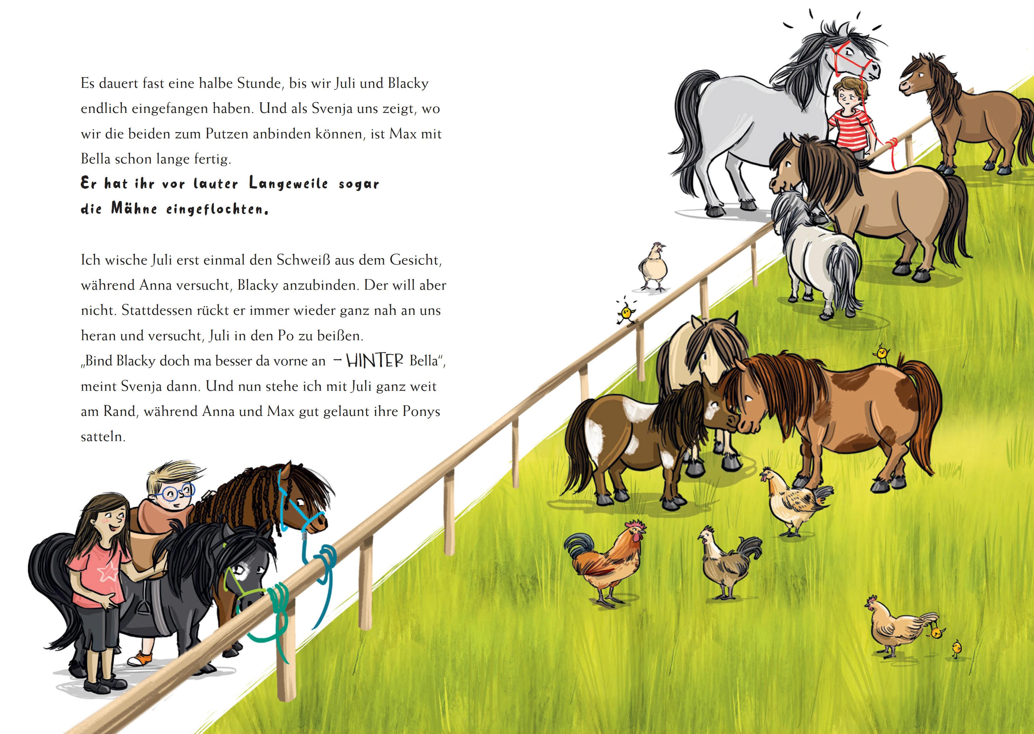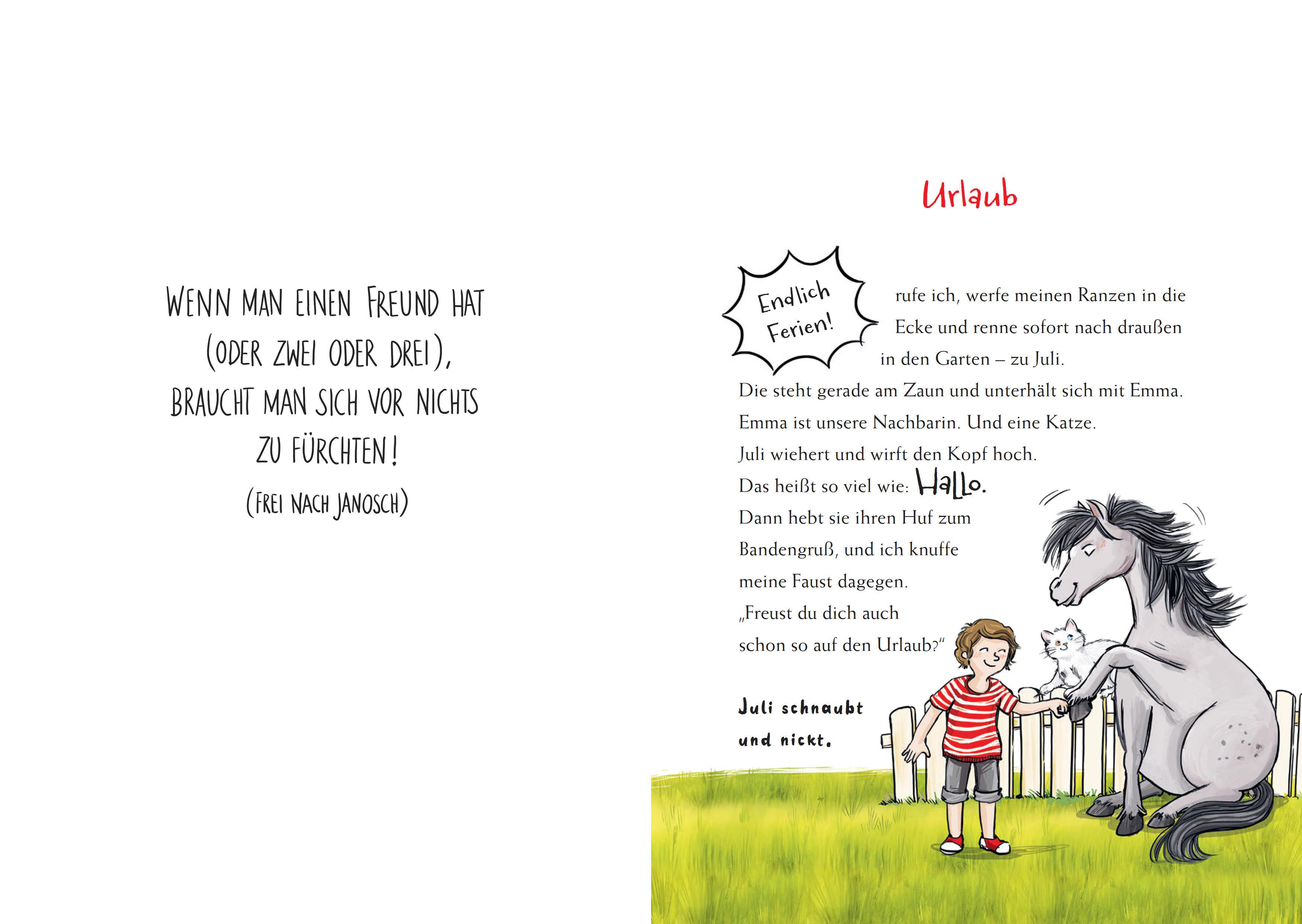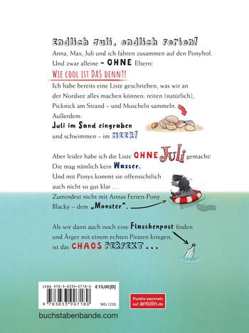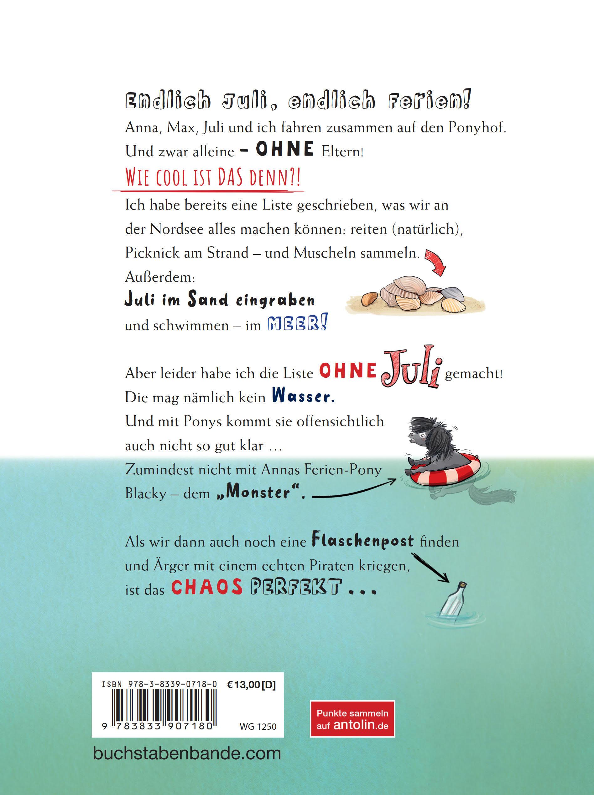 Endlich Juli, endlich Ferien! Anna, Juli und ich fahren zusammen auf den Ponyhof. Und zwar OHNE Eltern! Wie cool ist DAS denn?! Ich habe bereits eine Liste geschrieben, was wir an der Nordsee alles machen können: reiten natürlich. Und schwimmen. Und die Insel erkunden. Außerdem: eine Sandburg bauen, Picknick am Strand, Muscheln sammeln, Juli im Sand eingraben und mit Anna Pläne für den nächsten Tag schmieden! Genauso stelle ich mir einen perfekten Urlaub vor! Aber leider habe ich die Rechnung ohne Juli gemacht ... Die mag nämlich kein Wasser, und Ponys mag sie offenbar auch nicht. Scheint so, als wäre ein Ponyhof am Meer also doch nicht das perfekte Urlaubsziel. Jedenfalls nicht mit Juli ...