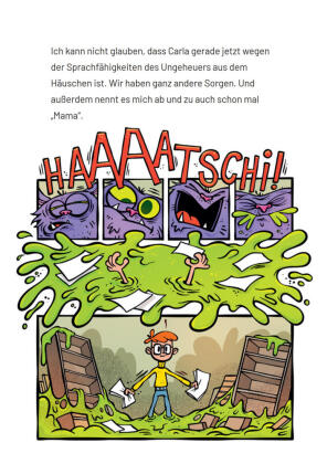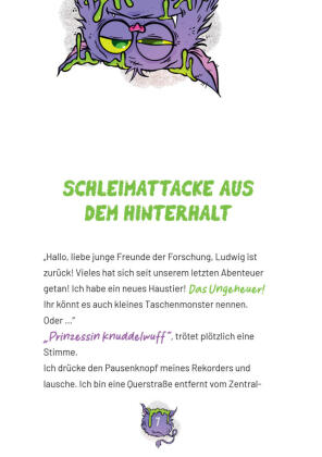 Ludwig hat ein Monsterproblem! Denn scheinbar stammt das Ungeheuer, das er in einer Mülltonne gefunden hat und ihn ständig "Mama" nennt, aus einem Labor, und fiese Wissenschaftler sind hinter ihm her. Ludwig will herausfinden, welche dunklen Machenschaften dahinterstecken, und beginnt kurzerhand ein Praktikum in besagtem Labor. Währenddessen kümmert sich seine Schwester Carla um das Ungeheuer, das sich eine miese Erkältung zugezogen hat. Es hustet und rotzt und schnieft - und braucht ganz dringend eine Monstermedizin. Aber wie soll man so ein Ungeheuer geheim halten, wenn es eine grüne Schleimspur der Verwüstung hinter sich herzieht?