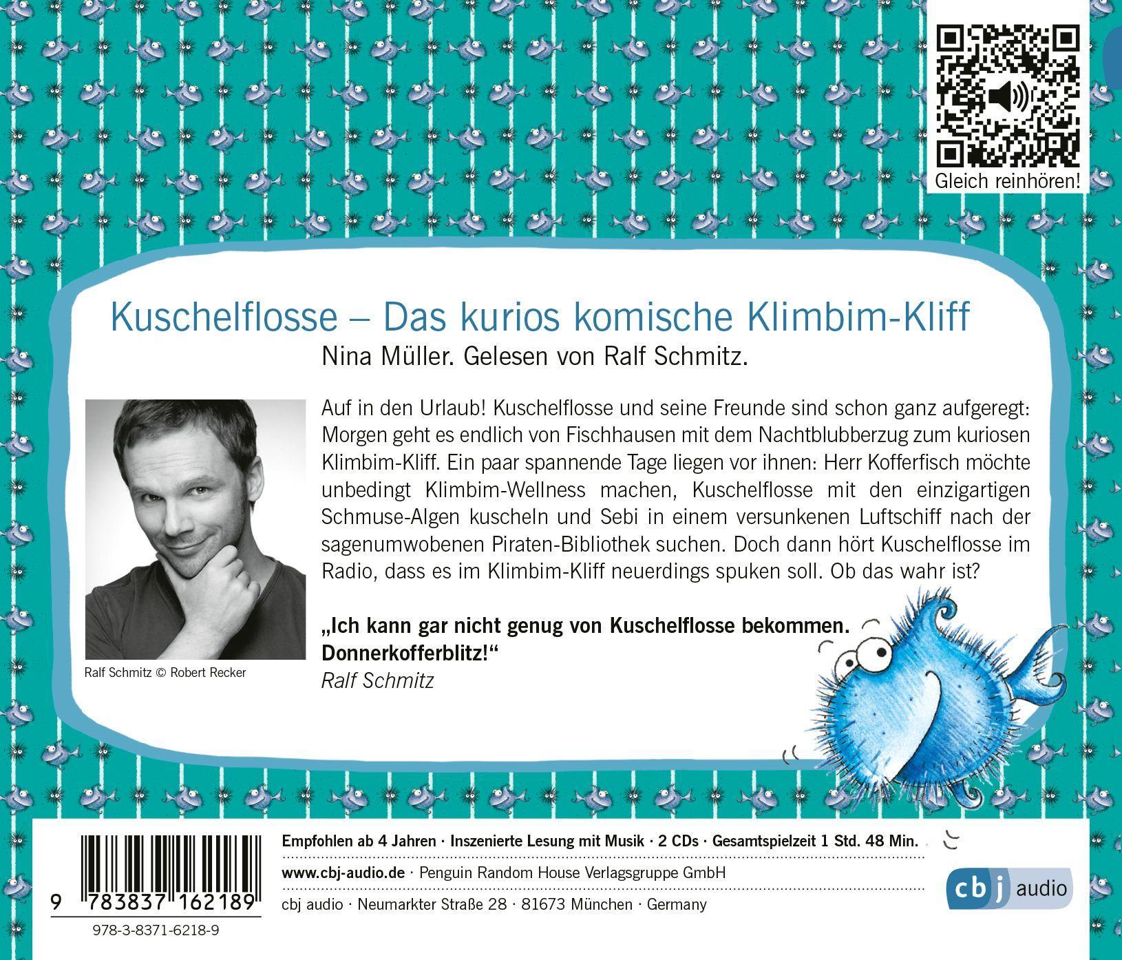 Blubberbunte Familienunterhaltung mit viel Witz und Herz hinreißend gelesen von Ralf Schmitz Kuschelflosse und seine Freunde fahren in den Urlaub ins Klimbim-Kliff! Jeder hat dort seine eigenen Pläne: Kuschel möchte mit den Schmusealgen kuscheln, Emmi durch den Tunnel sausen, Herr Kofferfisch Klimbimwellness machen und Sebi möchte auf die Suche nach der geheimnisvollen Piratenbibliothek gehen. Denn im Klimbimkliff gibt es ein versunkenes Piratenschiff und allerhand Klimbim davon, der sich über das Kliff verstreut hat. Doch als es dort dann nachts zu spuken scheint, werden die Urlaubspläne gründlich durcheinandergewirbelt ... Inszenierte Lesung/Ungekürzte Lesung mit Ralf Schmitz 2 CDs, 1h 48min