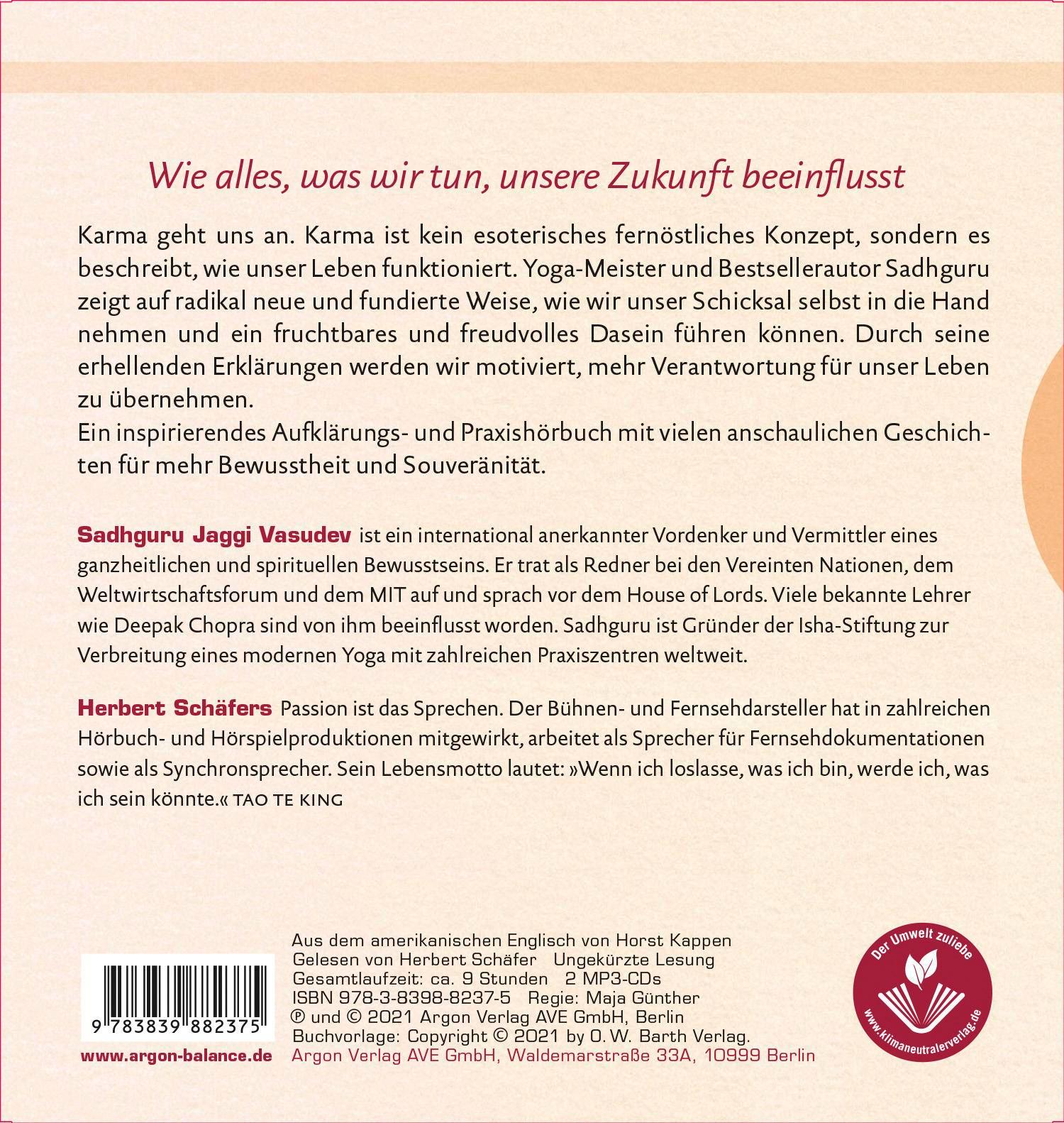 Alle sprechen von »Karma«, ob sie daran glauben oder nicht. Aber was bedeutet »Karma« eigentlich wirklich? Der Yoga-Meister und Bestsellerautor Sadhguru geht dieser Frage auf seine kluge und humorvolle Art nach und zeigt, wie unser Handeln und unser Schicksal zusammenhängen. Er klärt auf, wie wir unser Schicksal selbst in die Hand nehmen und ein fruchtbares und freudvolles Leben führen können. Dieses Hörbuch ist ein inspirierender Lebensratgeber für eine nachhaltige Persönlichkeitsentwicklung und mehr Souveränität im Leben.