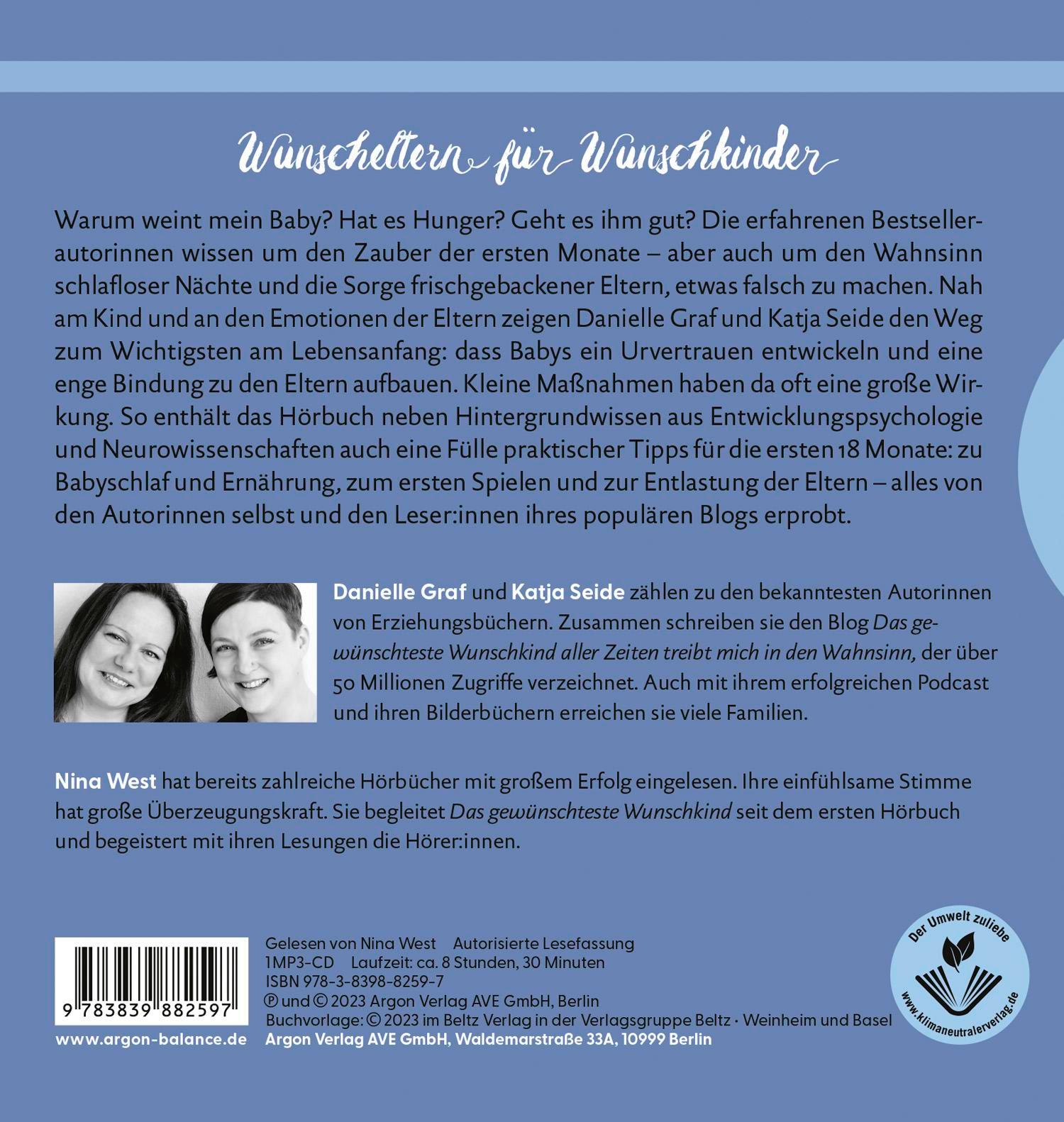 Spätestens nach den ersten Wochen mit Baby merken viele junge Eltern, wie herausfordernd das Leben mit dem neuen Familienmitglied ist. Auch die erfahrenen Bestseller-Autorinnen Danielle Graf und Katja Seide wissen sehr gut um den Zauber der ersten Monate - aber auch um den Wahnsinn, in den das kleine Wesen, das man doch über alle Maßen liebt, seine Eltern treiben kann.Nah am Kind und an den Emotionen der Eltern, oft witzig und immer liebevoll helfen die Autorinnen zu verstehen, wie Babys ticken, was sie in konkreten Situationen brauchen und wie sie gelassen begleitet werden können. Sie erklären, warum das Entscheidende in diesen ersten Lebensmonaten ist, dass Babys ein Urvertrauen entwickeln und eine intensive Bindung zu den Eltern aufbauen. Kleine Maßnahmen haben da oft eine große Wirkung, und so enthält das Hörbuch auch eine Fülle praktischer Tipps z.B. zu Babyschlaf, Ernährung und Gesundheit, alles von den Autorinnen selbst und den Leser:innen ihres populären Blogs erprobt.Wer die Basics für die erste Lebenszeit kennt, kann entspannt in die neue Rolle als Eltern hineinwachsen!