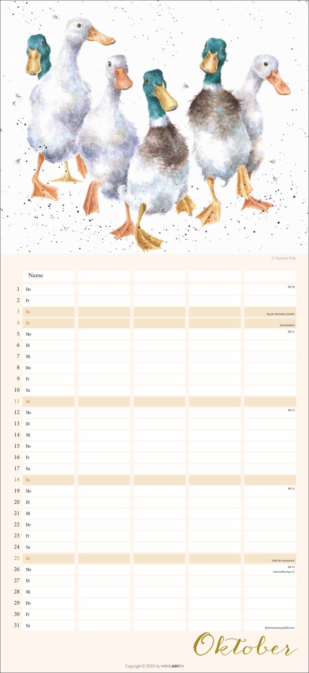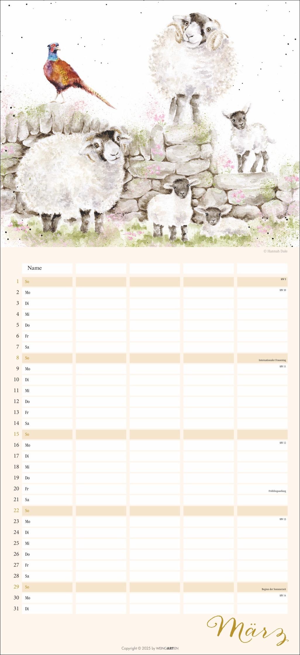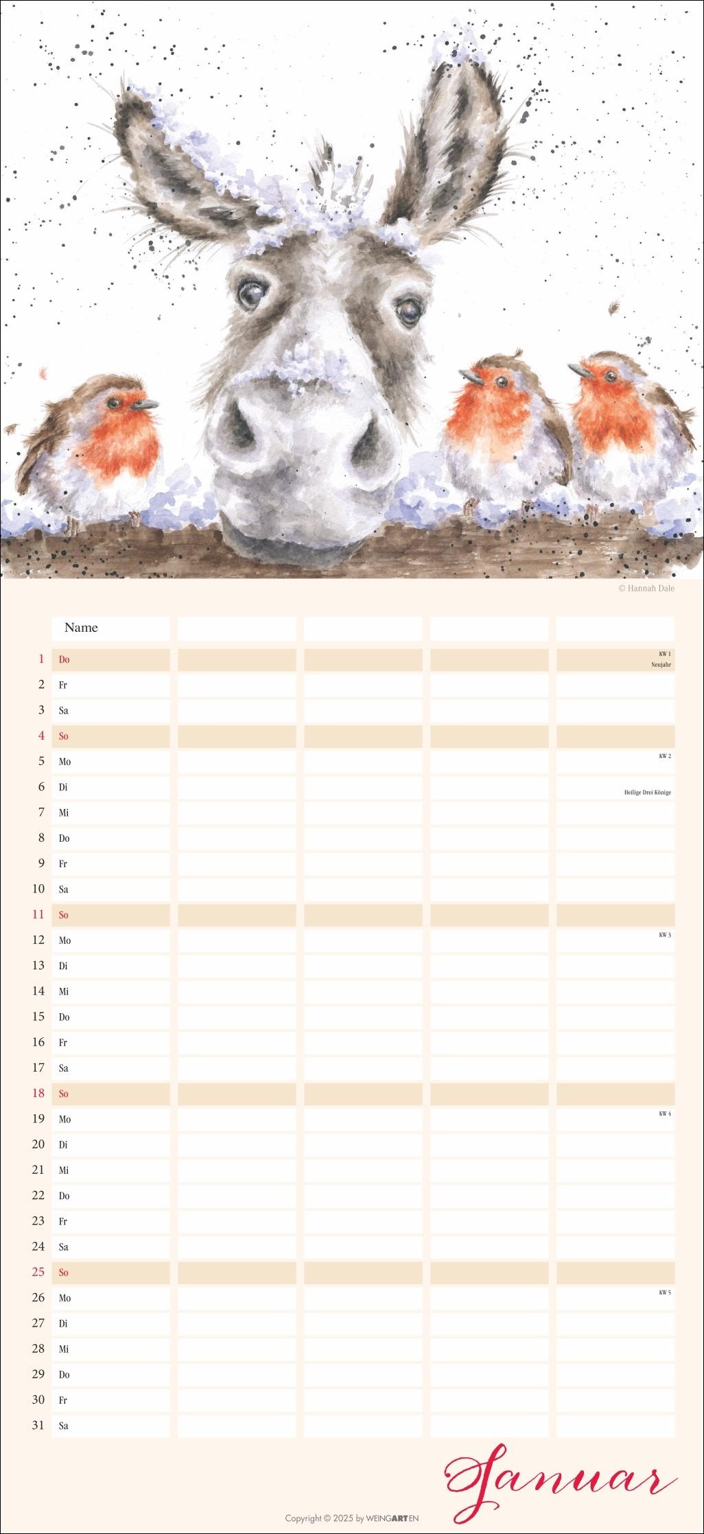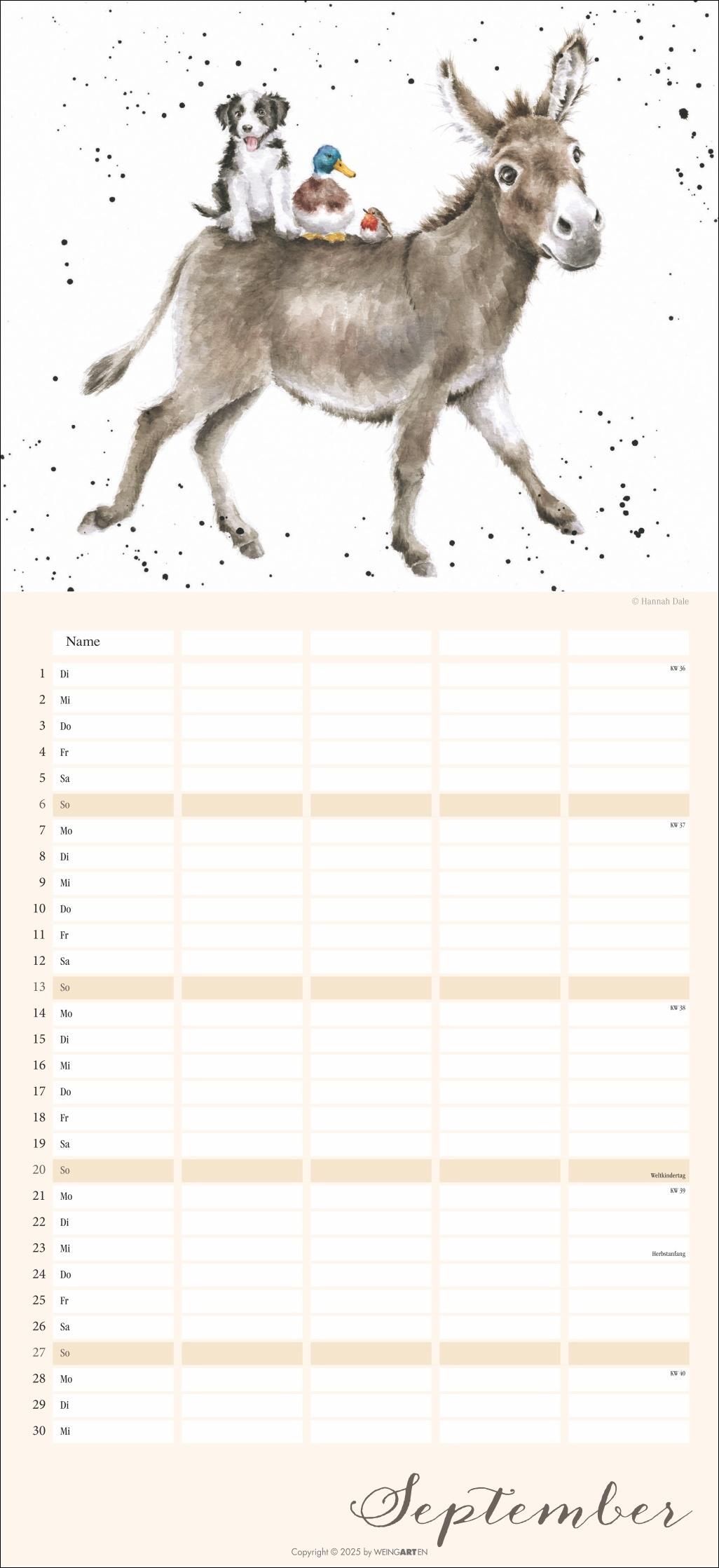 - Der Familienplaner 2026 für Tierfreunde von Jung bis Alt- Mit 12 herzerwärmenden Motiven von der Schafmama mit ihren Lämmern bis zur flauschigen Meerschweinchenbandee, aus der Feder der britischen Illustratorin Hannah Dale- Monat für Monat das Abenteuer Alltag meistern: Großer Familienkalender mit 5 Spalten Platz für alle wichtigen Termine, im praktischen 22x48 cm Hochformat- Ein Kalender für Familien, die das Rundum-Sorglos-Paket wollen: Mit Feiertagen, Schulferienübersicht und 3-Monats-Vorschau auf das neue Jahr- Tierisch gute Kalender: Die Marke Weingarten im Athesia Kalenderverlag