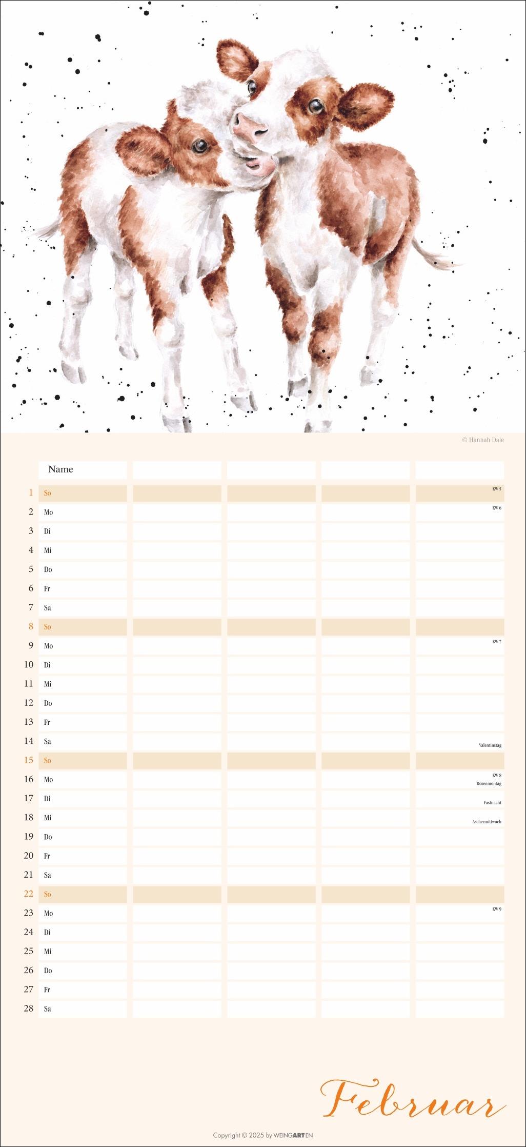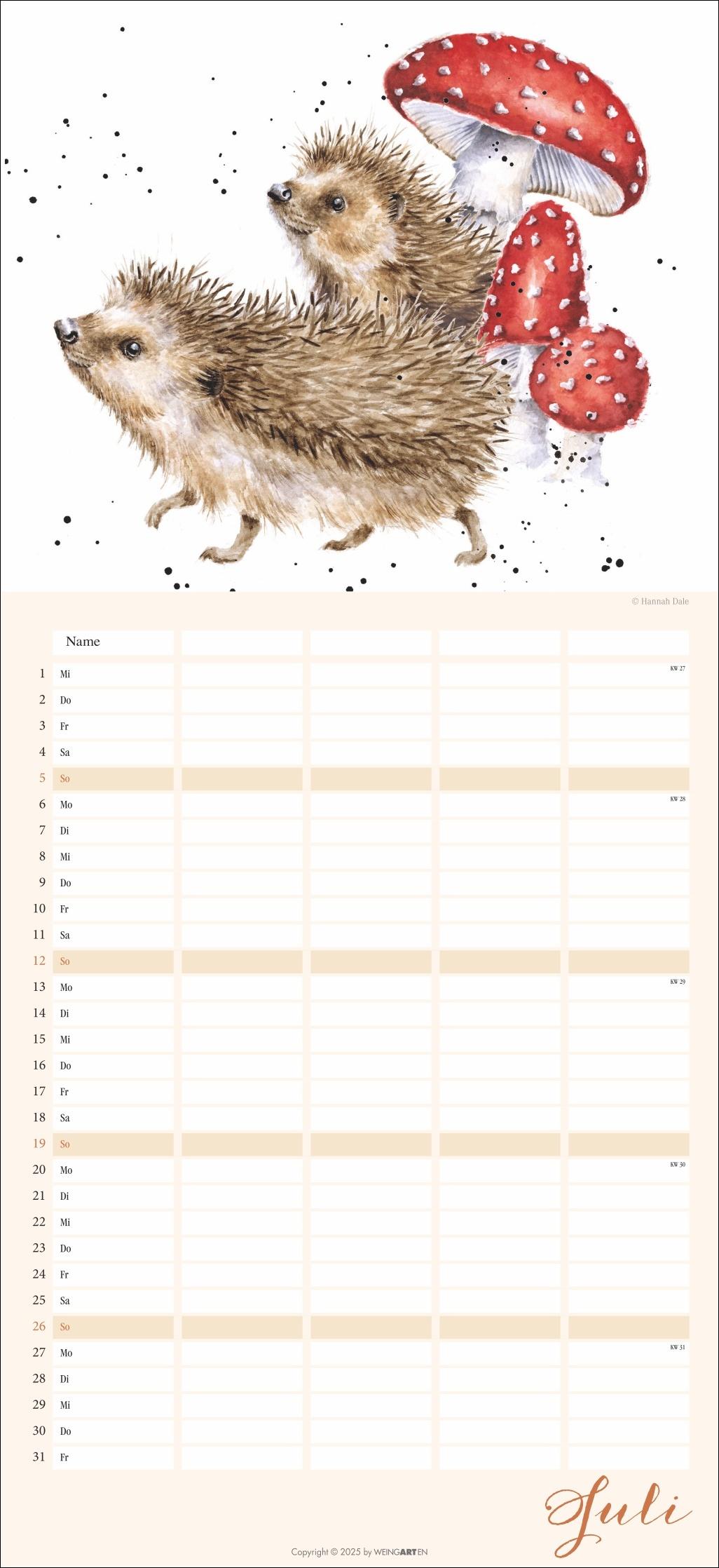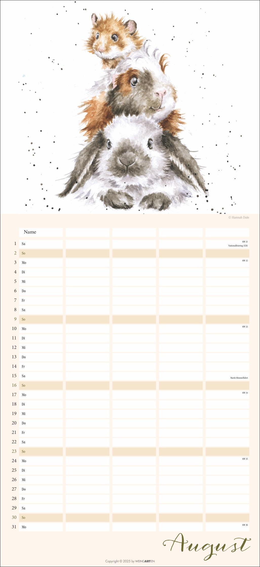 - Der Familienplaner 2026 für Tierfreunde von Jung bis Alt- Mit 12 herzerwärmenden Motiven von der Schafmama mit ihren Lämmern bis zur flauschigen Meerschweinchenbandee, aus der Feder der britischen Illustratorin Hannah Dale- Monat für Monat das Abenteuer Alltag meistern: Großer Familienkalender mit 5 Spalten Platz für alle wichtigen Termine, im praktischen 22x48 cm Hochformat- Ein Kalender für Familien, die das Rundum-Sorglos-Paket wollen: Mit Feiertagen, Schulferienübersicht und 3-Monats-Vorschau auf das neue Jahr- Tierisch gute Kalender: Die Marke Weingarten im Athesia Kalenderverlag