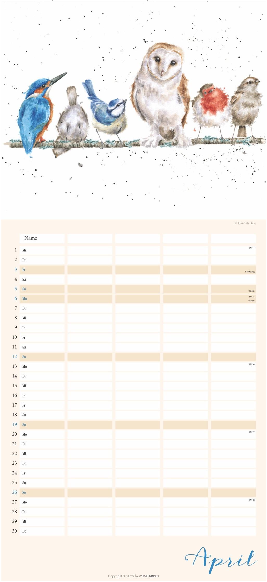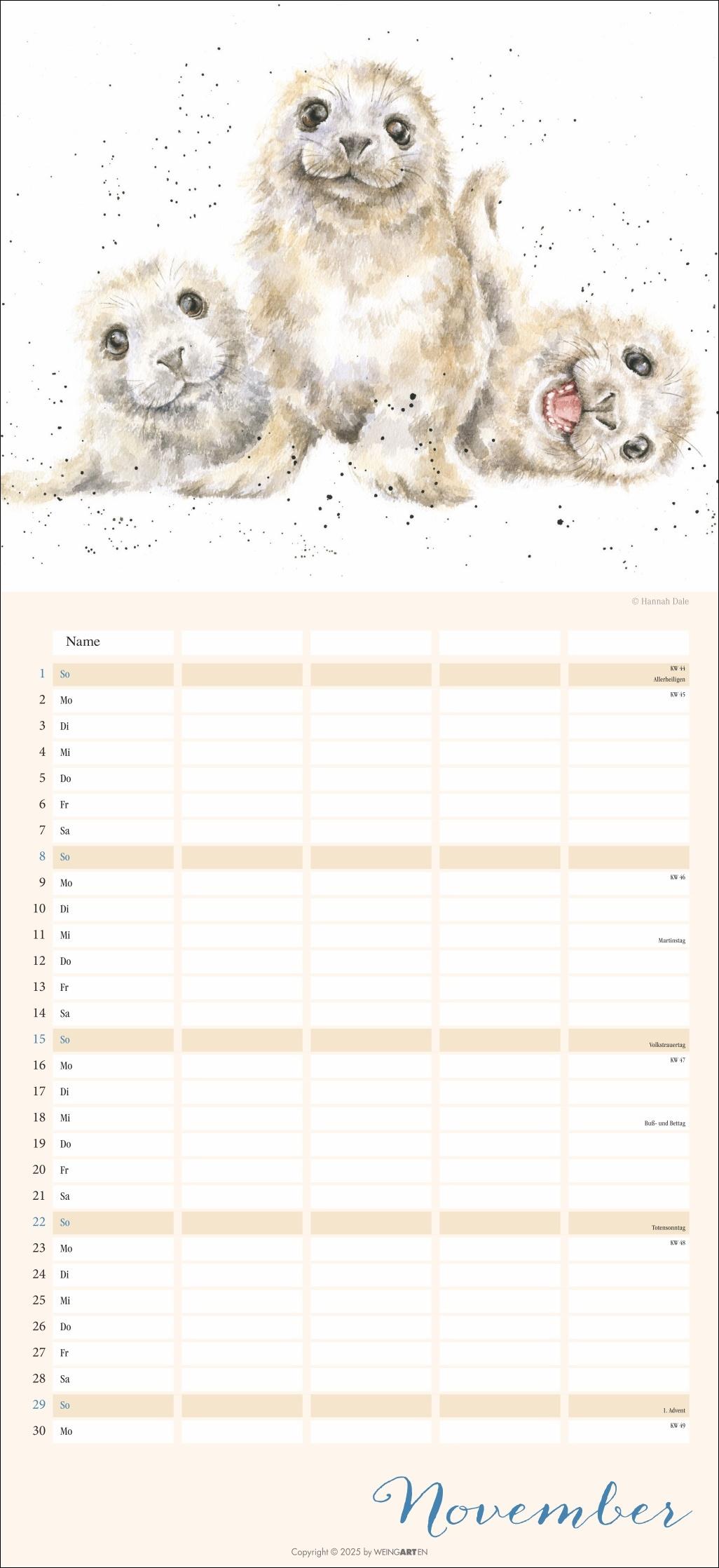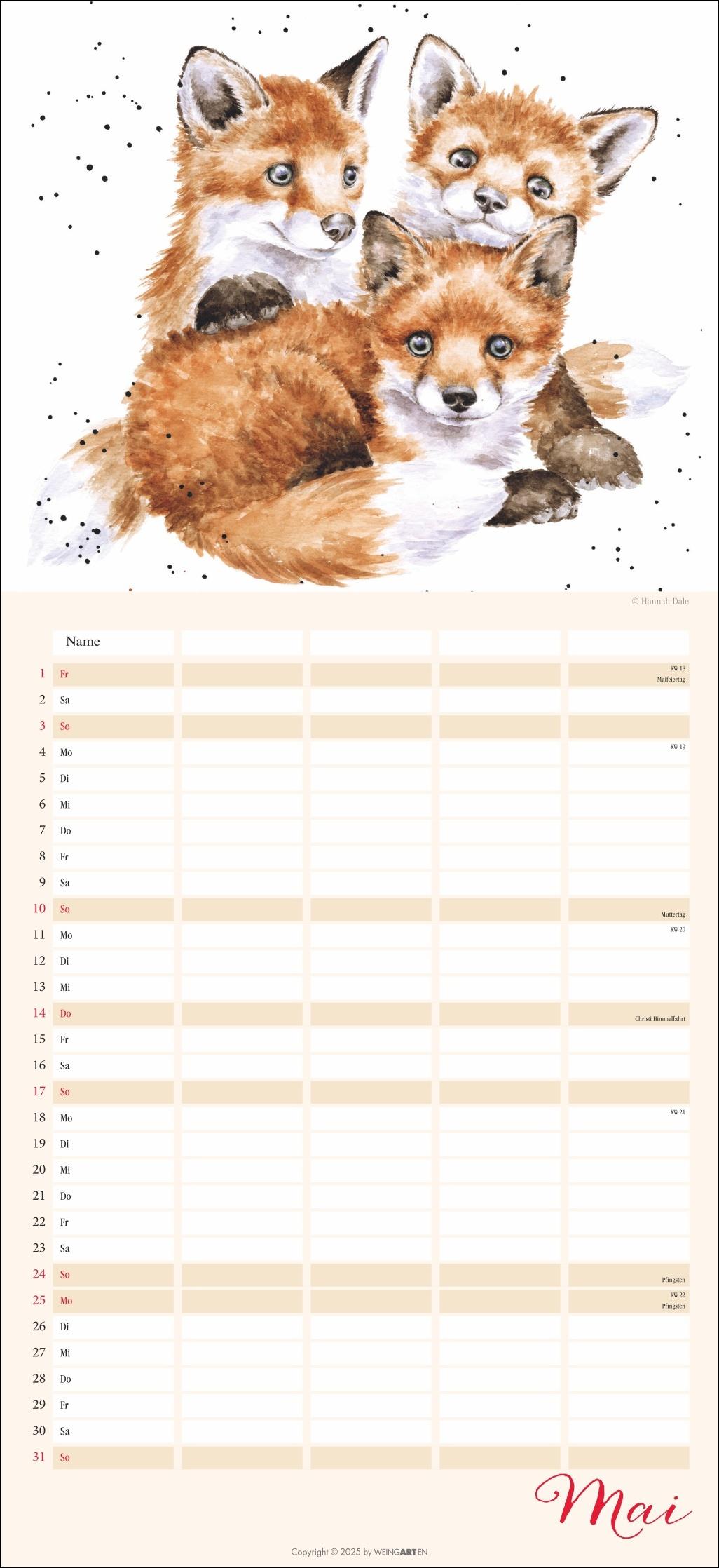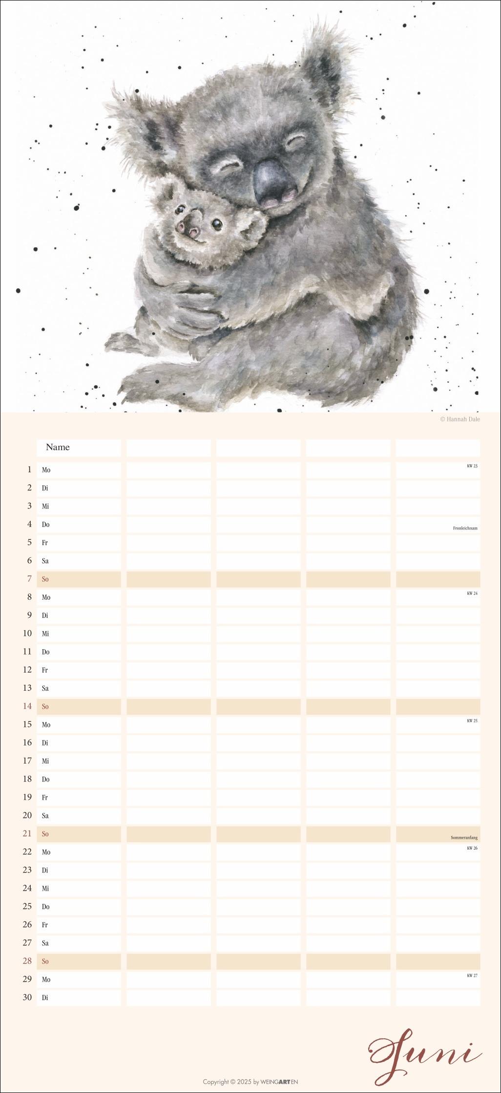 - Der Familienplaner 2026 für Tierfreunde von Jung bis Alt- Mit 12 herzerwärmenden Motiven von der Schafmama mit ihren Lämmern bis zur flauschigen Meerschweinchenbandee, aus der Feder der britischen Illustratorin Hannah Dale- Monat für Monat das Abenteuer Alltag meistern: Großer Familienkalender mit 5 Spalten Platz für alle wichtigen Termine, im praktischen 22x48 cm Hochformat- Ein Kalender für Familien, die das Rundum-Sorglos-Paket wollen: Mit Feiertagen, Schulferienübersicht und 3-Monats-Vorschau auf das neue Jahr- Tierisch gute Kalender: Die Marke Weingarten im Athesia Kalenderverlag