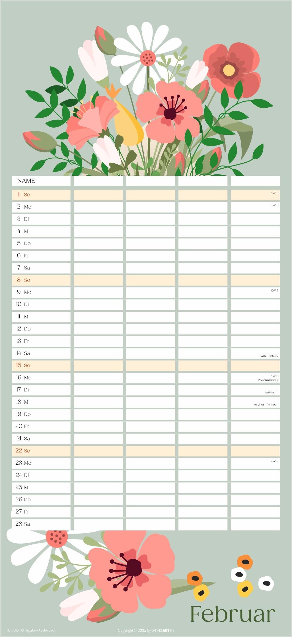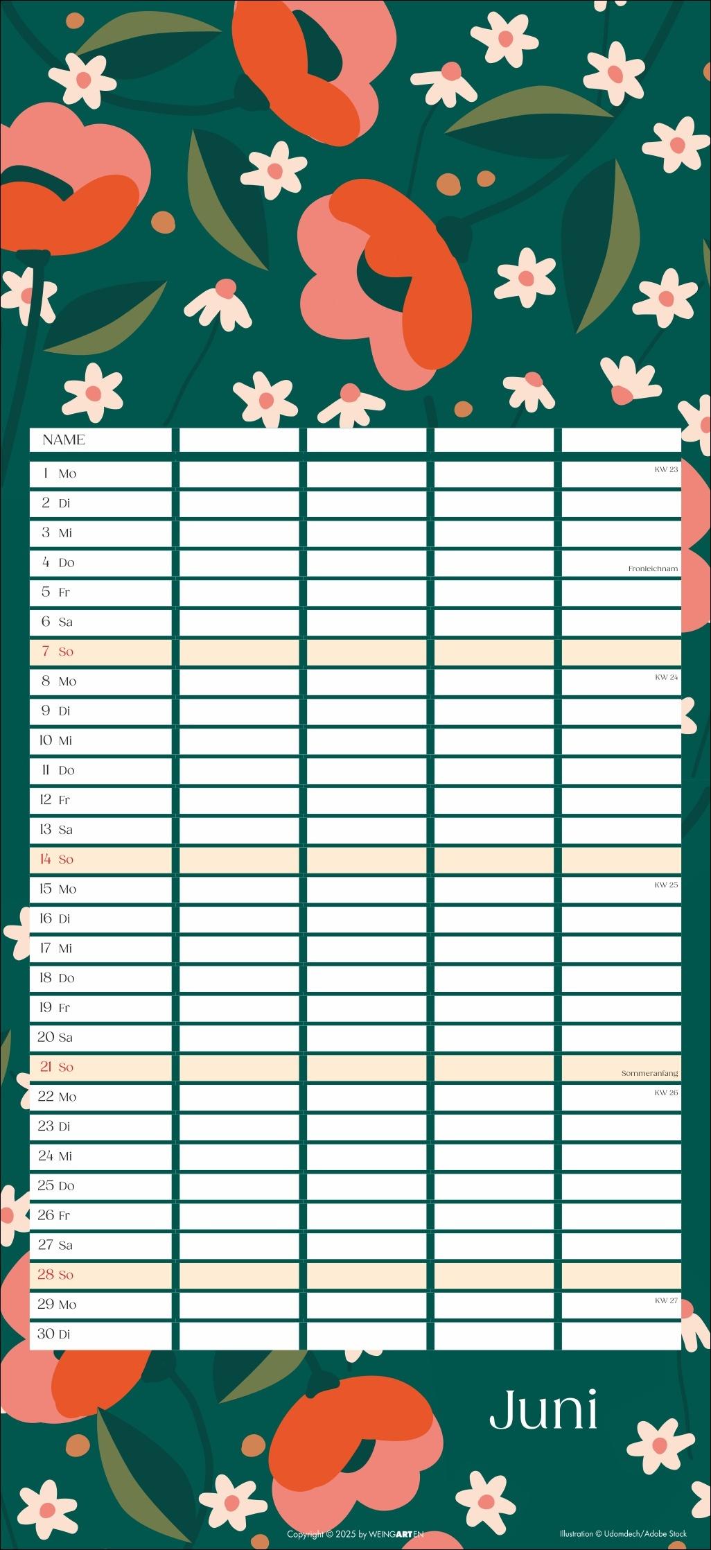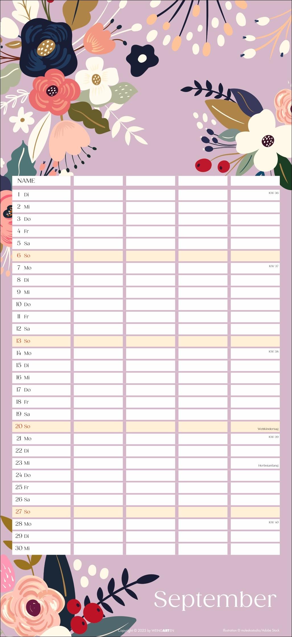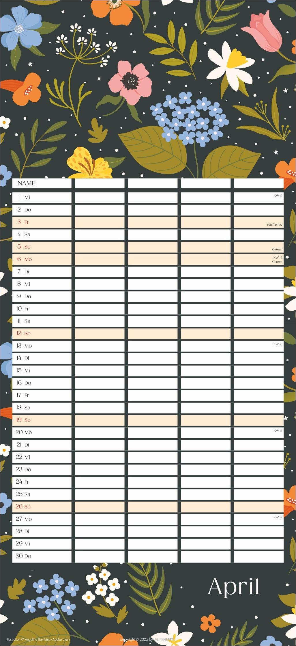 - Mit Flower-Power gegen Orga-Stress: Der "Floral total"-Familienplaner 2026 - Gute Laune garantiert: Ein kunterbunt designter Familienkalender mit Allover-Blumenprints für jeden neuen Monat - Gemeinsam das Abenteuer Alltag im Blick behalten: Großer Familienkalender mit 5 Spalten Platz im praktischen 22 x 48 cm Hochformat - Ein Kalender für Familien, die es gerne unkompliziert haben: Mit Schulferienübersicht und 3-Monats-Vorschau auf das neue Jahr - Tolle Designs für Jung und Alt: Kalender von Weingarten im Athesia Kalenderverlag