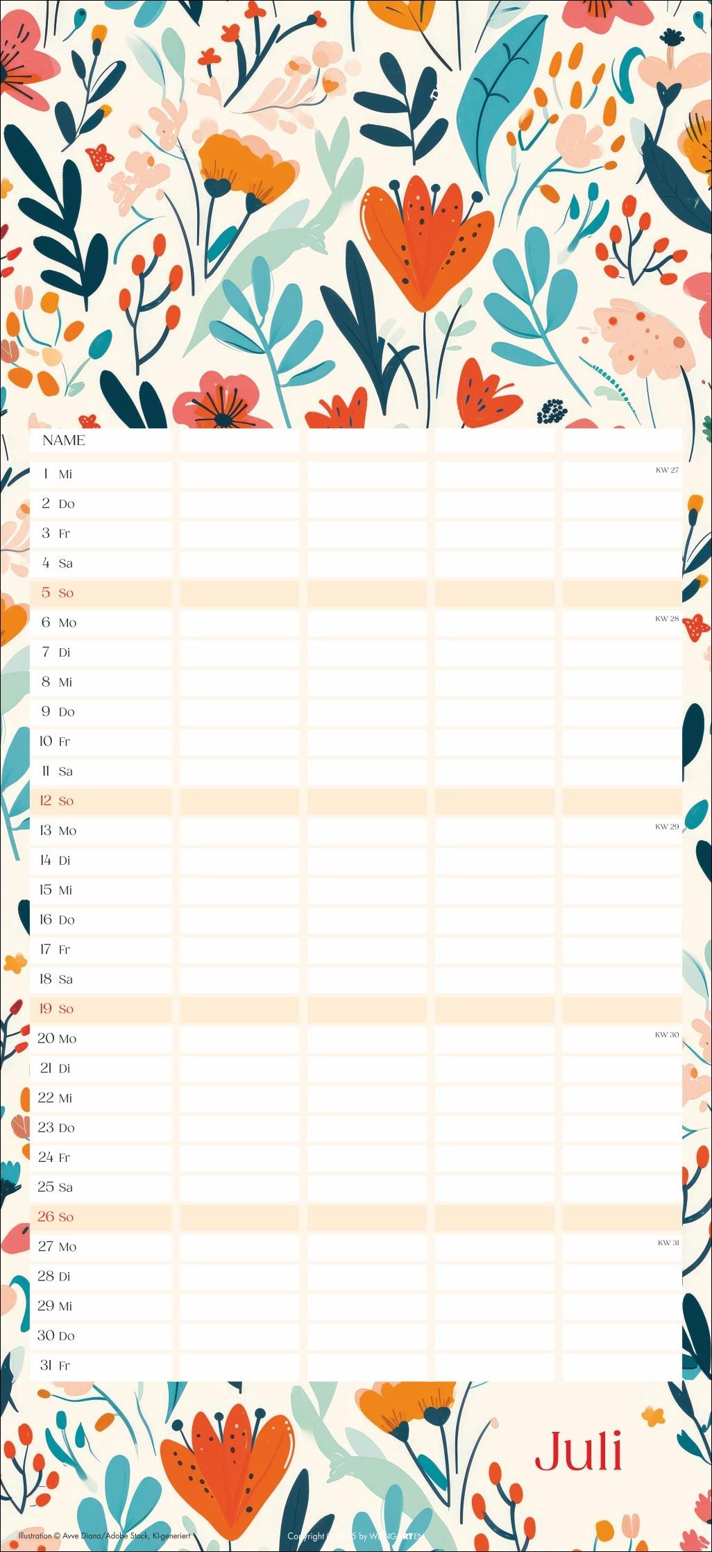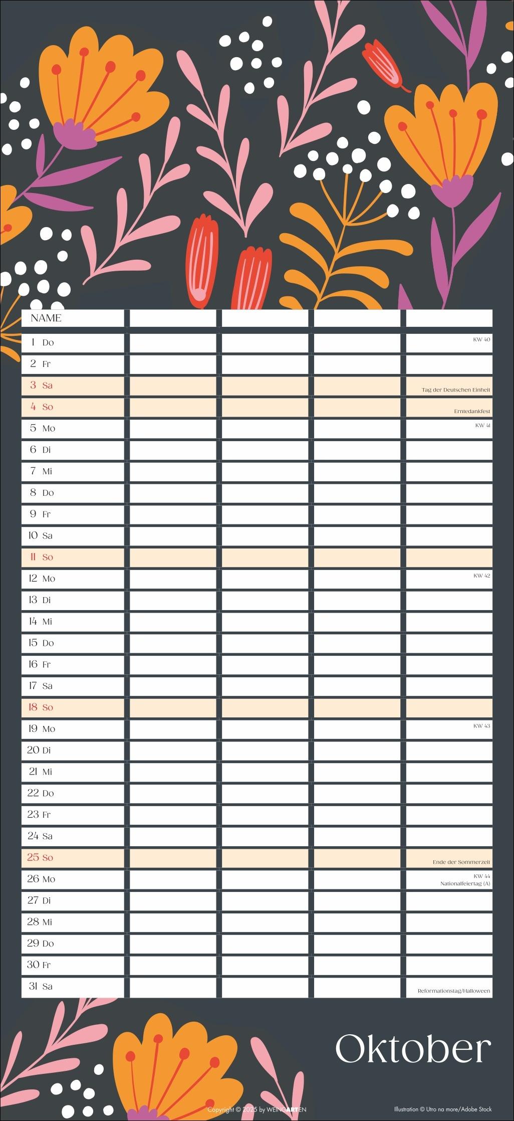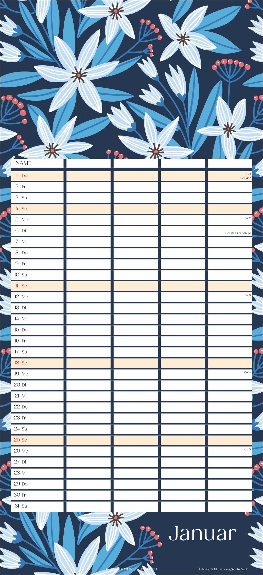 - Mit Flower-Power gegen Orga-Stress: Der "Floral total"-Familienplaner 2026 - Gute Laune garantiert: Ein kunterbunt designter Familienkalender mit Allover-Blumenprints für jeden neuen Monat - Gemeinsam das Abenteuer Alltag im Blick behalten: Großer Familienkalender mit 5 Spalten Platz im praktischen 22 x 48 cm Hochformat - Ein Kalender für Familien, die es gerne unkompliziert haben: Mit Schulferienübersicht und 3-Monats-Vorschau auf das neue Jahr - Tolle Designs für Jung und Alt: Kalender von Weingarten im Athesia Kalenderverlag