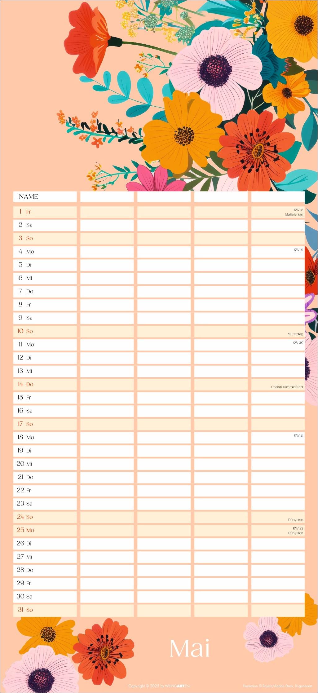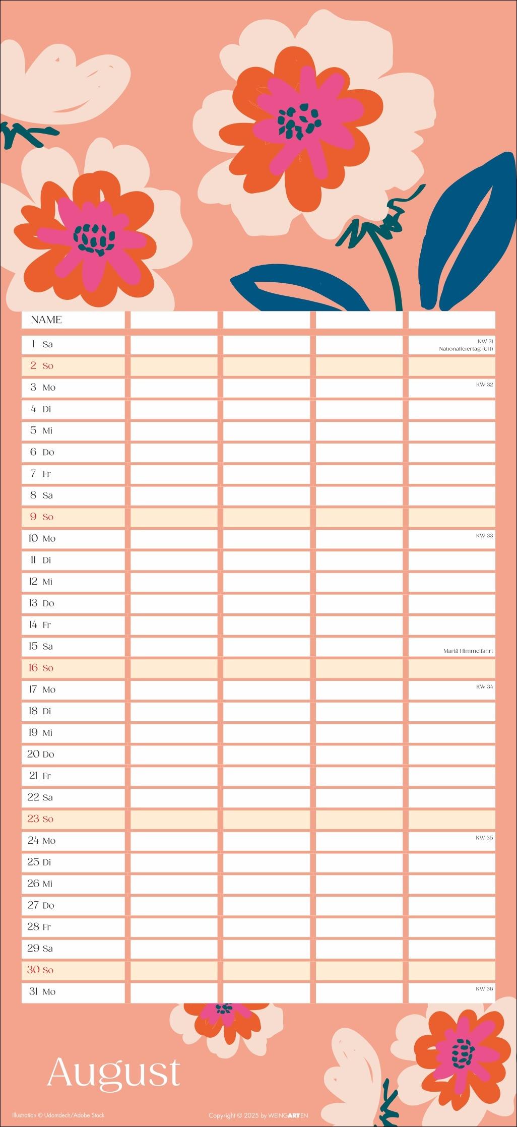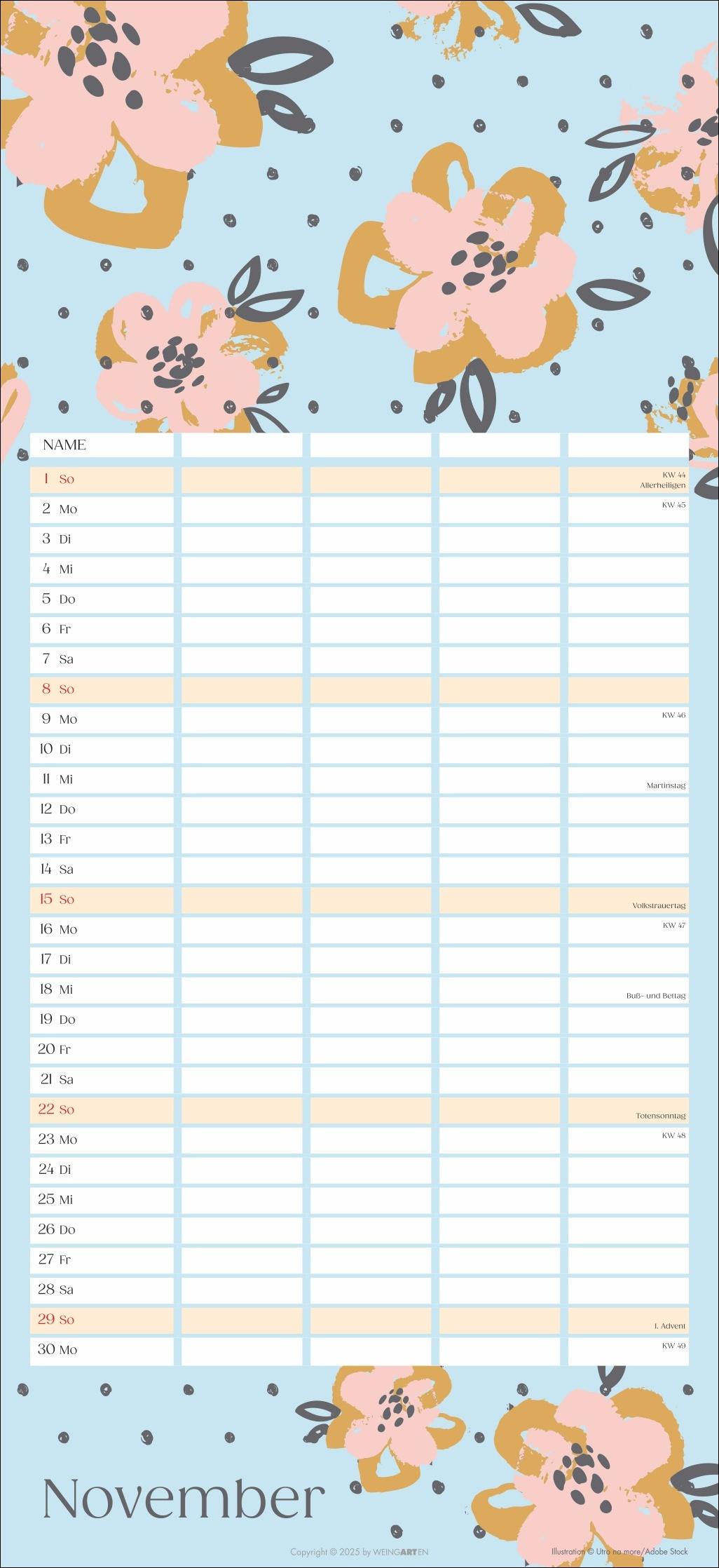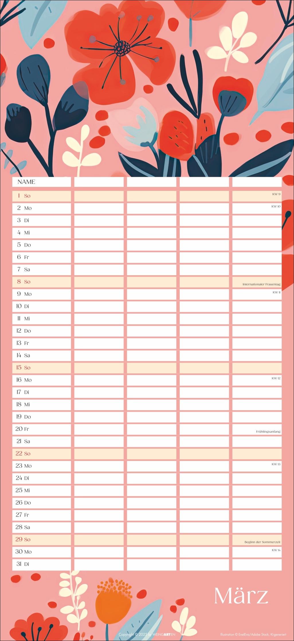 - Mit Flower-Power gegen Orga-Stress: Der "Floral total"-Familienplaner 2026 - Gute Laune garantiert: Ein kunterbunt designter Familienkalender mit Allover-Blumenprints für jeden neuen Monat - Gemeinsam das Abenteuer Alltag im Blick behalten: Großer Familienkalender mit 5 Spalten Platz im praktischen 22 x 48 cm Hochformat - Ein Kalender für Familien, die es gerne unkompliziert haben: Mit Schulferienübersicht und 3-Monats-Vorschau auf das neue Jahr - Tolle Designs für Jung und Alt: Kalender von Weingarten im Athesia Kalenderverlag