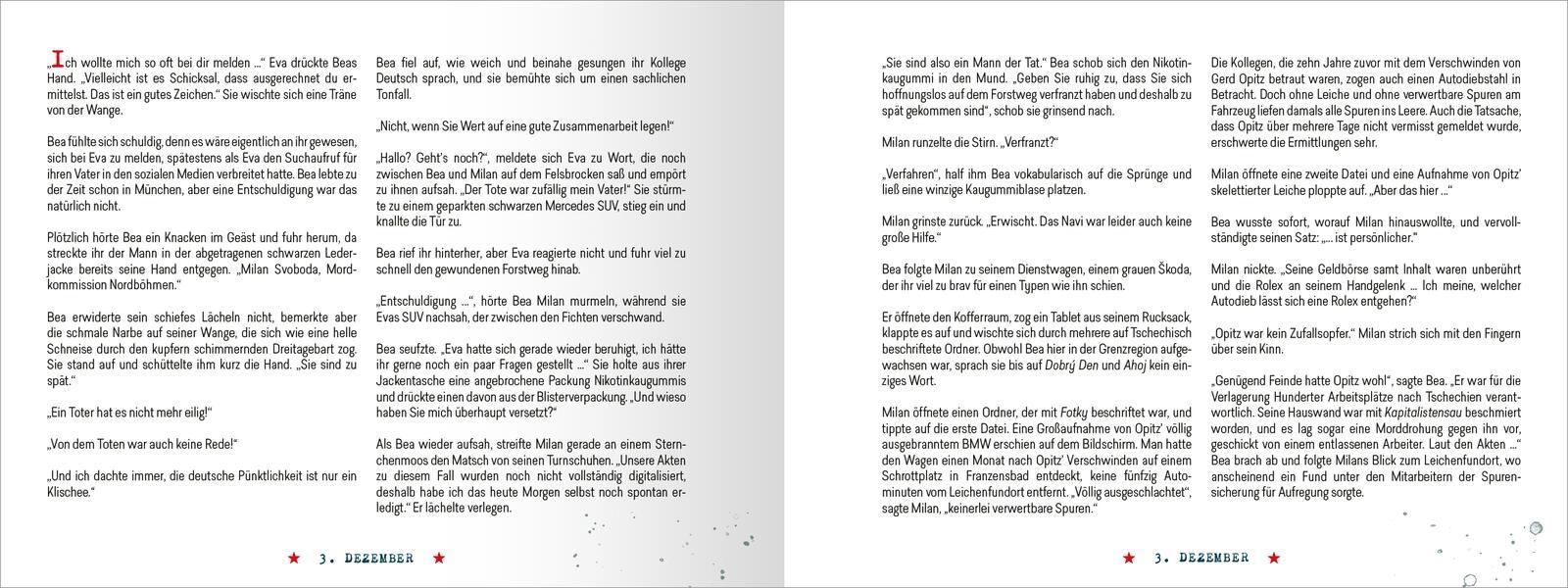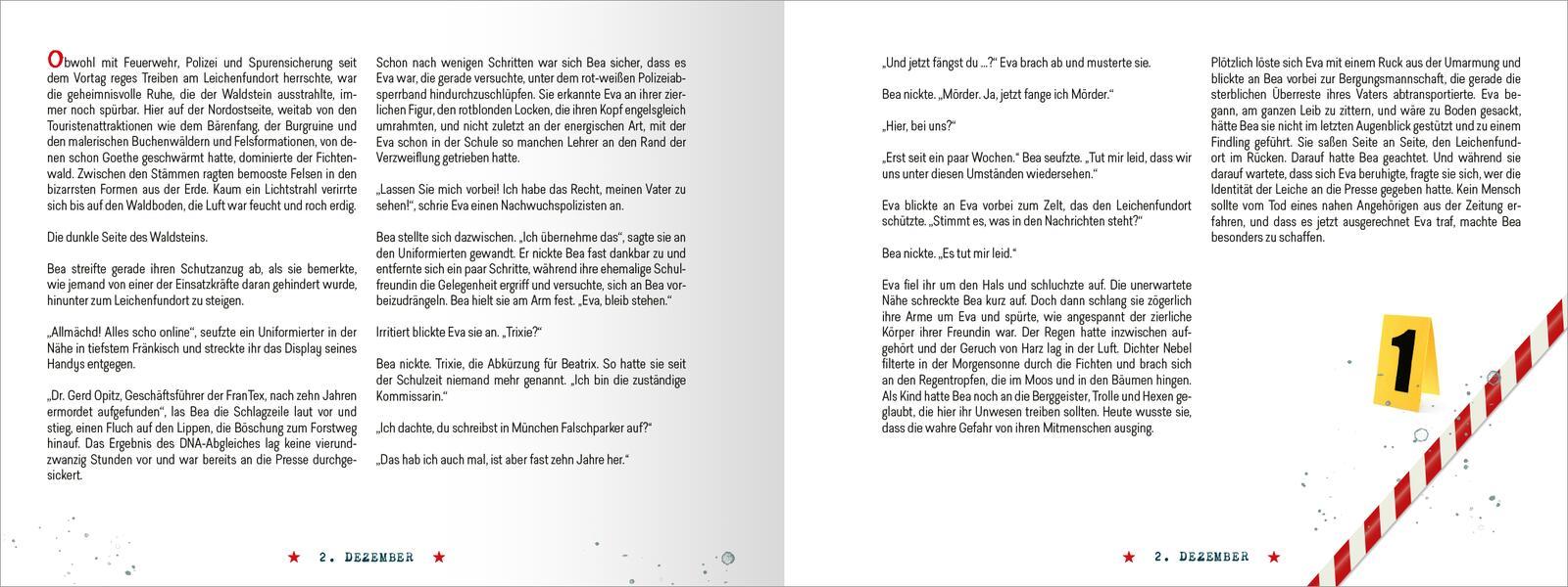 Der Adventskalender mit Spannungsfaktor - eine unterhaltsame Krimigeschichte in 24 Teilen Kriminalkommissarin Bea Römer ist gerade erst in ihre fränkische Heimat zurückgekehrt, als eine skelettierte Leiche im Grenzgebiet zwischen Franken und Böhmen aufgefunden wird. Der Fall wird schnell persönlich, denn bei dem Toten handelt es sich um den Vater einer ehemaligen Schulfreundin. Bea Römer und ihr tschechischer Kollege Milan Svoboda ermitteln gemeinsam und stoßen auf tödliche Ungereimtheiten auf beiden Seiten der Grenze ... Adventszeit ist Krimizeit: 24 spannende Thriller-Episoden Origineller Adventskalender: Jeden Tag kann eine der seitlich geschlossenen Seiten aufgeschnitten oder aufgetrennt werden. Geschenkidee für alle Krimifans: Eine schöne Überraschung für die beste Freundin, den Bruder, den Partner, die Lieblingskollegin und alle, die gern Spannungsliteratur lesen Für einen entspannten Advent: Entfliehe der Weihnachtshektik und gönne dir jeden Tag eine kurze Lesepause. Qualität in Ausstattung und Optik: Hochwertiges Hardcover-Buch (20,5 cm x 15,6 cm) mit coolen Illustrationen Ein originelles Krimi-Adventsvergnügen für schaurig schöne Stunden in der Weihnachtszeit!