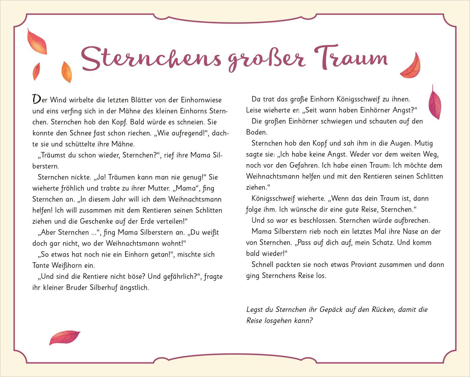 Ein zauberhafter Adventskalender mit 24 spannenden Geschichten und tollen Stickern zum Aufstellen und Mitmachen. Das kleine Einhorn Sternchen hat einen Traum: Sie möchte zum Nordpol fliegen und dem Weihnachtsmann bei den Vorbereitungen auf das Weihnachtsfest helfen. Doch der Weg ist weit und auch im Weihnachtsdorf angekommen warten viele Abenteuer und Herausforderungen auf das kleine Einhorn und seine Freundinnen und Freunde.Magische Einhorn-Weihnachtszeit