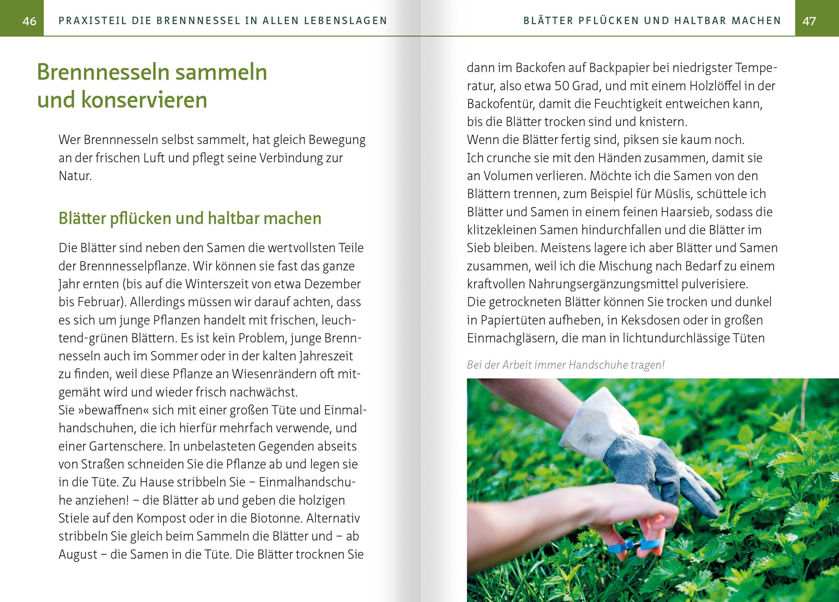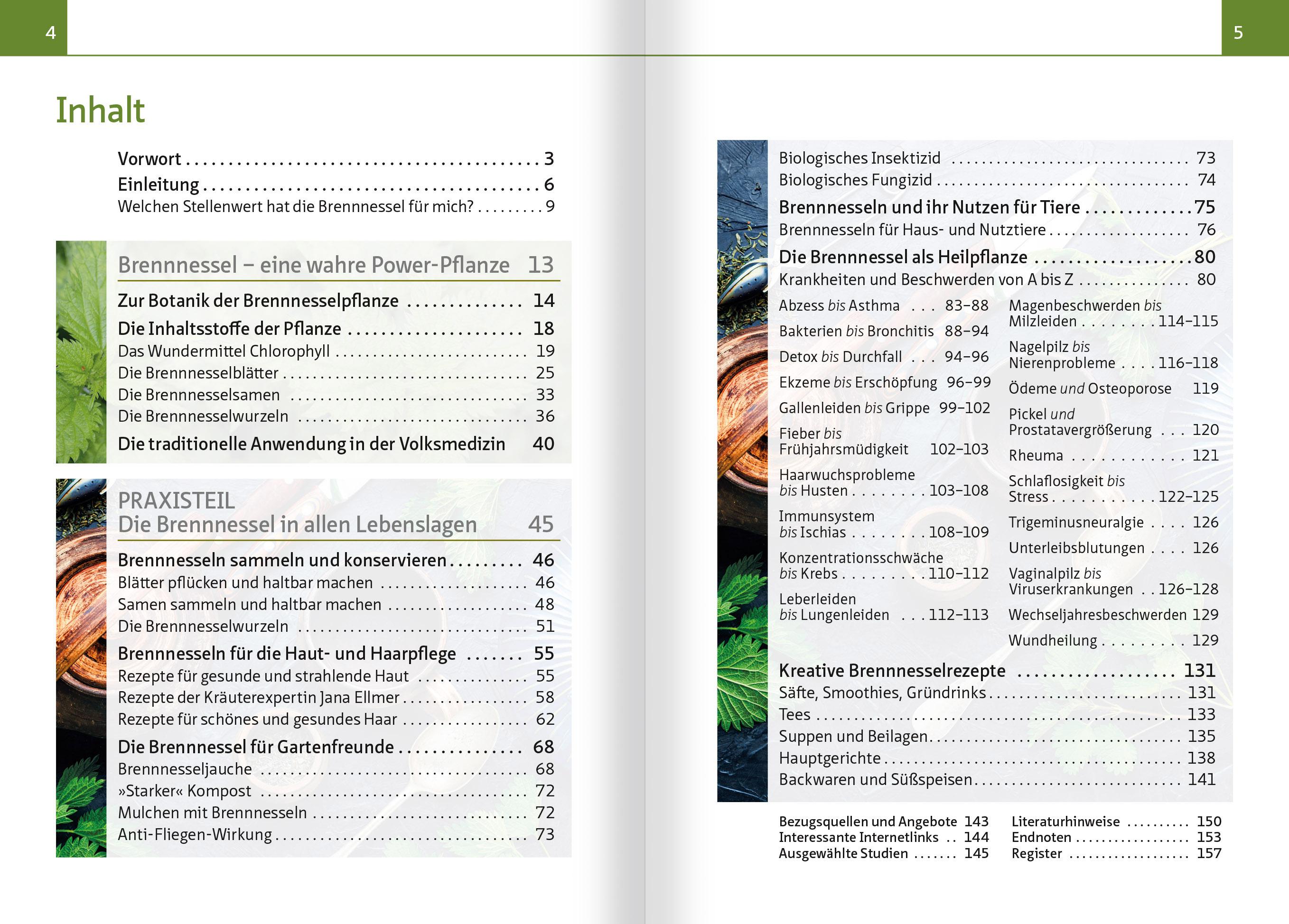 Der verkannte Schatz aus Ihrem Garten"Königin der Beikräuter" - dieser Ehrentitel wurde der Brennnessel von Rudolf Steiner verliehen. Warum? Sie spielt nicht nur ökologisch eine wichtige Rolle - Insekten und Vögel fliegen auf sie, und sie dient als Raupenfutterpflanze für über 30 Falterarten -, auch uns Menschen bietet sie als Heilpflanze eine beispiellose Fülle an gesunden Inhaltsstoffen.So finden wir im Brennnesselkraut Karotinoide für die Augen und als Immunbooster, die Vitamine aus der B-Gruppe für gute Nerven, Vitamin E für Fruchtbarkeit und als Radikalenfänger, Vitamin K für gesunde Knochen und Wundheilung. Die Flavonoide in der Brennnessel schützen Blutgefäße und Herz, Pflanzensäuren wirken entzündungshemmend und schmerzlindernd, Chlorophyll ist wichtig für Entgiftung und Abwehr, die Aminosäuren unterstützen den Zell- und Muskelaufbau. An Mineralstoffen kann die Brennnessel mit Kalzium, Kalium, Phosphor, Chlor, Magnesium, Silizium, leicht verwertbarem Eisen und den seltenen Spurenelementen Mangan, Bor und Kupfer punkten. Sogar Gold finden wir in Spuren! Diese Mineralstoffe sind äußerst wichtig zur Energiegewinnung, für das Immunsystem, den Wasser- und Säure-Basen-Haushalt, für Blutbildung, Knochen und Zähne. Es findet sich sogar das stimmungsaufhellende Serotonin in dieser unterschätzten Pflanze! - Heilwirkungen der Brennnessel: von Akne und Blutarmut über Haarprobleme und Hauterkrankungen bis hin zu Wechseljahresbeschwerden und Zahnfleischentzündung- Anwendungen und Zubereitungen für die Hausapotheke- Nützliche Tipps für Garten-, Pflanzen- und Tierfreunde- Extra: Brennnessel-Rezepte für die gesunde KücheÜbrigens: Die Brennnessel wurde zur "Heilpflanze des Jahres 2022" gekürt.