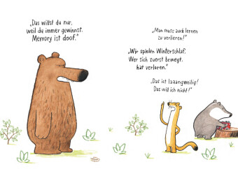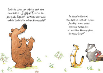 Als das Wiesel nach Hause kommt, traut es seinen Augen kaum: Bär und Dachs spielen miteinander. Das Wiesel ist sauer. Denn Dachs ist sein Freund! "Spiel doch mit", schlägt der Dachs vor, doch Bär und Wiesel können sich nicht einigen, nicht auf Fußball, nicht auf Memory oder Verstecken: "Immer willst du der Bestimmer sein!", sagt das Wiesel. "Mit dir kann man einfach nicht spielen!", sagt Bär. Irgendwann muss Dachs nach Hause ...Sich als Gruppe zusammenzufinden, ist nicht einfach. Wer darf mitspielen und wer nicht? Und wer bestimmt das überhaupt? Dieses Bilderbuch erzählt mit Augenzwinkern von einer Situation, die jedes Kind kennt.