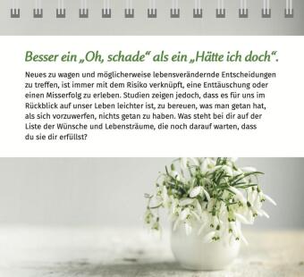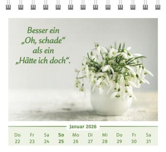 Der Lebensfreude-Tischkalender 2026, zum Aufstellen, mit Wire-O-Bindung/Spiralbindung. Aufbauende Denkanstöße, Sprüche und positive Gedanken, motivierende und leicht verständliche psychologische Impulstexte und Anregungen. Mit atmosphärischen Naturfotos. Durchgehend vierfarbig/4c mit 10-Tage-Kalendarium. 10. Auflage 2025 (Aufl. 1: 2017)