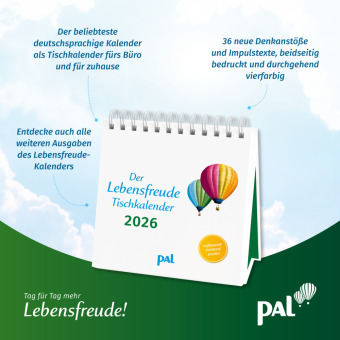 Der Lebensfreude-Tischkalender aus dem PAL-Verlag: Motivierende Sprüche und liebevolle AnregungenDer Lebensfreude-Kalender zum Aufstellen: Positive Gedanken, die das ganze Jahr Kraft und Zuversicht schenken - im Büro und zuhause36 Denkanstöße, mit psychologisch fundierten Ratschlägen, Lebensweisheiten und schönen