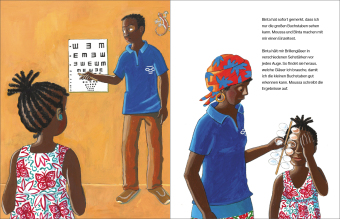 Fatouma kann gut malen, aber sie lernt nicht, wie man richtig schreibt und liest, denn sie erkennt die Buchstaben an der Tafel nicht. Alles, was weiter weg ist, sieht sie unscharf. Bis eines Tages Optiker in ihre Schule kommen. Die können allen Schulkindern, die schlecht sehen, noch am gleichen Tag die passende Brille geben! Außerdem sieht die Brille auch schön aus. Für Fatouma ist das wie ein Wunder.Für Kinder ab 5 Jahren.