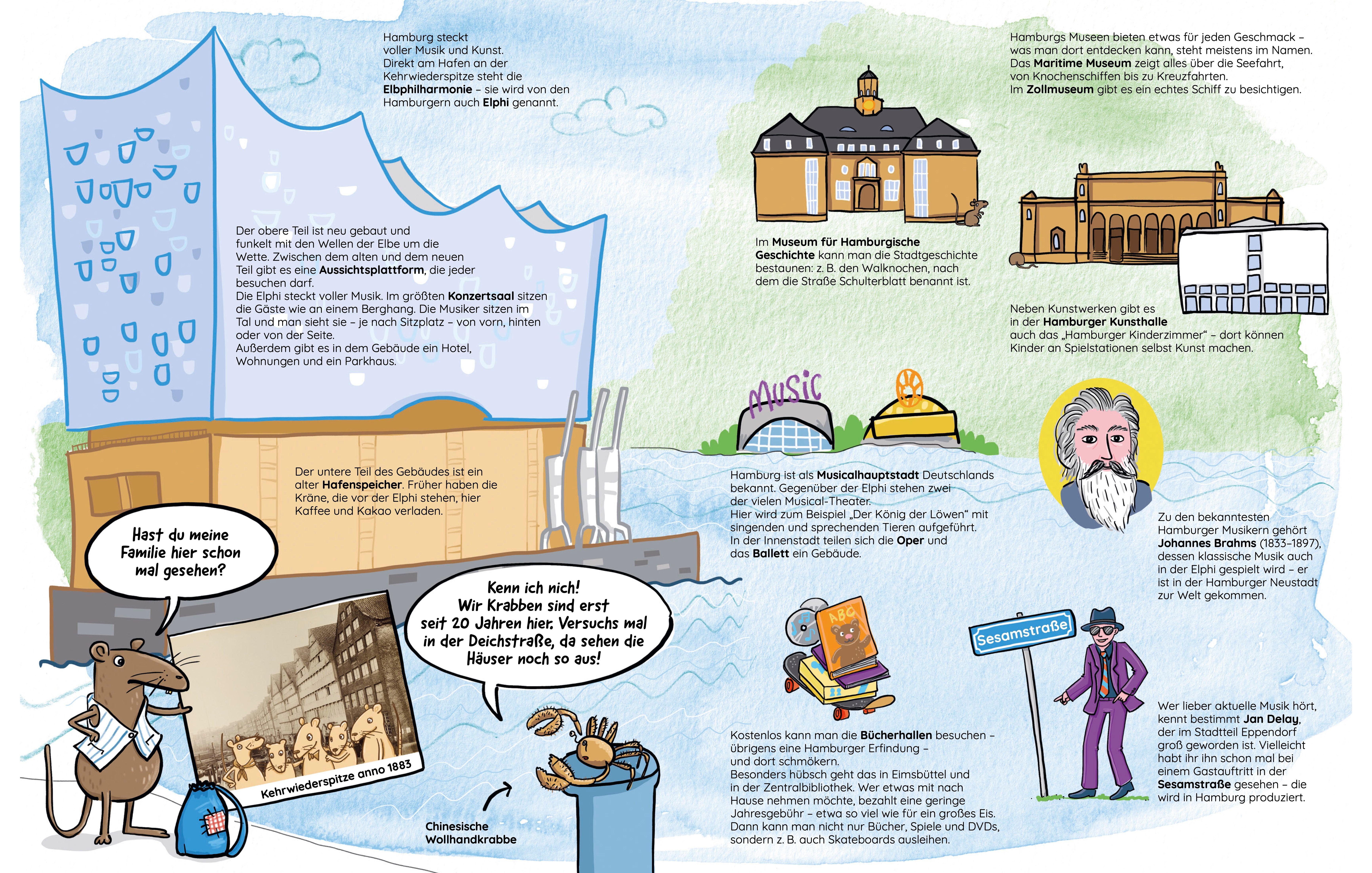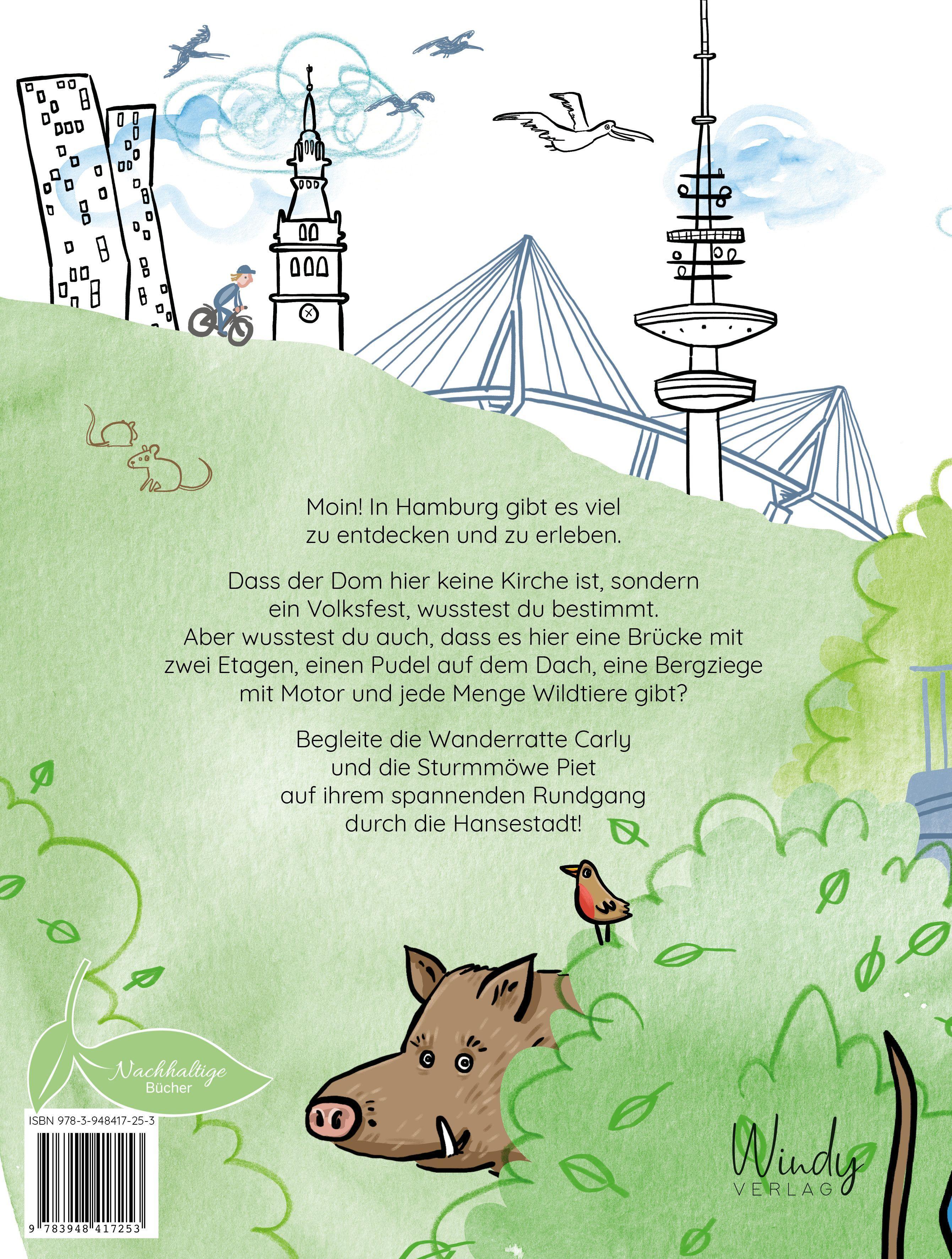 Gemeinsam Hamburg erkunden: Kindersachbuch mit tierisch starken StadtführernCarly Miller, die Wanderratte, ist auf der Suche nach ihren Wurzeln nach Hamburg gekommen. Sturmmöwe Piet hilft ihr, ihre Verwandten zu finden, und zeigt ihr dabei die vielen Sehenswürdigkeiten, die die Hafenstadt zu bieten hat.Die Liste reicht von beeindruckend bis kurios: So gibt es hier zum Beispiel mehr Brücken als in Venedig und Amsterdam zusammen. Und der Hamburger Dom ist keine große Kirche, sondern ein rauschendes Volksfest! Dazu gilt es noch witzige Details, wie Pudelstatuen an Hauswänden, zu entdecken.- Stadtrundgang durch Hamburg: Entdeckungstour für Kindergarten- und Schulkin-der- Eingebettet in ein Abenteuer: Kann Carly mit Piets Hilfe ihre Familie finden? - Die Alster, Platt und Freizeitangebote: was die Hansestadt so besonders macht- Mit originellen Illustrationen, kurzen Texten, einer Stadtkarte und viel Lokalkolorit- Perfekt für Neubürger und Hamburger Familien!Eine Stadt voller Überraschungen und eine Möwe als ReiseleiterAuf der Suche nach Carlys Familie kommt das tierische Duo an zahlreichen Hamburger Sehenswürdigkeiten vorbei. Dabei erzählt Piet über die historischen Hintergründe von Gebäuden und Orten. So kann Wanderratte Carly schließlich nicht nur ihre Verwandten in die Arme schließen, sie ist nach der Tour auch bestens über die schöne Hansestadt informiert!Ein Kinderreiseführer, der zu Entdeckungen einlädt - im Buch und in Hamburg selbst!