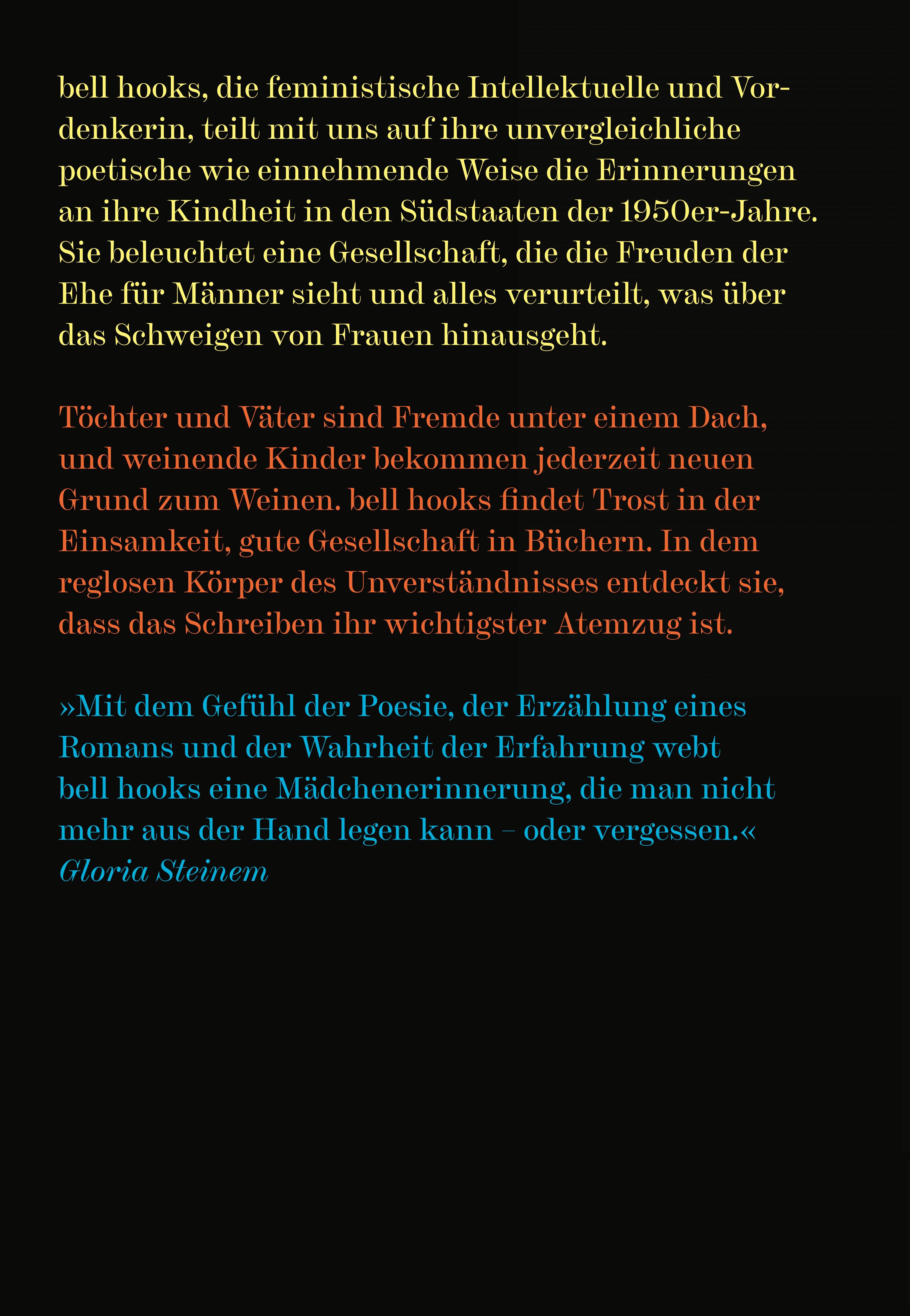 bell hooks, die feministische Intellektuelle und Vordenkerin, präsentiert in den Erinnerungen an ihre Kindheit einen kraftvollen, intimen Bericht über das Aufwachsen in den Südstaaten der 50er-Jahre. Es ist ein intensives Buch über Ideen und Wahrnehmungen. Es zeigt die Entfaltung weiblicher Kreativität und den Weg eines temperamentvollen Kindes, das mehr und mehr zur Schriftstellerin wird. Schon früh lernt bell hooks, welche Rolle Frauen und Männer in der Gesellschaft zu übernehmen haben und vor allem, wie emotional verletzlich Kinder sind. Sie wirft ein starkes Licht auf eine Gesellschaft, die die Freuden der Ehe für Männer sieht und alles verurteilt, was über das Schweigen von Frauen hinausgeht. Töchter und Väter sind Fremde unter einem Dach, und weinende Kinder bekommen jederzeit neuen Grund zum Weinen. bell hooks findet Trost in der Einsamkeit, gute Gesellschaft in Büchern. In dem reglosen Körper des Unverständnisses entdeckt sie, dass das Schreiben ihr wichtigster Atemzug ist.