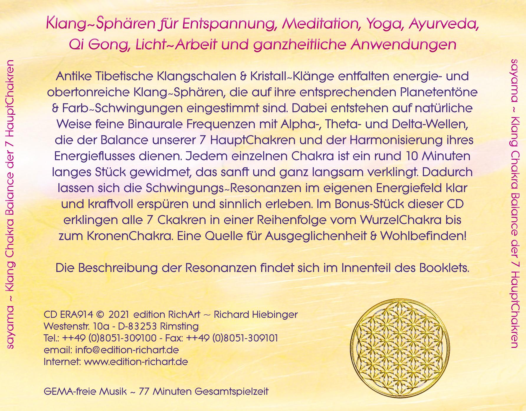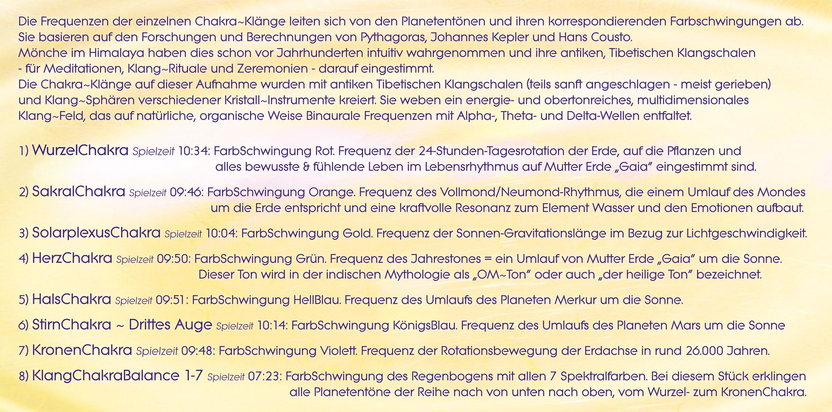 Die Frequenzen der einzelnen Chakra~Klänge leiten sich von den Planetentönen und ihren korrespondierenden Farbschwingungen ab. Sie beruhen auf den Forschungen und Berechnungen von Pythagoras, Johannes Kepler und Hans Cousto. Mönche im Himalaya haben diese Frequenzen schon vor Jahrhunderten intuitiv wahrgenommen und ihre antiken tibetischen Klangschalen für Meditationen, Klangrituale und Zeremonien darauf eingestimmt. Die Chakra~Klänge auf diesen Aufnahmen entstanden durch genau solche Klangschalen, die teils sanft angeschlagen, meist aber gerieben wurden, sowie durch Klangsphären verschiedener anderer Kristallinstrumente. Sie weben ein energie- und obertonreiches, multidimensionales Klangfeld, das auf natürliche, organische Weise binaurale Frequenzen mit Alpha-, Theta- und Delta-Wellen entfaltet.