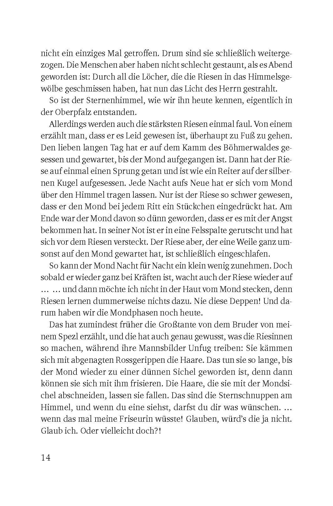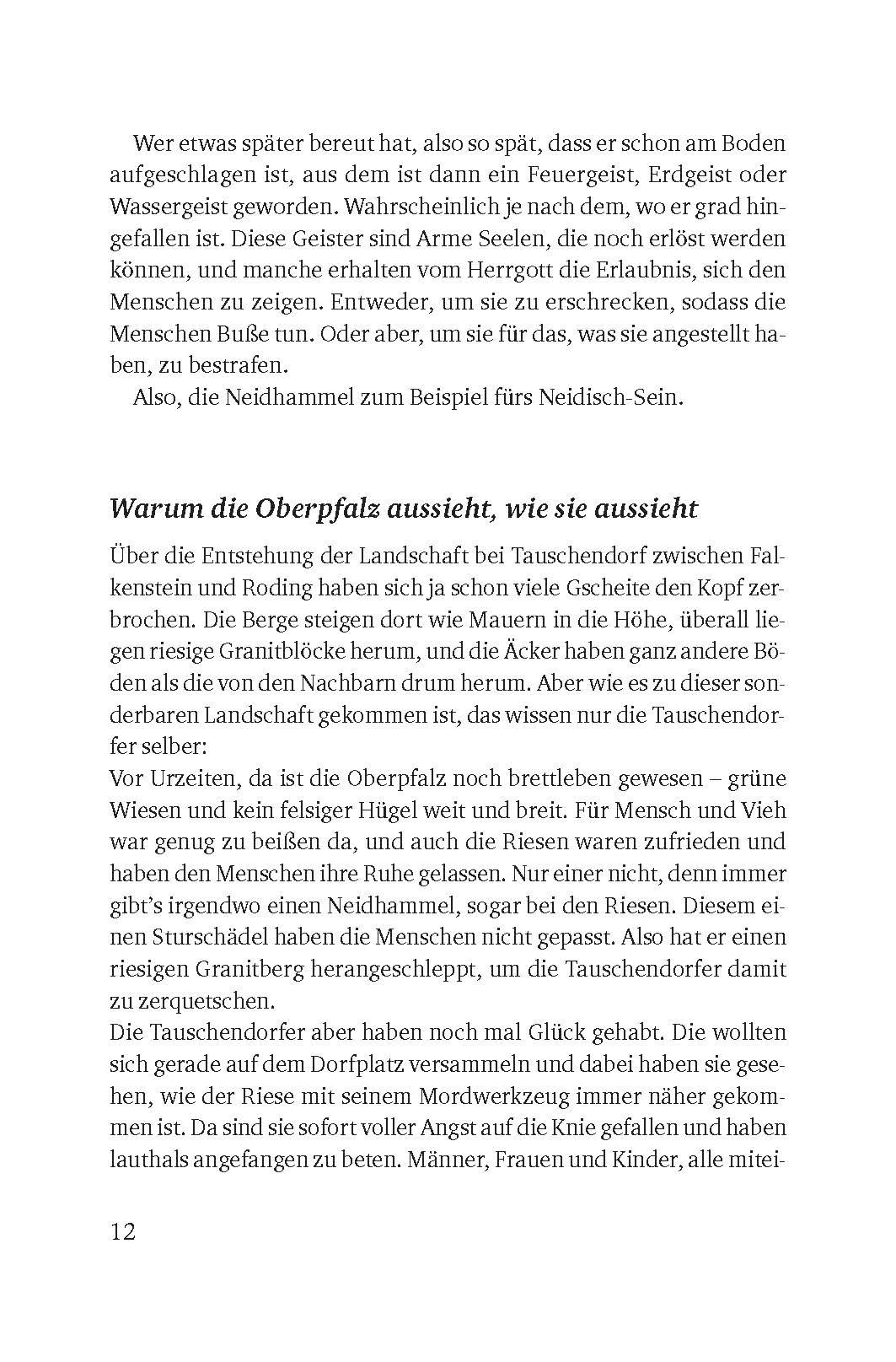 Hand aufs Herz: Wer kennt noch die Geschichten von Riesen und Zwergen, die die Oberpfalz bevölkert haben? Oder die vom heiligen Petrus, der in der Oberpfalz ein paar zünftige Watschn kassiert hat? Selbst der Sternenhimmel ist in der Oberpfalz entstanden und Wasserfrauen haben hier schon manche Hochzeitsnacht platzen lassen. Die Oberpfalz ist voll von Sagen, Märchen und Legenden! Über Generationen wurden sie weitergegeben, wie es Tradition war: Sie wurden erzählt. Vor allem in den Rockenstuben, wo ganze Familien wochenlang zusammensaßen, um in mühevoller Handarbeit aus Wolle oder Flachs Garn zu spinnen. Ohne Radio oder Fernsehen mussten die Menschen selbst für ihre Unterhaltung sorgen, und so wurden im wahrsten Sinne des Wortes Abend für Abend Geschichten gesponnen. Der Spruch "Der spinnt sich was zusammen ..." ist bis heute geblieben, genau wie die Faszination spannender Abenteuer und unglaublicher Geschichten. Oberpfälzer Sagen, Märchen und Legenden sind alt - aber nicht veraltet! Zum Glück sind viele Sagen, Märchen und Legenden in den letzten zweihundert Jahren niedergeschrieben worden - und konnten so die Zeit überdauern ...