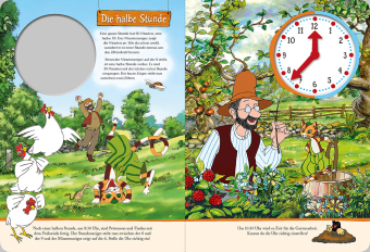 Auf dem Bauernhof gibt es von morgens bis abends immer viel zu tun und zu entdecken. Kinder ab 4 Jahren erleben mit dem liebenswerten Pettersson und seinem frechen Kater Findus den Tagesablauf und lernen dabei spielerisch den ersten Umgang mit der Uhrzeit. Alle Zeiten können mithilfe von beweglichen Zeigern auf dem Ziffernblatt eingestellt werden.
