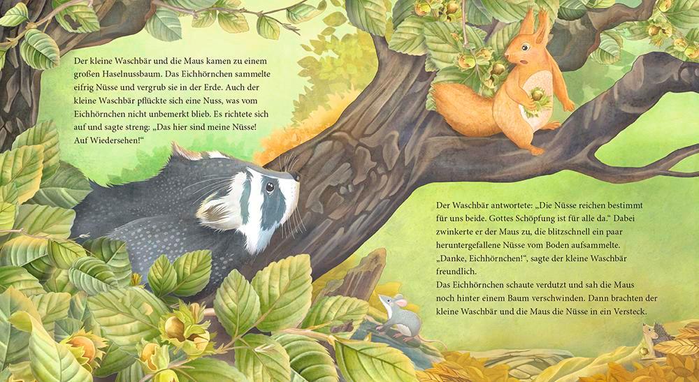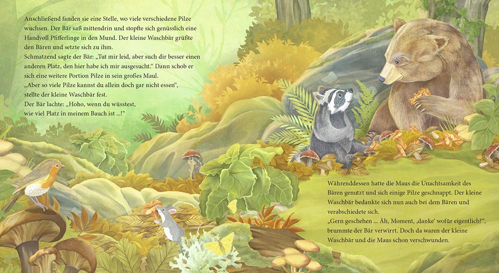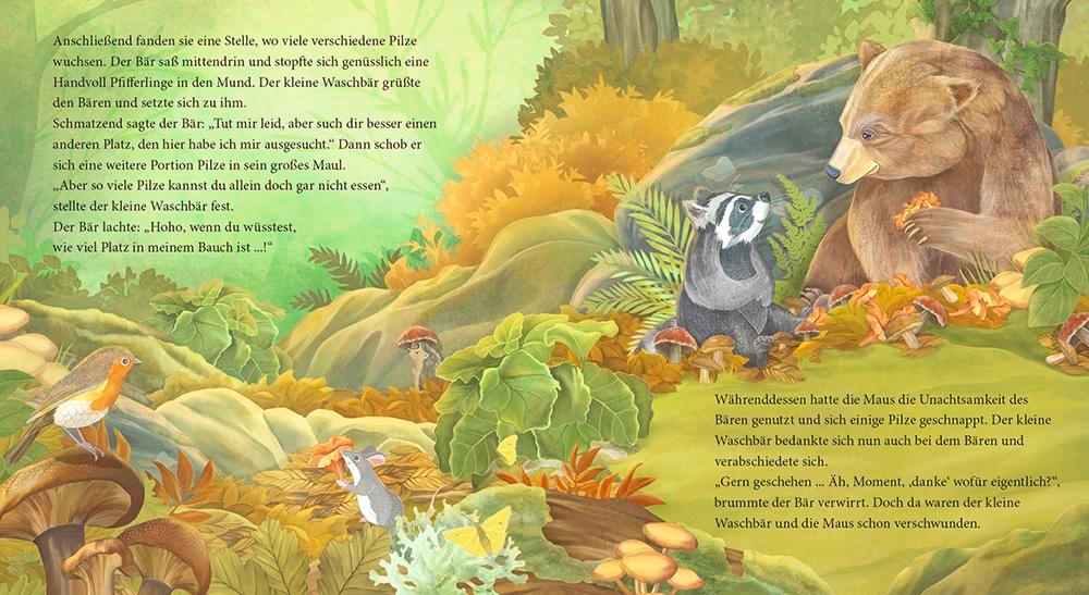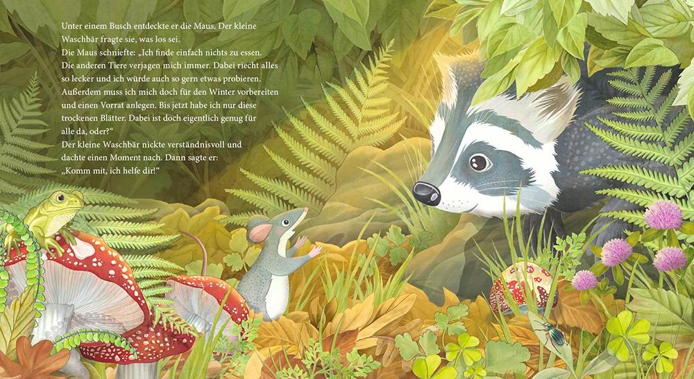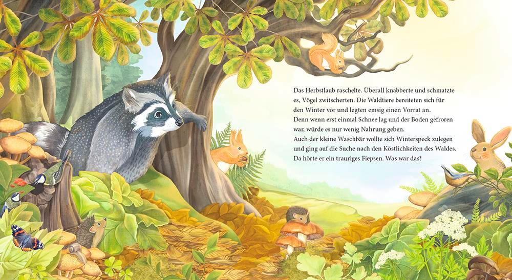 Wie schön es ist, zu teilen - darum geht es in diesem neuen Abenteuer des kleinen Waschbären. Lea Käßmann erzählt in diesem Kinderbuch die Geschichte vom kleinen Waschbären, der einer kleinen Maus hilft, sich einen Wintervorrat anzulegen. Zum Vorlesen für Kinder ab 2 Jahren geeignet, um ihnen spielerisch das Teilen und die Hilfsbereitschaft näher zu bringen. Zauberhaft illustriert von Jana Walczyk. Das Herbstlaub raschelt. Überall knabbert und schmatzt es, Vögel zwitschern. Die Waldtiere bereiten sich für den Winter vor und legen sich emsig einen Vorrat an. Denn wenn erst einmal Schnee lag und der Boden gefroren war, würde es nur wenig Nahrung geben. Auch der kleine Waschbär will sich Winterspeck zulegen und geht auf die Suche nach den Köstlichkeiten des Waldes. Da hört er ein trauriges Fiepsen. Was war das? Unter einem Busch entdeckt er die Maus. Der kleine Waschbär fragt sie, was los sei. Die Maus schnieft: »Ich finde einfach nichts zu essen. Die anderen Tiere verjagen mich immer. Dabei riecht alles so lecker und ich würde auch so gern etwas von dem, was sich die anderen holen, probieren. Außerdem muss ich mich doch für den Winter vorbereiten und einen Vorrat anlegen. Bis jetzt habe ich nur diese trockenen Blätter. Dabei ist doch eigentlich genug für alle da, oder?« Der kleine Waschbär nickt verständnisvoll und denkt einen Moment nach. Dann sagt er: »Komm mit, ich helfe dir!« Und die beiden machen sich auf den Weg zu den verborgenen Futterplätzen im Wald ... Der dritte Band der erfolgreichen Kinderbuch-Reihe mit dem kleinen Waschbär und seinen Freunden, die das Teilen lernen.