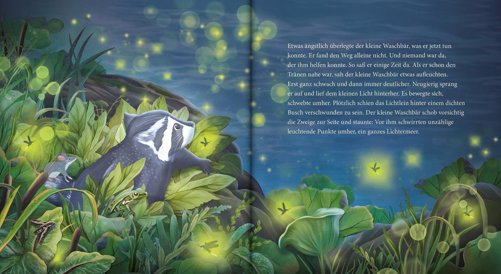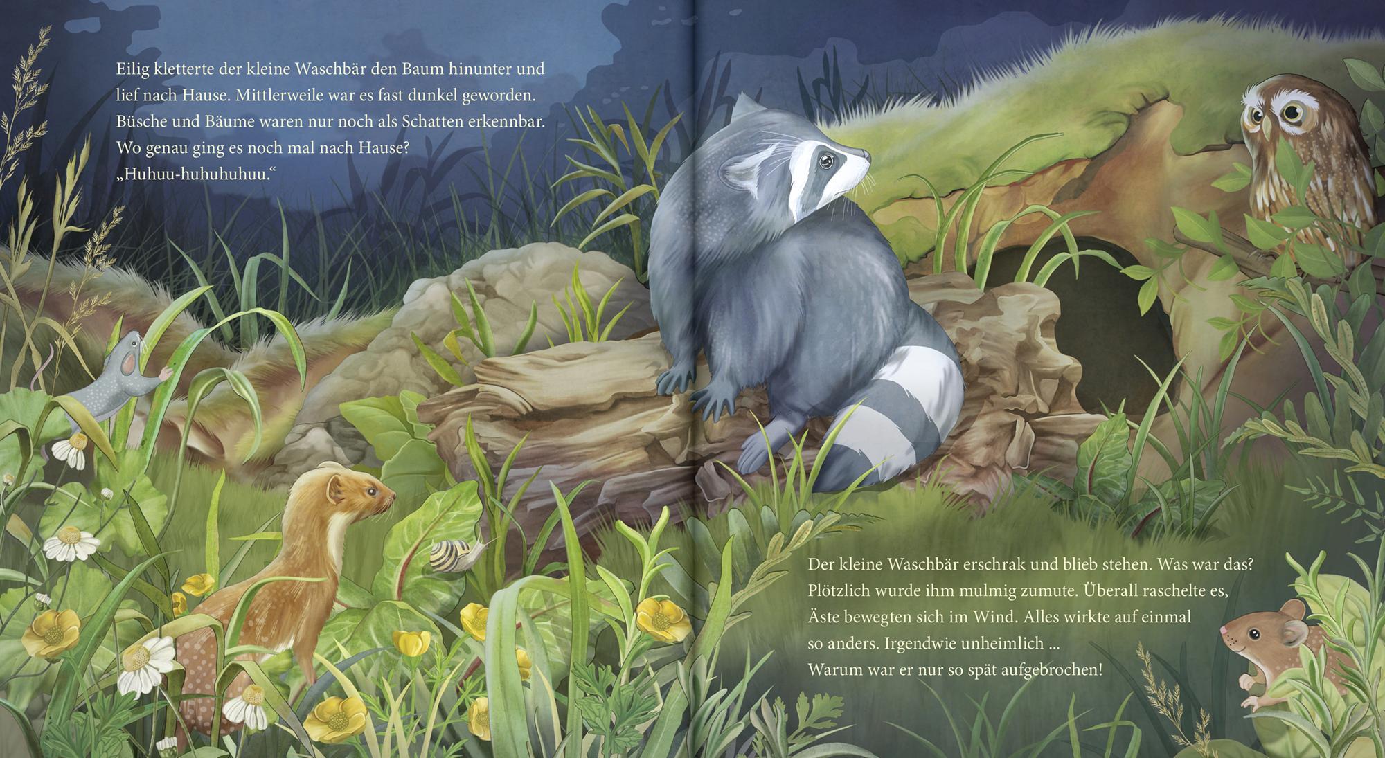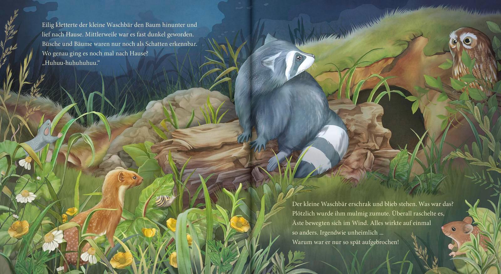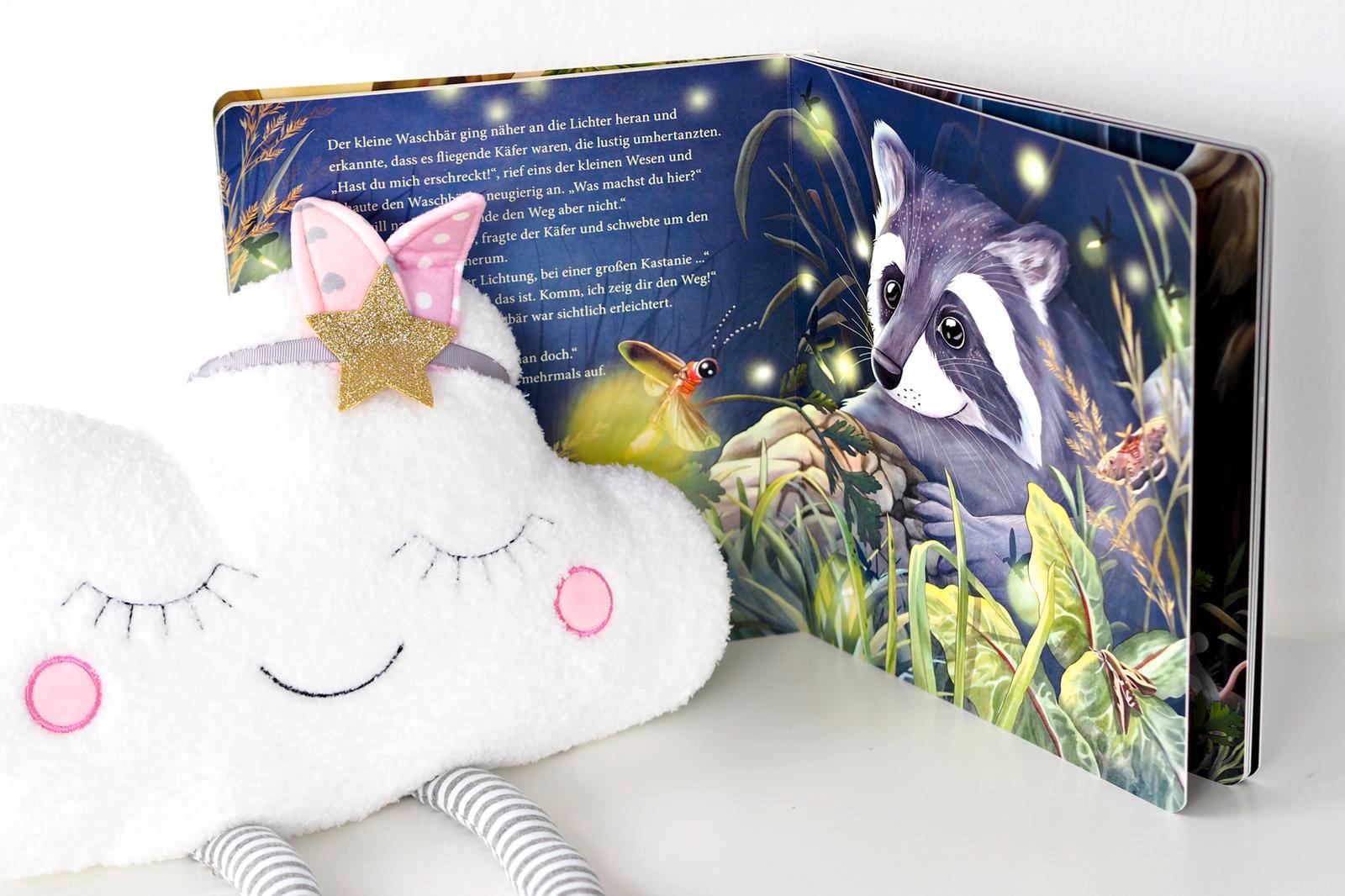 Eine wunderschön illustrierte Einschlafgeschichte für Kinder ab 2 Jahren: Beim Verstecken-Spielen mit seinem Freund, dem Eichhörnchen, bemerkt der kleine Waschbär gar nicht, dass es schon dunkel wird. Mutter Amsel ermahnt die beiden: "Ihr solltet jetzt besser nachhause gehen. Eure Eltern fragen sich bestimmt, wo ihr bleibt." Eilig machen sich die beiden Freunde getrennt voneinander auf den Heimweg.Weil er kaum mehr etwas sieht und es überall im Wald raschelt, wird dem kleinen Waschbären plötzlich mulmig zumute. Wo lang ging es nochmal nach Hause?Ängstlich und traurig, weil niemand da ist, der ihm helfen könnte, bemerkt er plötzlich einige Glühwürmchen. Eines davon fragt ihn, was mit ihm los ist und zeigt ihm den Weg zum Waschbär-Bau. Überglücklich schmiegt der kleine Waschbär an seine Mutter. Sie hatte sich schon Sorgen gemacht. Kurz vor dem Schlafengehen befürchtet der kleine Waschbär, dass er schlecht träumen könnte - es war doch so ein unheimlicher Abend. Da erinnert ihn seine Mama daran: "Du brauchst keine Angst zu haben. Denk an das kleine Licht, das dir den Weg nach Hause gezeigt hat. Das Licht ist stärker als jeder Schatten." Und der Baum, der der Waschbär-Familie Schutz gibt: "Der erinnert mich an Gott. Denn auch Gott ist immer da und sorgt für uns", versichert Mama Waschbär ihrem Nachwuchs und stimmt ein Gutenachtlied an.