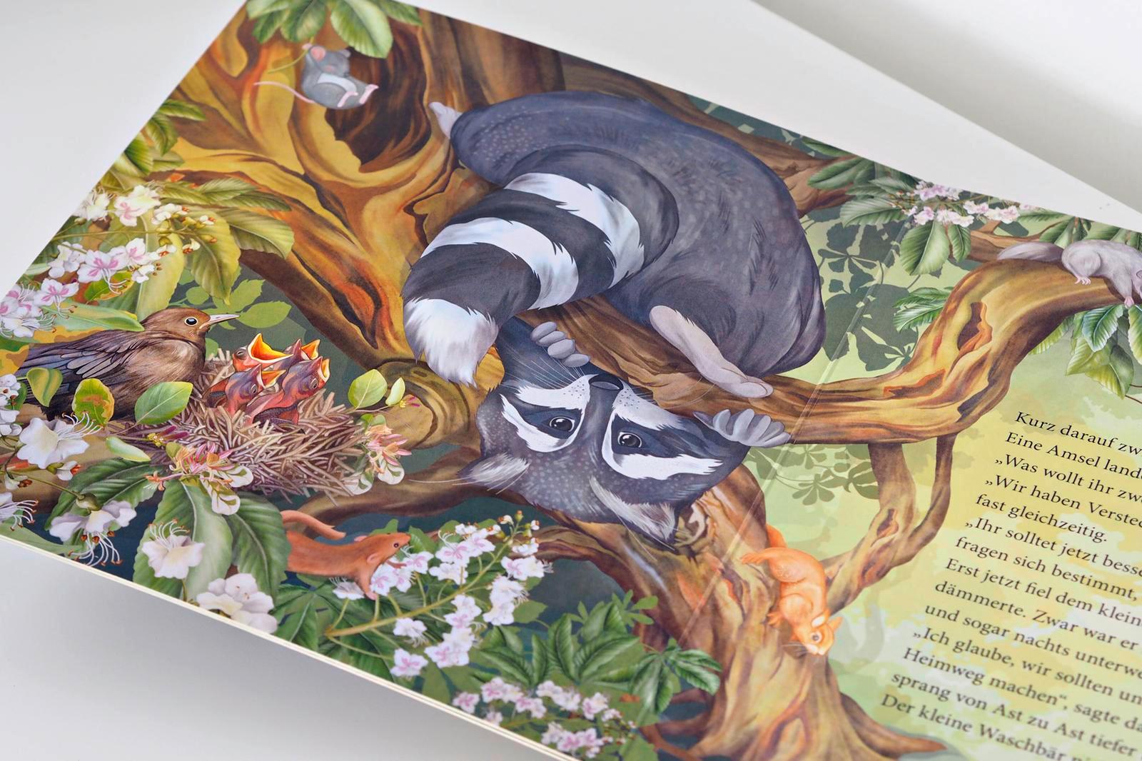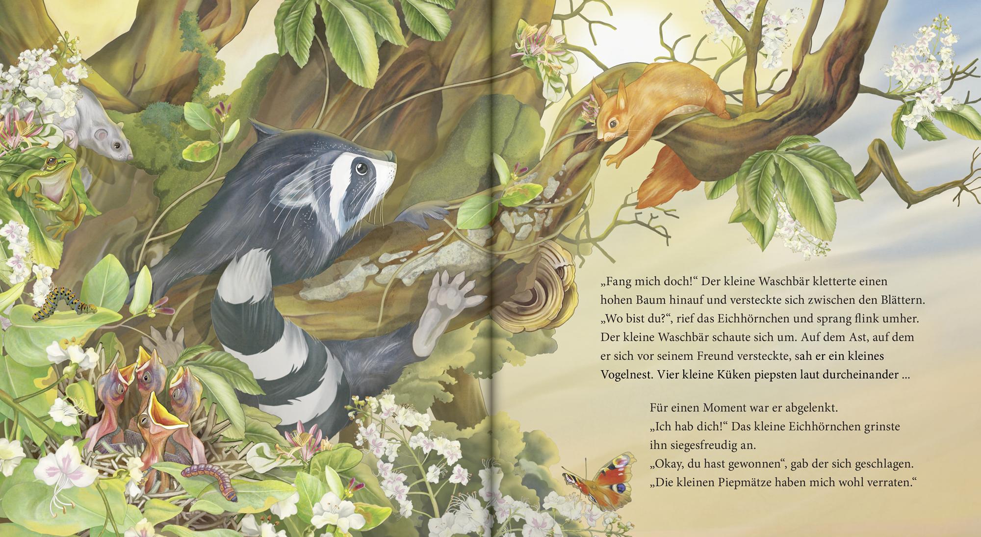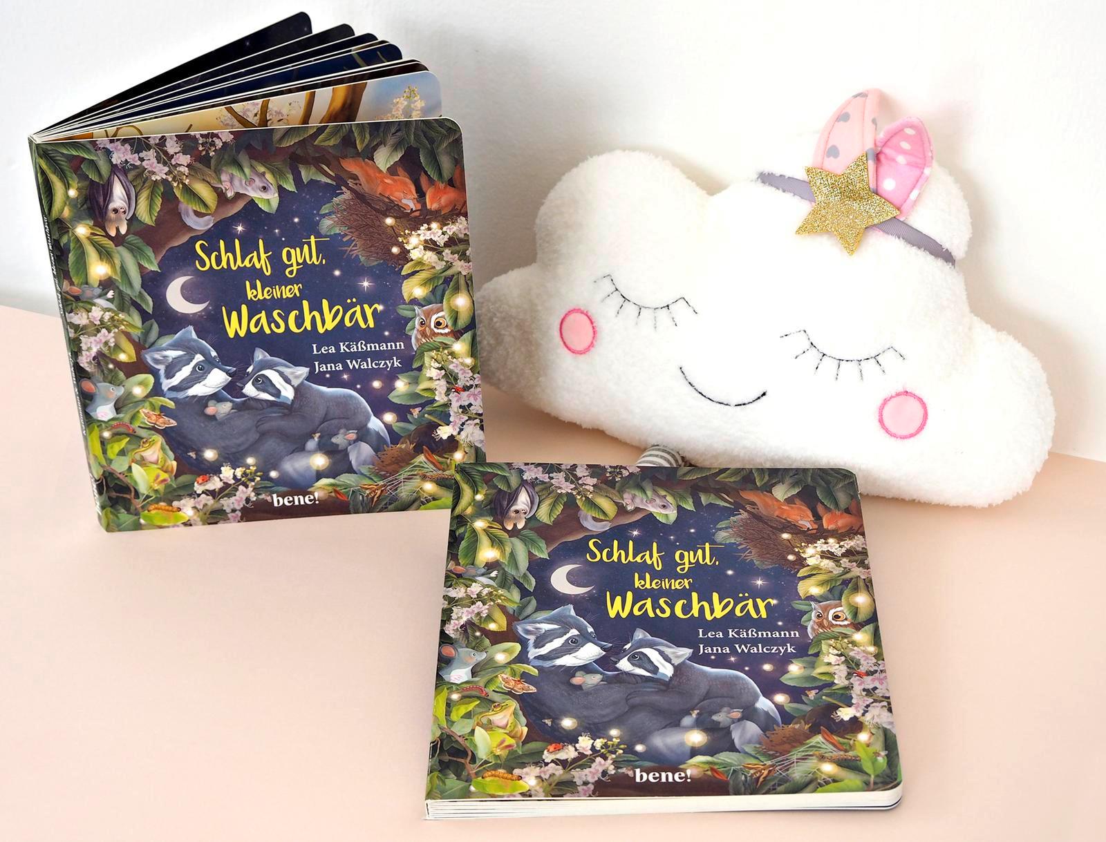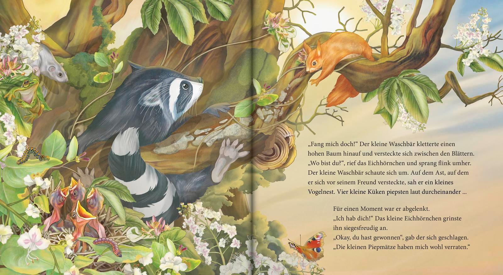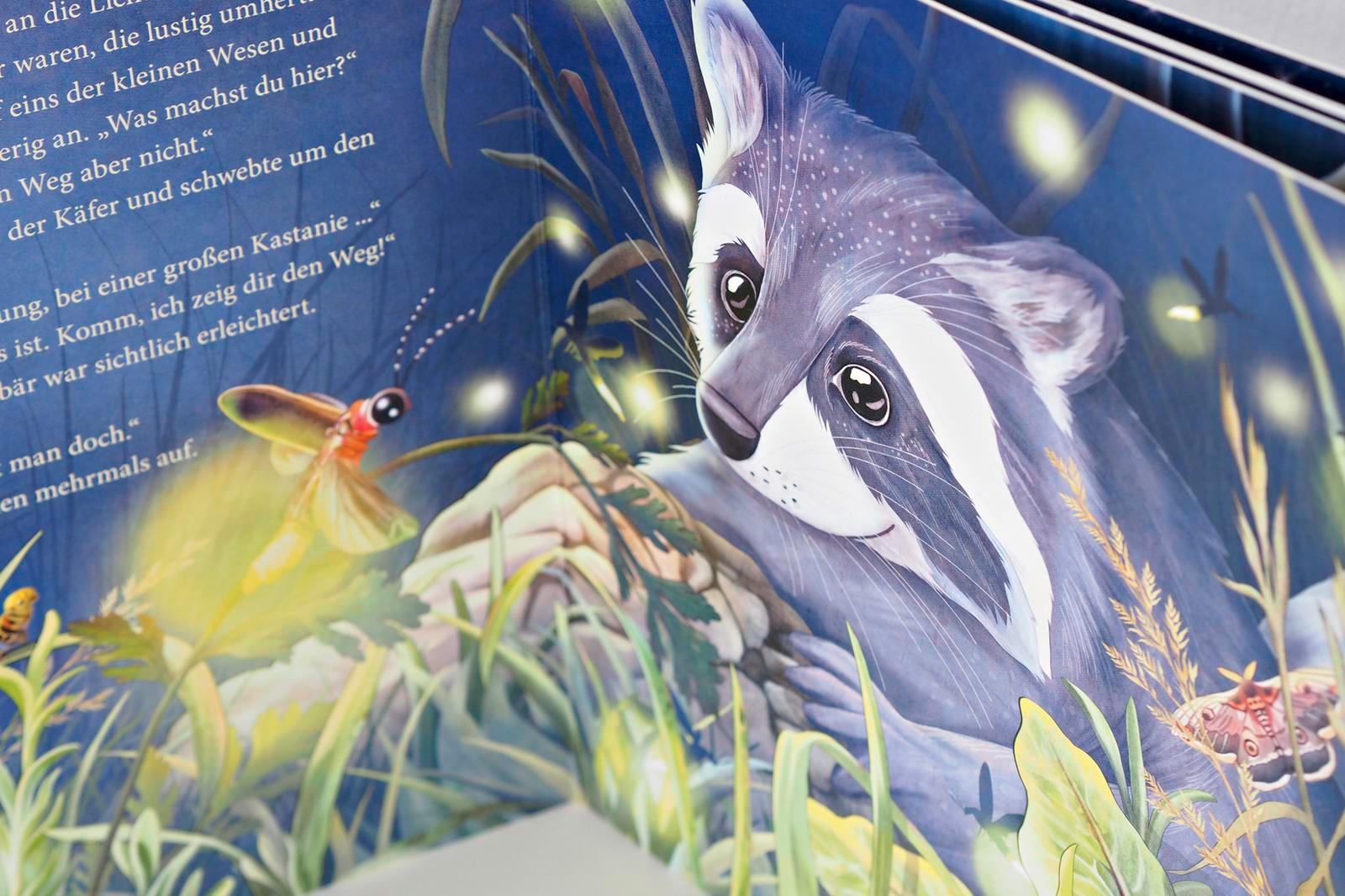 Eine wunderschön illustrierte Einschlafgeschichte für Kinder ab 2 Jahren: Beim Verstecken-Spielen mit seinem Freund, dem Eichhörnchen, bemerkt der kleine Waschbär gar nicht, dass es schon dunkel wird. Mutter Amsel ermahnt die beiden: "Ihr solltet jetzt besser nachhause gehen. Eure Eltern fragen sich bestimmt, wo ihr bleibt." Eilig machen sich die beiden Freunde getrennt voneinander auf den Heimweg.Weil er kaum mehr etwas sieht und es überall im Wald raschelt, wird dem kleinen Waschbären plötzlich mulmig zumute. Wo lang ging es nochmal nach Hause?Ängstlich und traurig, weil niemand da ist, der ihm helfen könnte, bemerkt er plötzlich einige Glühwürmchen. Eines davon fragt ihn, was mit ihm los ist und zeigt ihm den Weg zum Waschbär-Bau. Überglücklich schmiegt der kleine Waschbär an seine Mutter. Sie hatte sich schon Sorgen gemacht. Kurz vor dem Schlafengehen befürchtet der kleine Waschbär, dass er schlecht träumen könnte - es war doch so ein unheimlicher Abend. Da erinnert ihn seine Mama daran: "Du brauchst keine Angst zu haben. Denk an das kleine Licht, das dir den Weg nach Hause gezeigt hat. Das Licht ist stärker als jeder Schatten." Und der Baum, der der Waschbär-Familie Schutz gibt: "Der erinnert mich an Gott. Denn auch Gott ist immer da und sorgt für uns", versichert Mama Waschbär ihrem Nachwuchs und stimmt ein Gutenachtlied an.