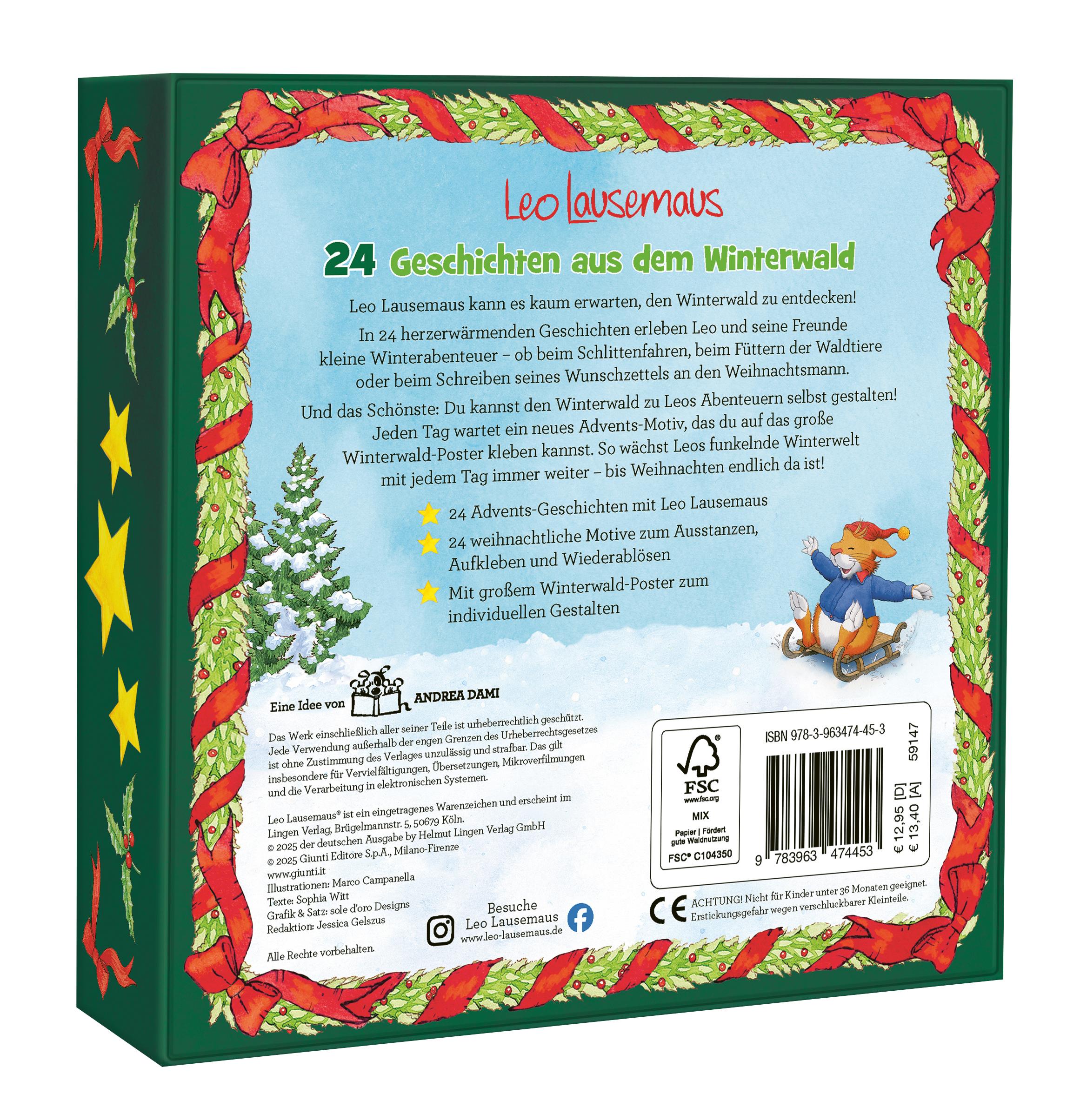 In 24 liebevoll erzählten Geschichten entdeckt Leo Lausemaus gemeinsam mit seinen Freunden den Winterwald - ob beim Schlittenfahren, Waldtiere füttern oder Wunschzettel schreiben. Jeden Tag gibt's ein neues Motiv zum Ausstanzen und Aufkleben: So entsteht nach und nach Leos funkelnder Winterwald auf dem großen Adventsposter. Die hochwertige Schachtel enthält 30 Karten mit Geschichten, ausstanzbare Motive mit Klebepunkten und einem Poster zum Selbstgestalten - ein kreativer Adventskalender zum Vorlesen, Staunen und Mitmachen für Kinder ab 3 Jahren.